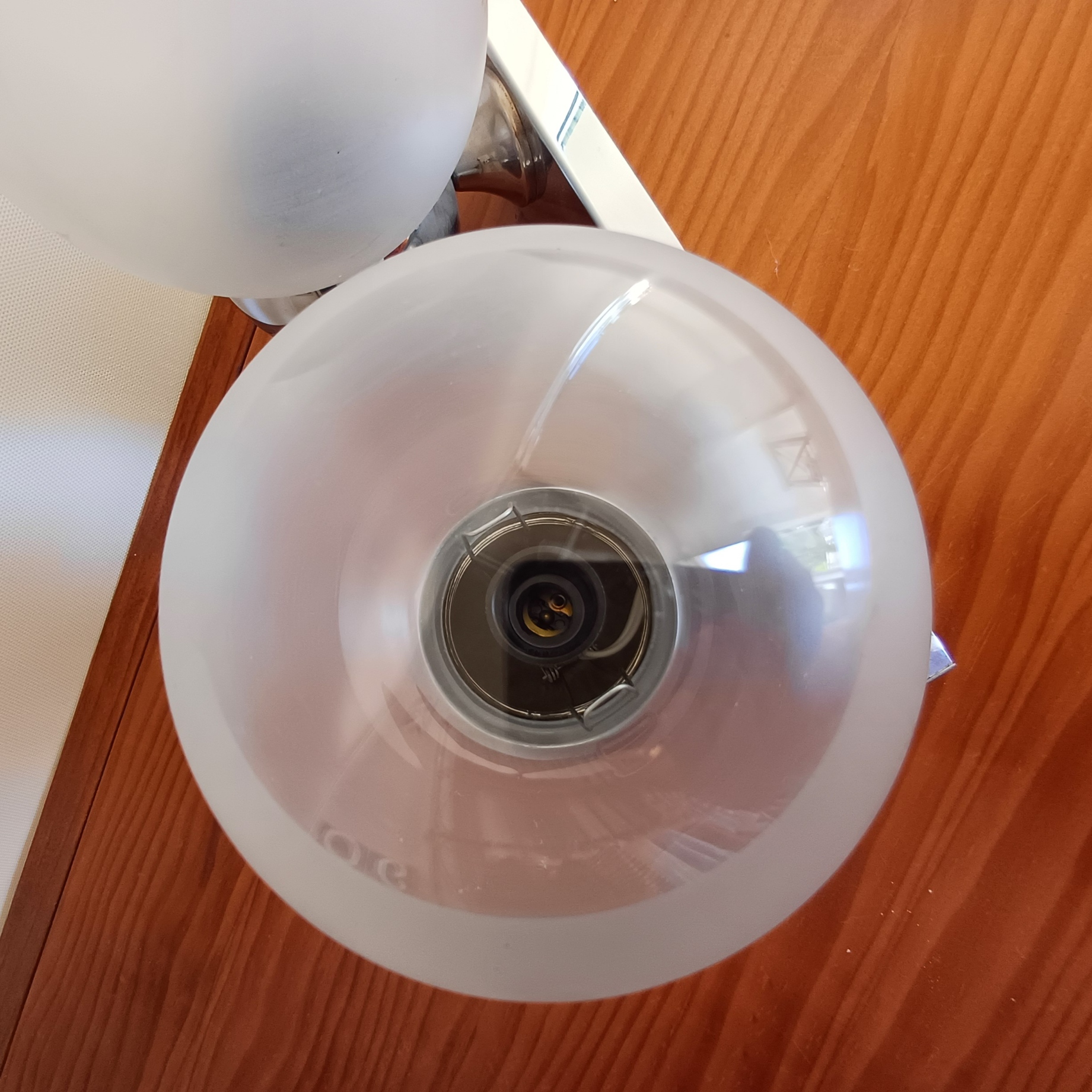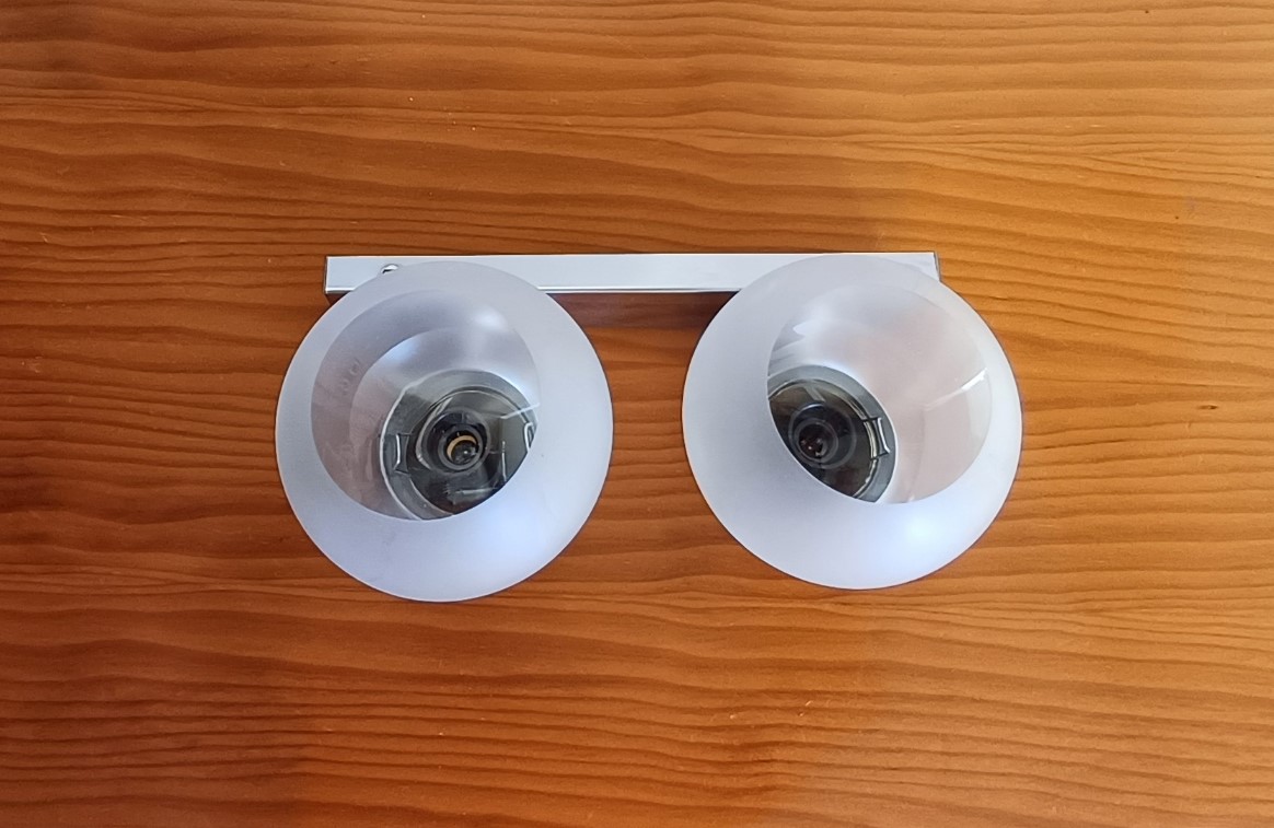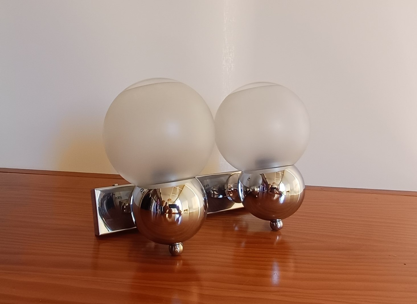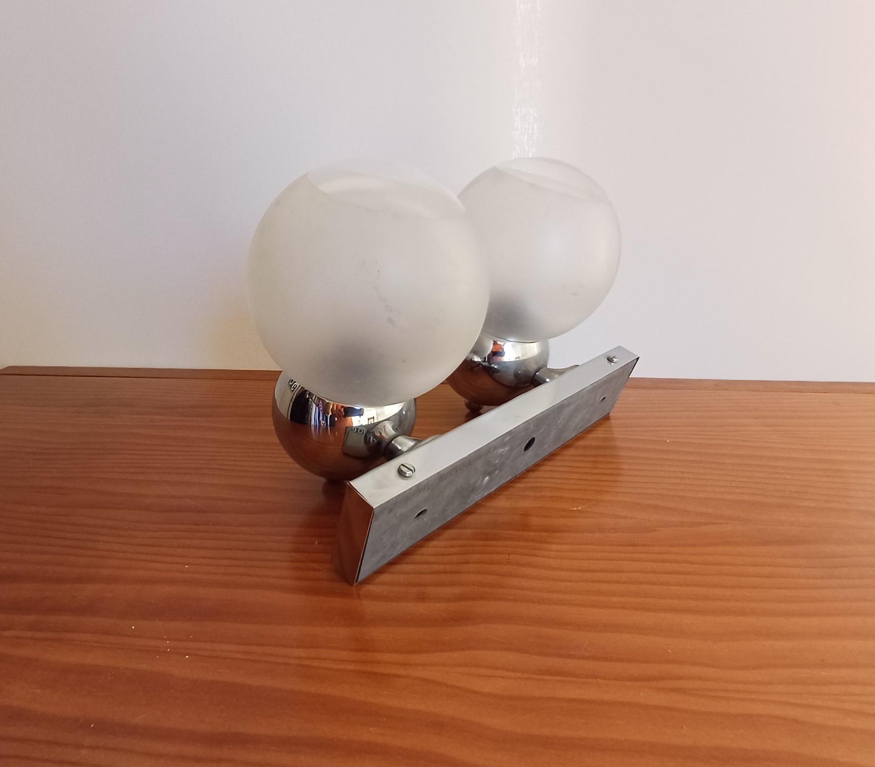 Aplique de pared doble, con base cromada y tulipas de vidrio al ácido.
