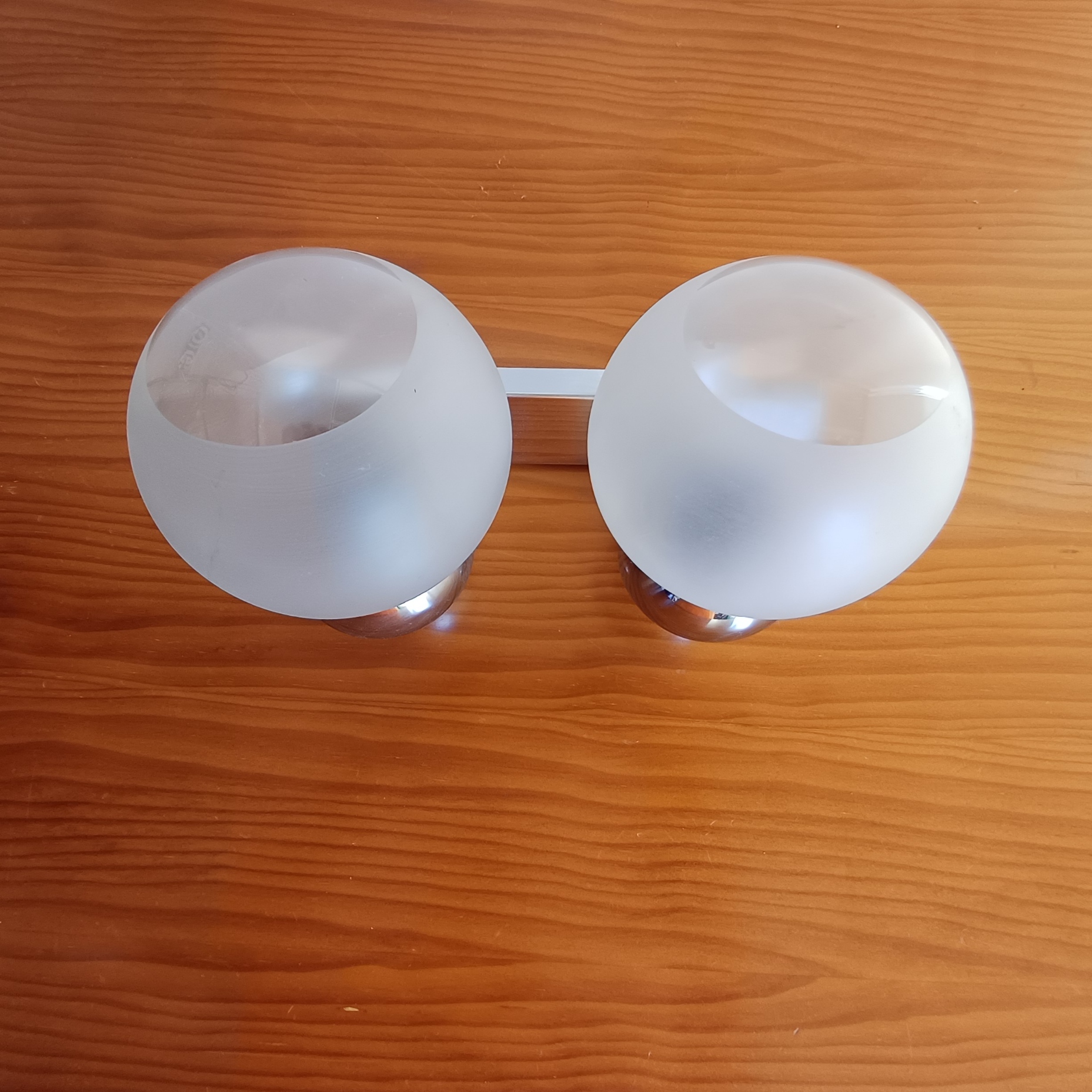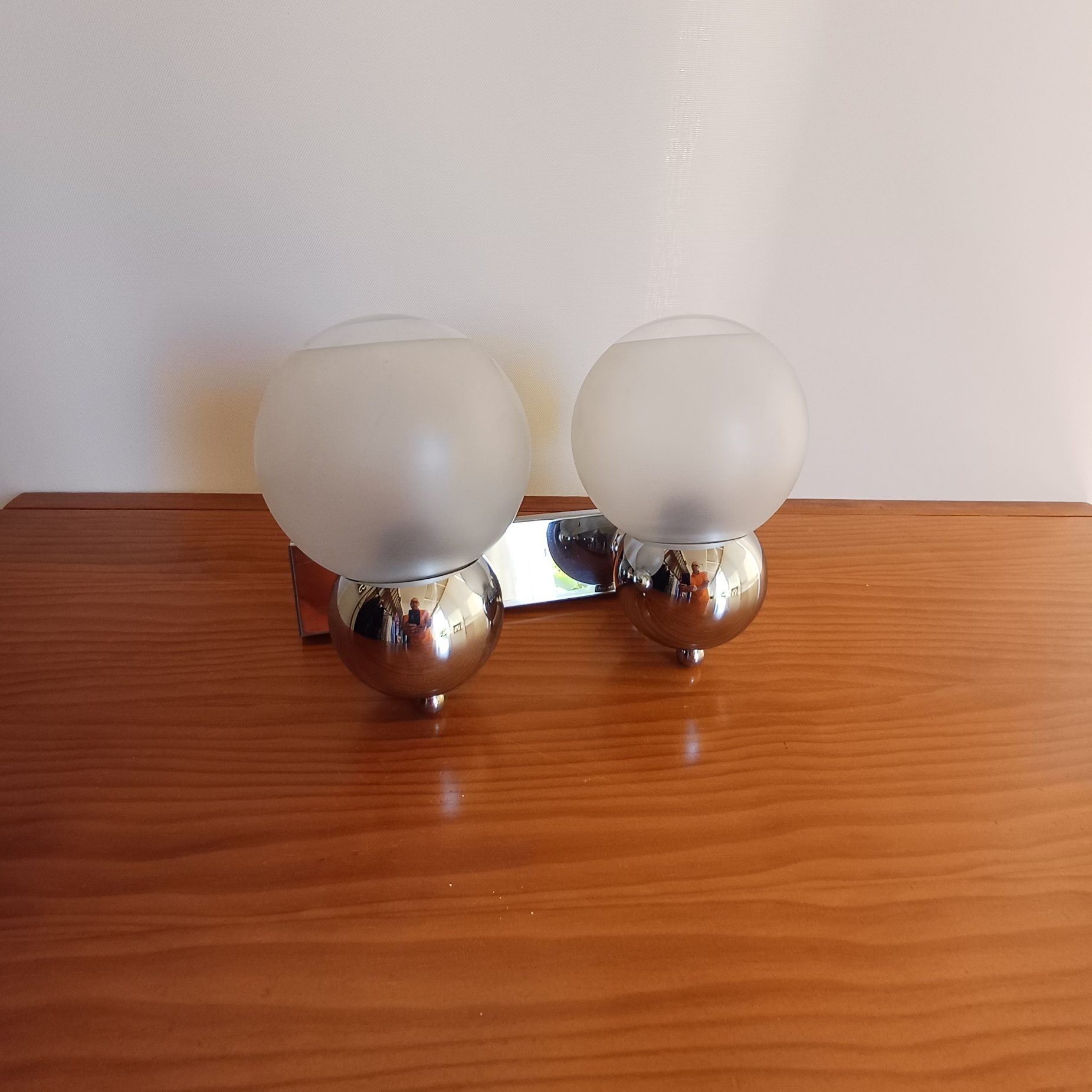 Aplique de pared doble, con base cromada y tulipas de vidrio al ácido. Las partes superiores de cada tulipa son transparentes y el resto es opaco. Ancho del soporte: 26,5 cm.