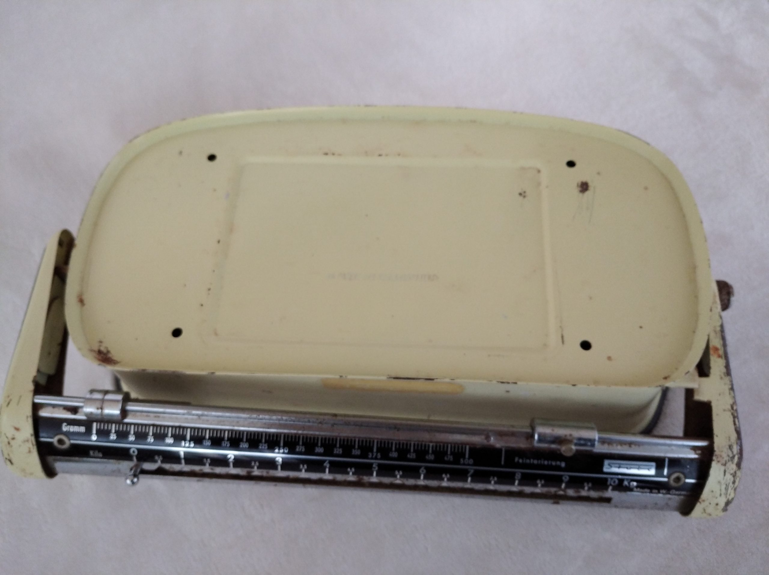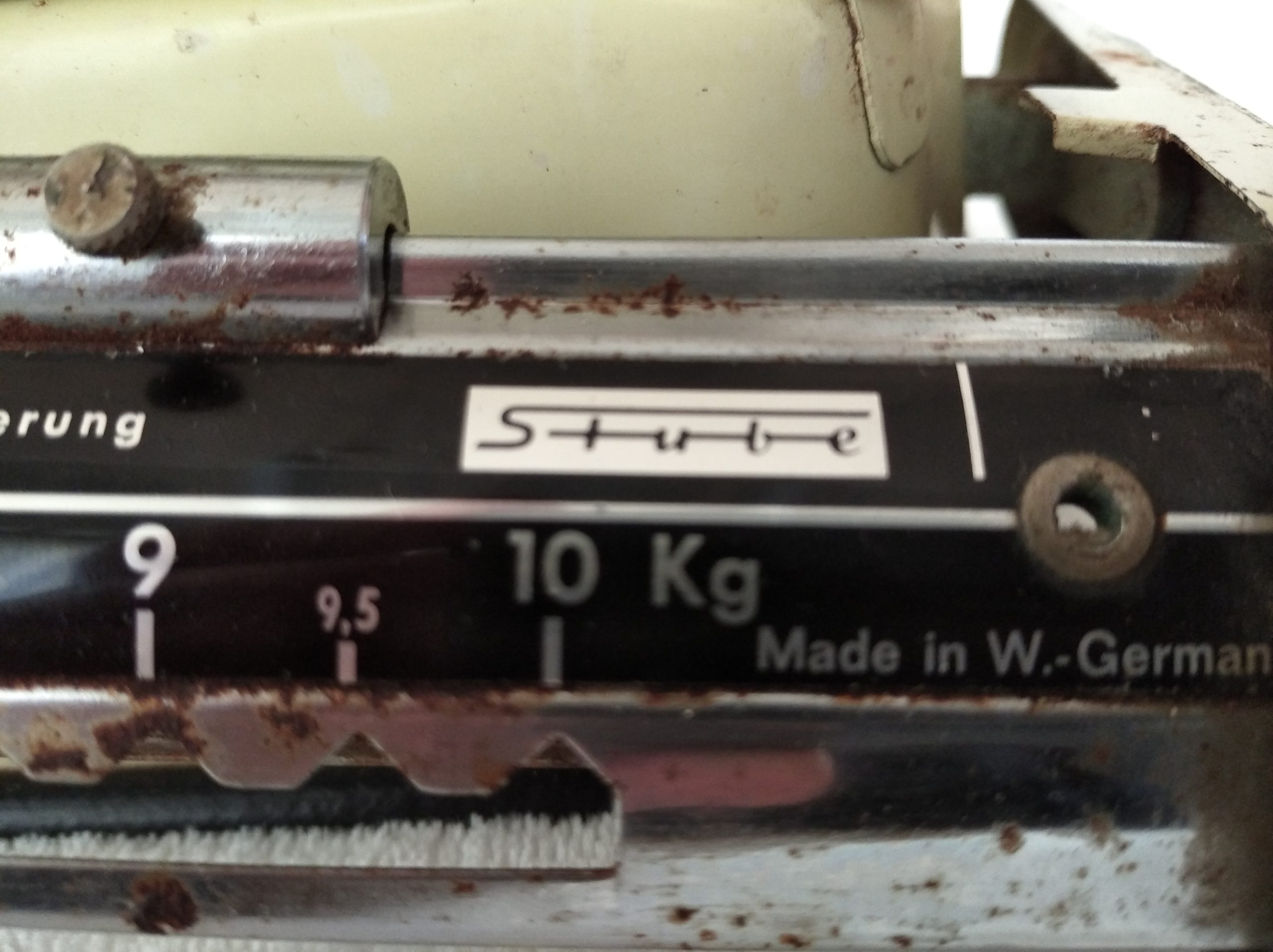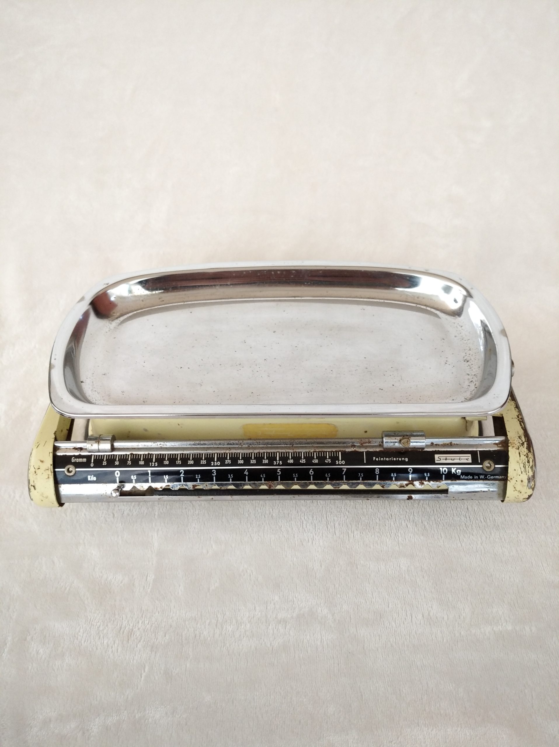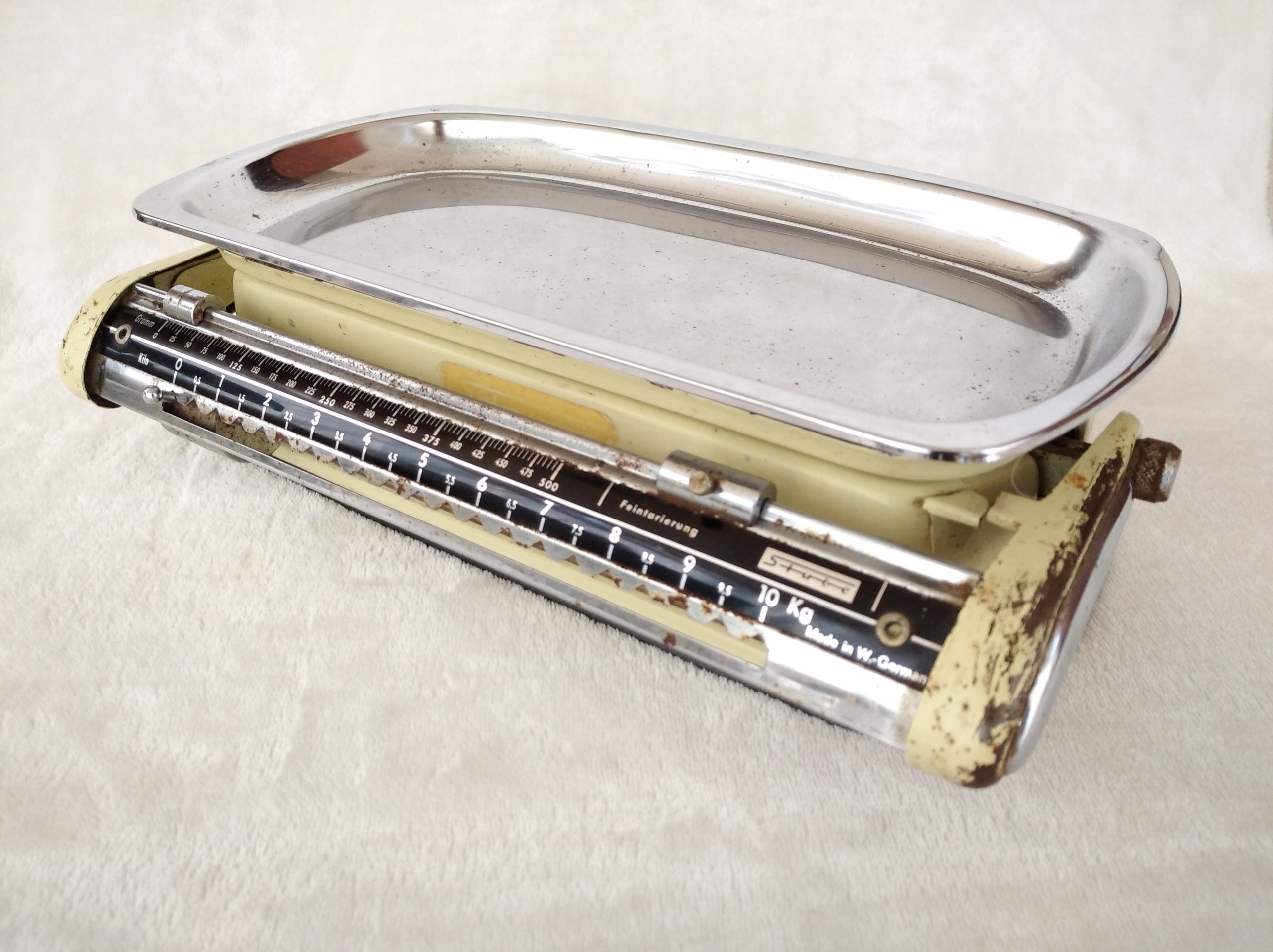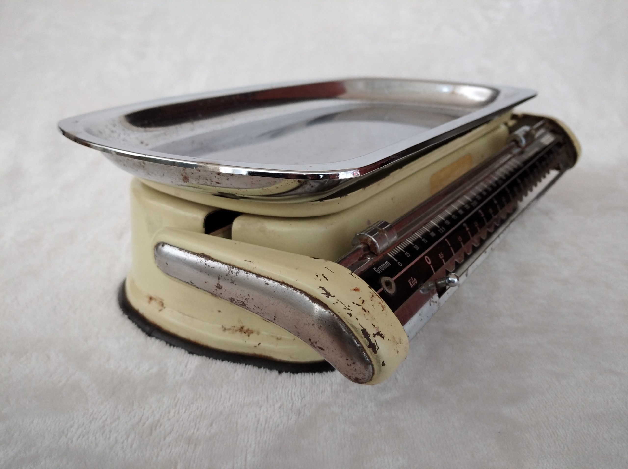Antigua balanza de la marca alemana Stube. Años '70. Color crema. Funciona correctamente, aunque tiene señales del paso del tiempo. Los brazos laterales tienen un embellecedor cromado.