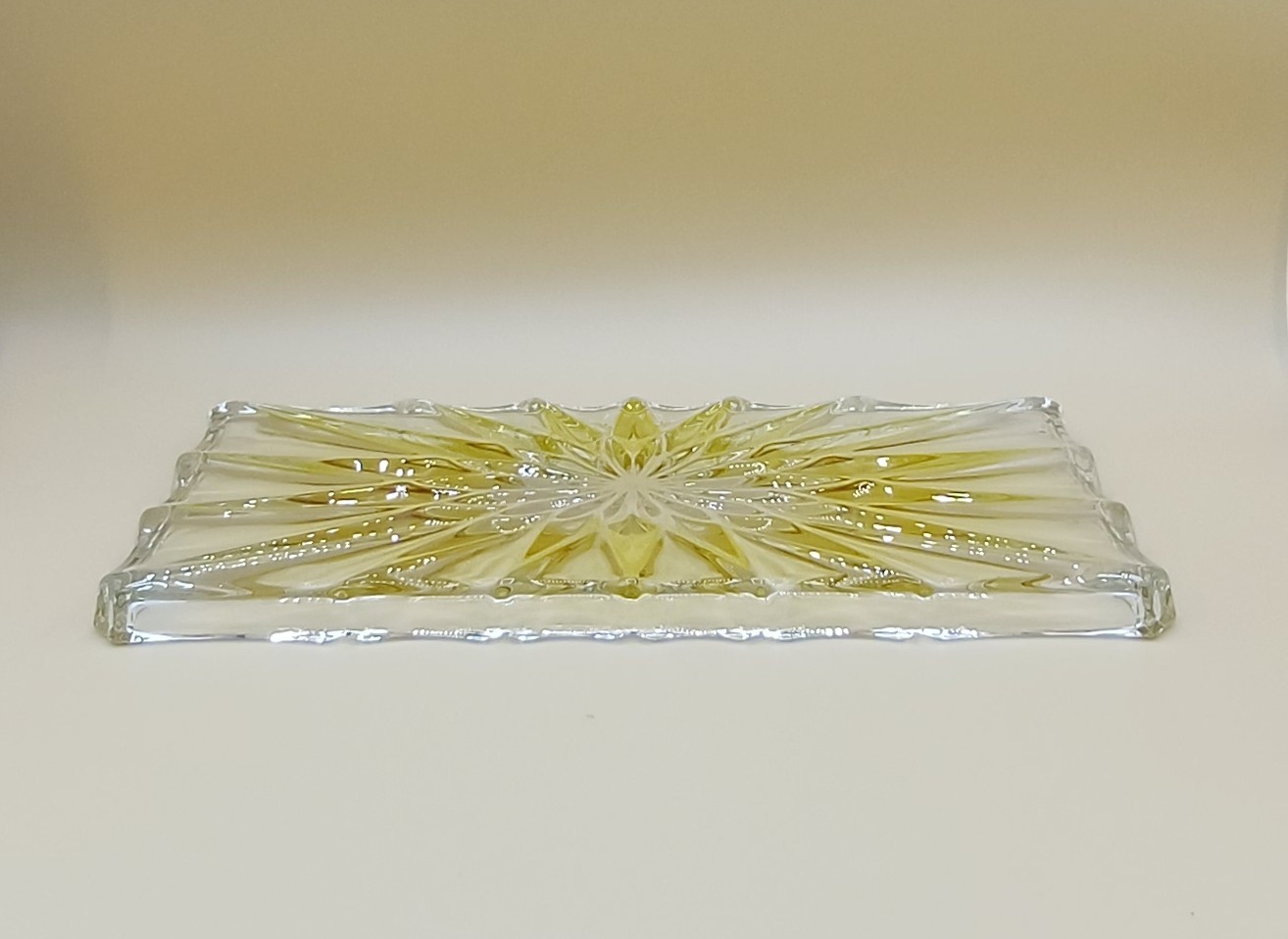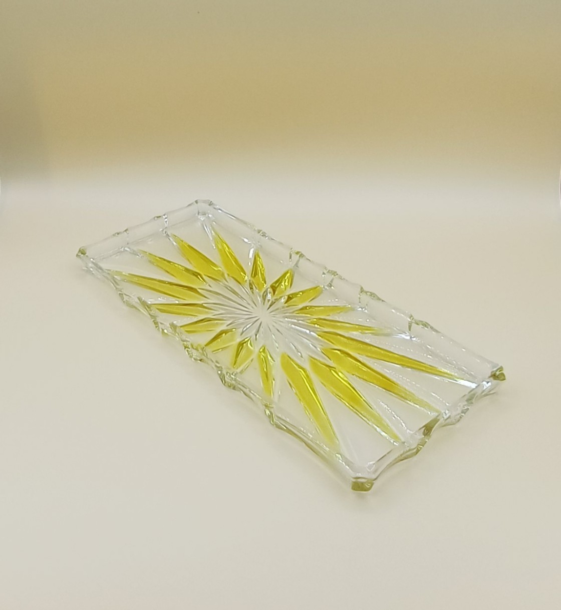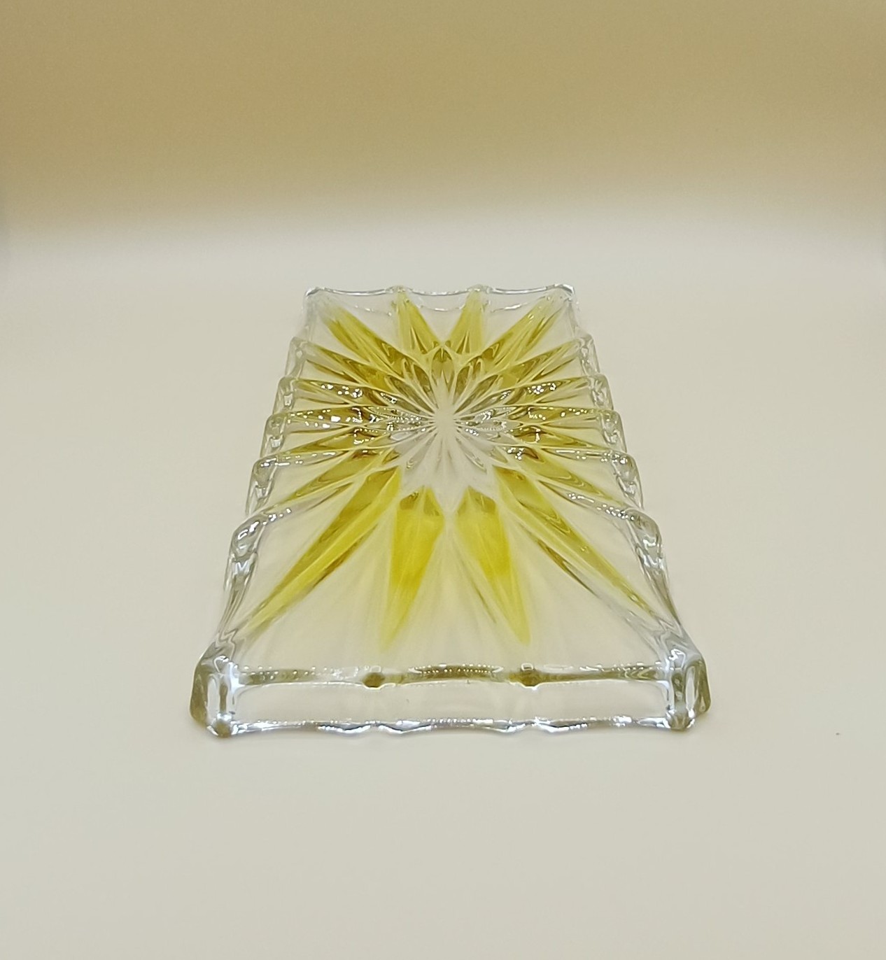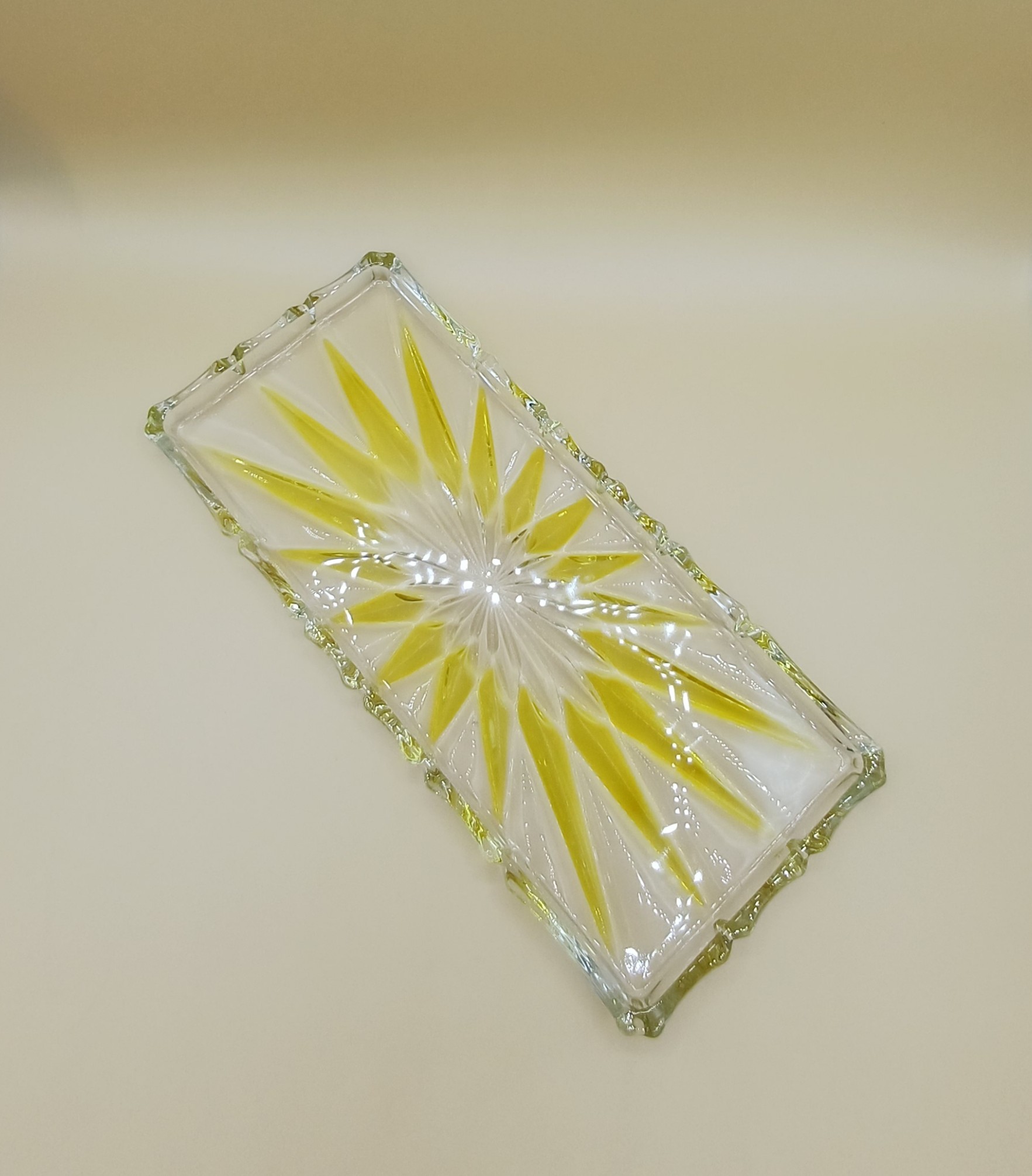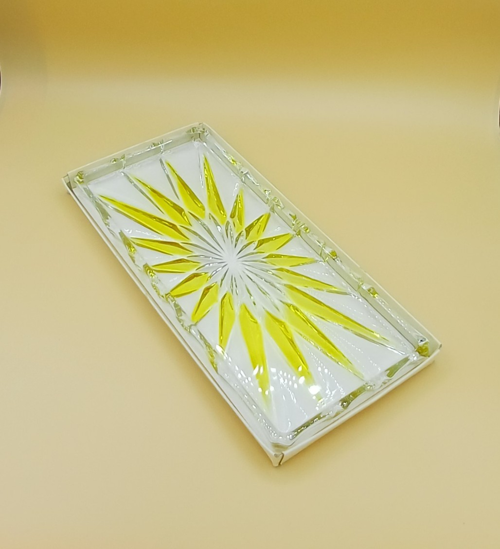 Elegante bandeja rectangular con un diseño estrellado en tonos amarillos. - Material: Cristal. - Color: Transparente y amarillo. Adornos en forma de estrella y en color amarillo. Ribete ondulado. De la prestigiosa marca alemana Walther-Glas. Puede utilizarse para presentar aperitivos o dulces para la merienda o bien para un uso tan distinto como el de vaciabolsillos. Con su caja original. Medidas: 34 cm x 15 cm x 2 cm.