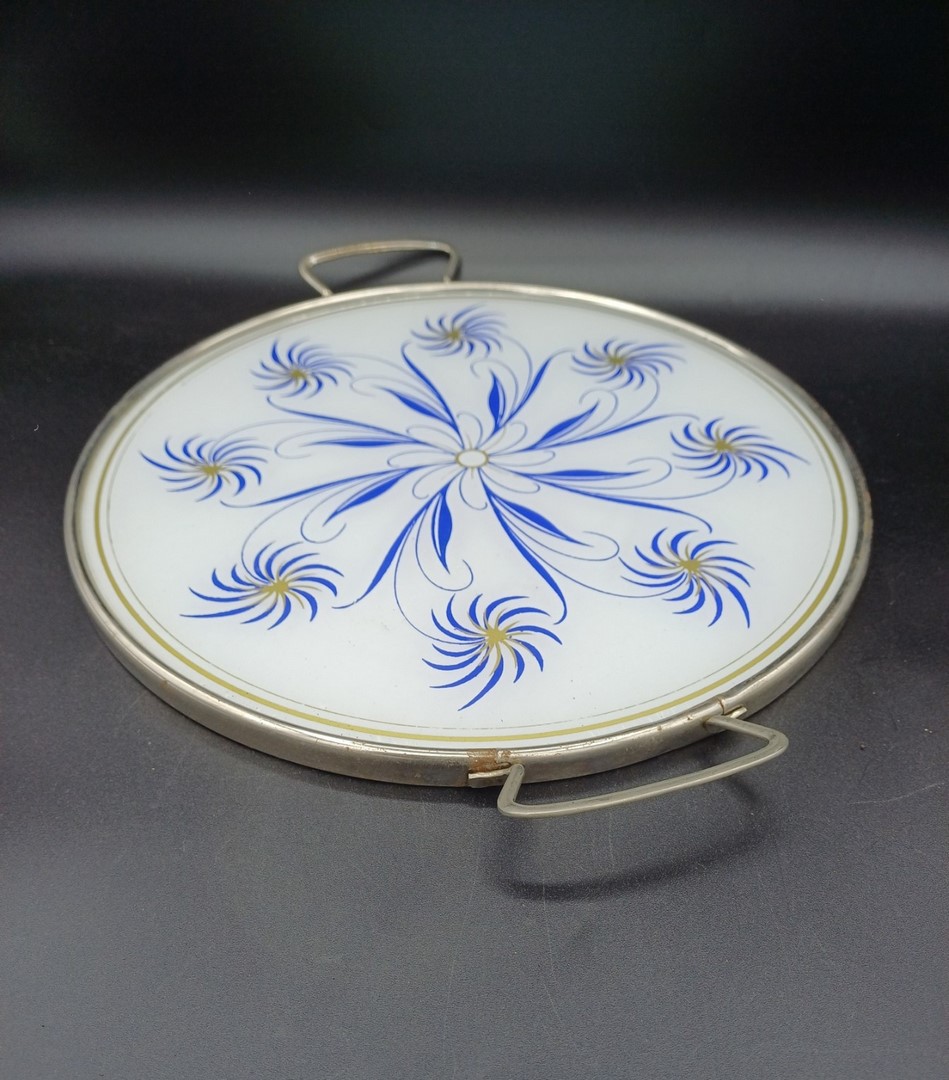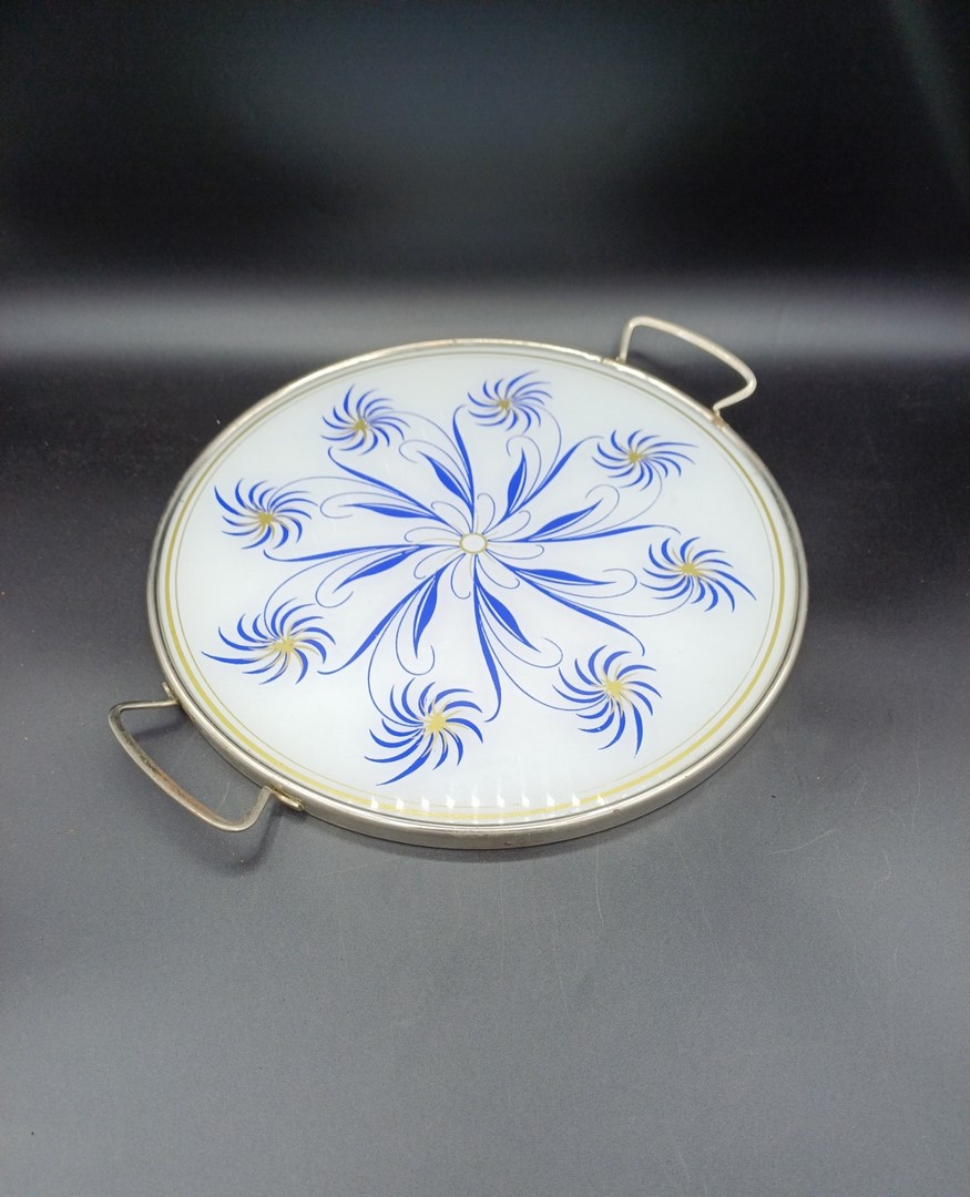 Bandeja de cristal con base y asas de metal. Se puede usar para sacar platitos de tapas o para presentar una tarta. Diámetro: 29 cm. 34,5 cm con las asas.