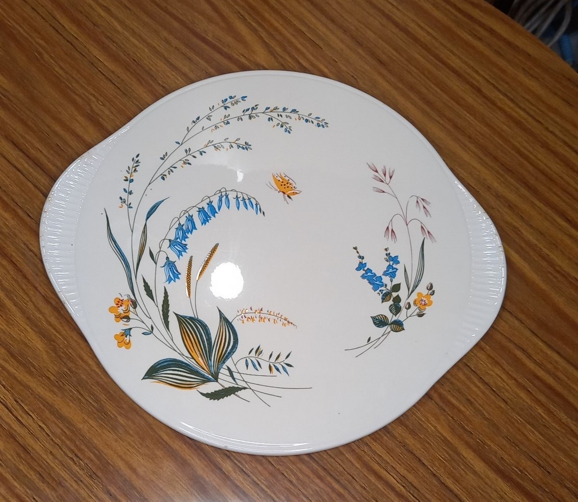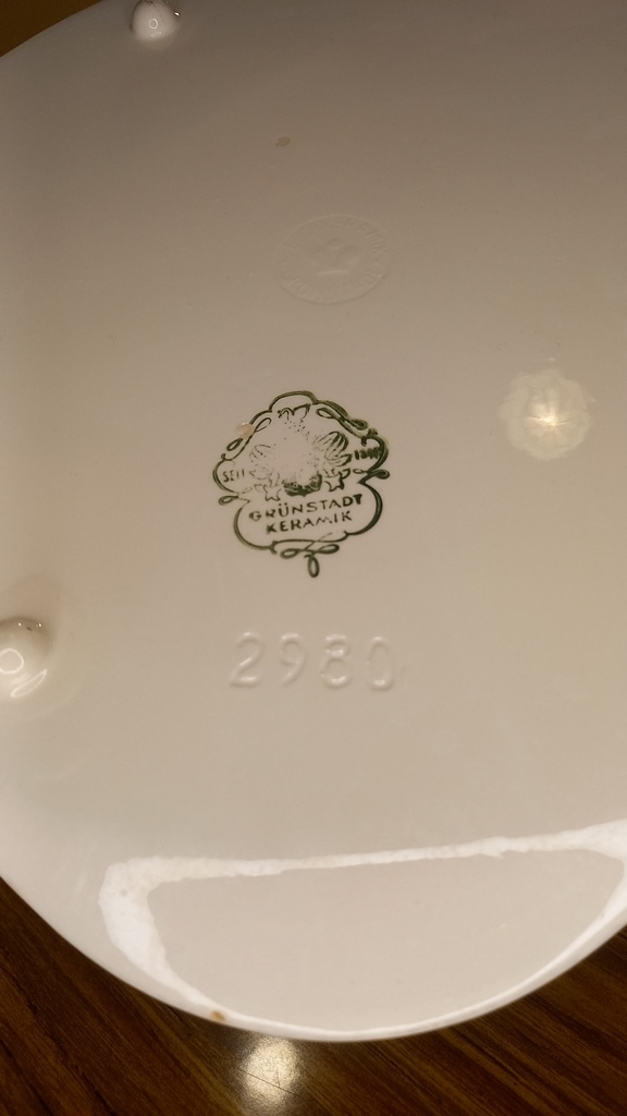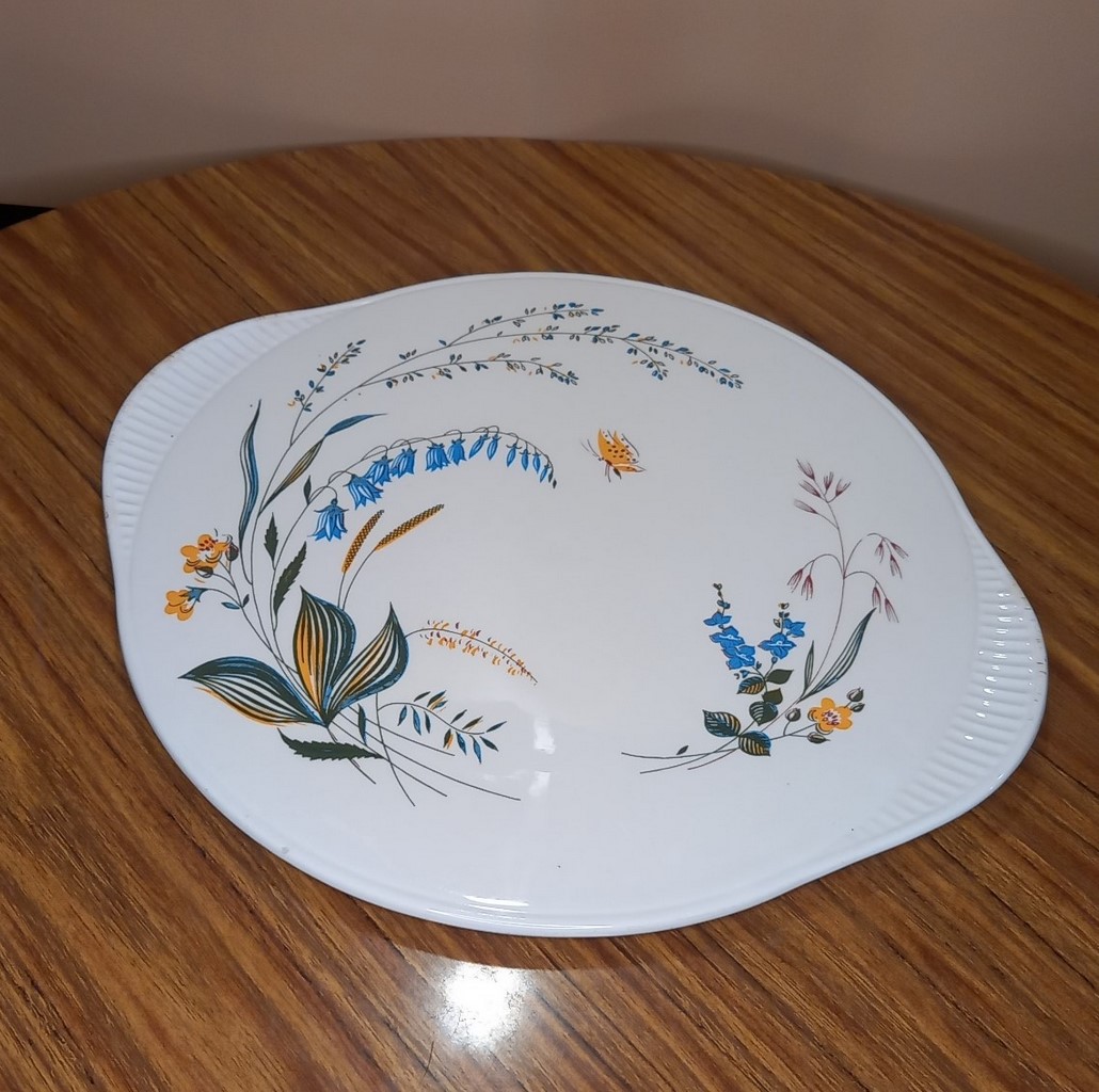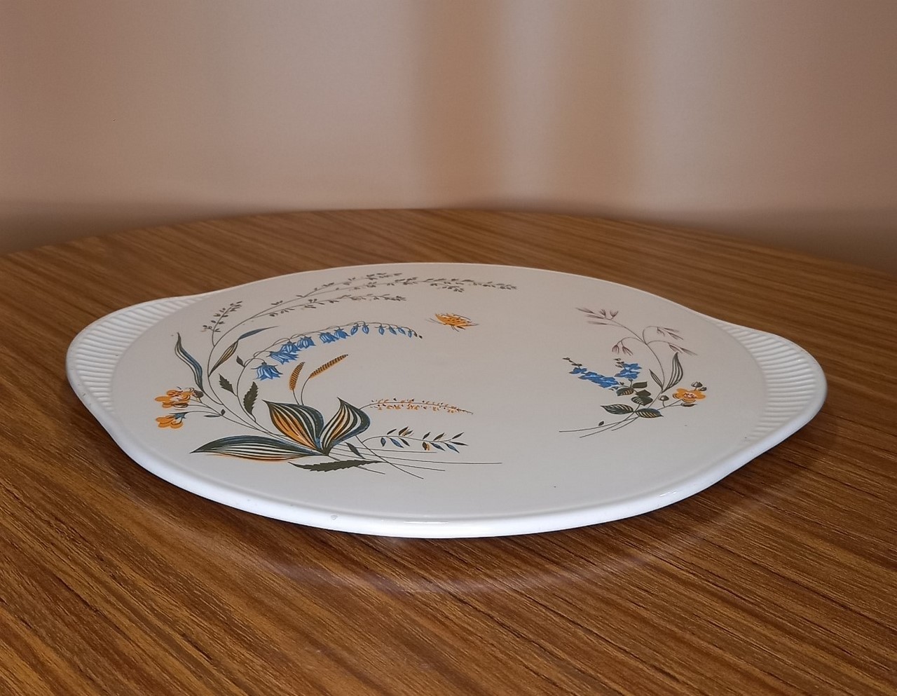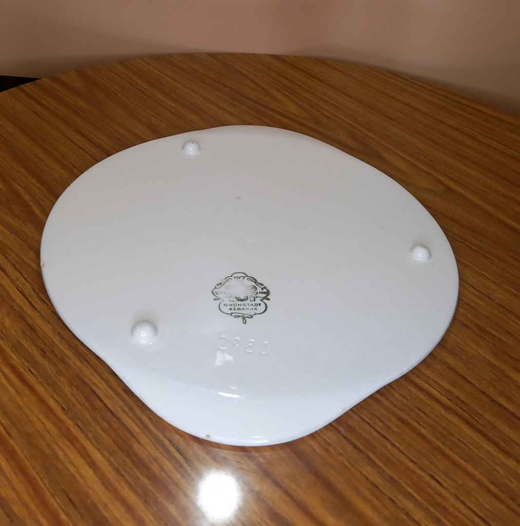 Bandeja plana de cerámica alemana. Blanco roto. Medidas: 31 cm de diámetro. 35 cm por el lado de las asas. 1,2 cm de altura.