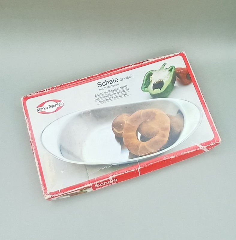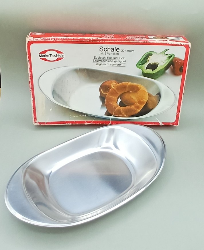 Bandeja/bol de acero inoxidable de la marca alemana Marke Tischfein. Una forma elegante de servir la fruta, la carne, una fritura de pescado o el pan en la mesa. Con su caja original. Medidas: 32 cm x 18 cm.