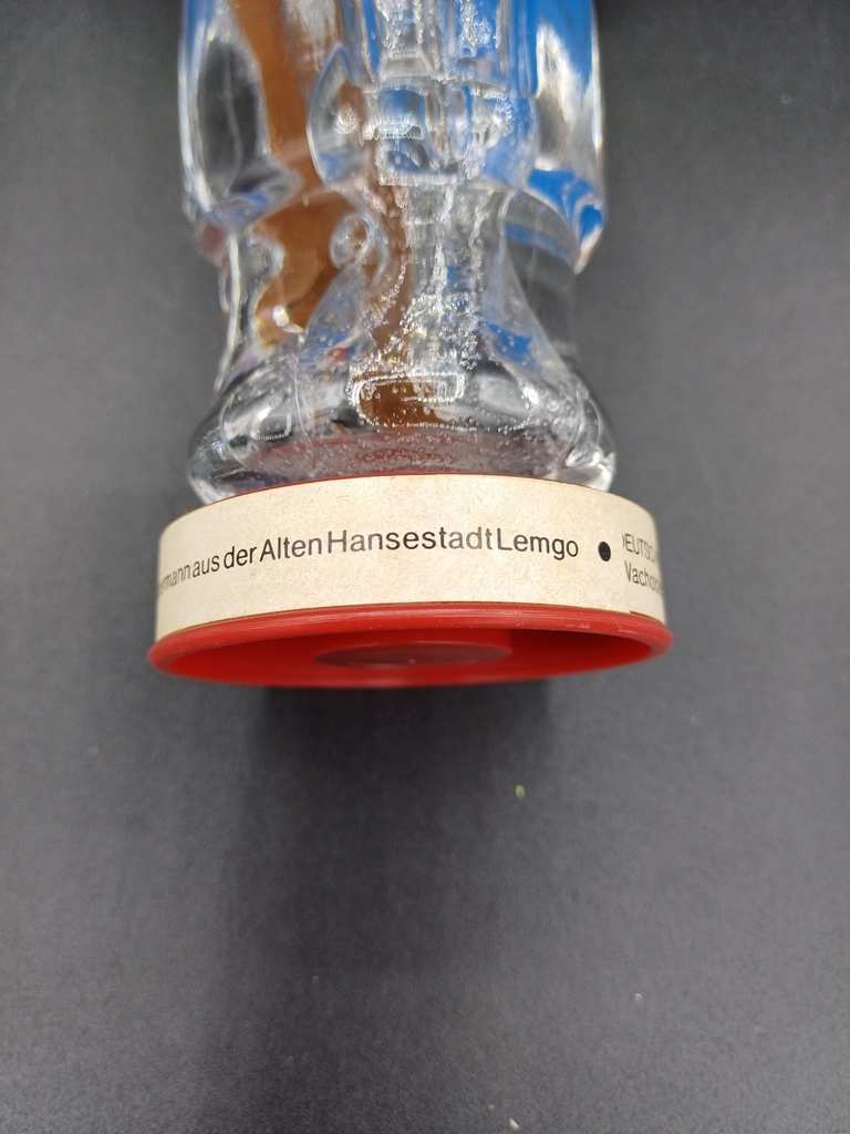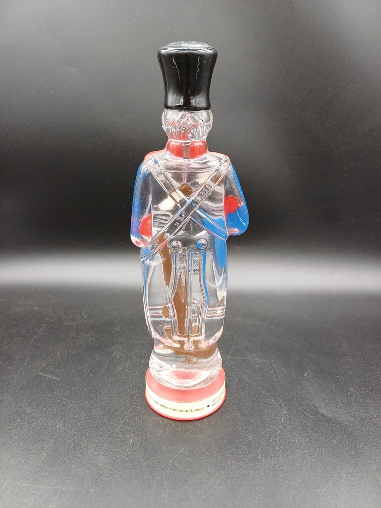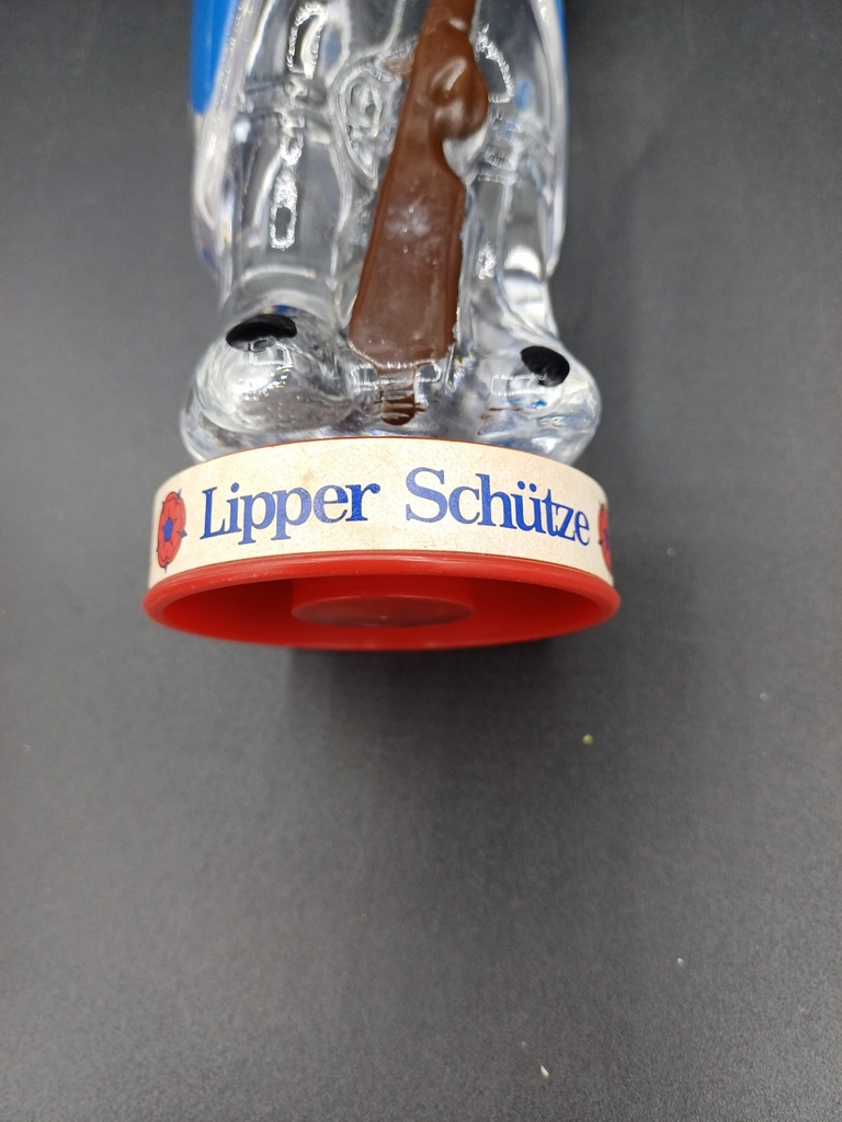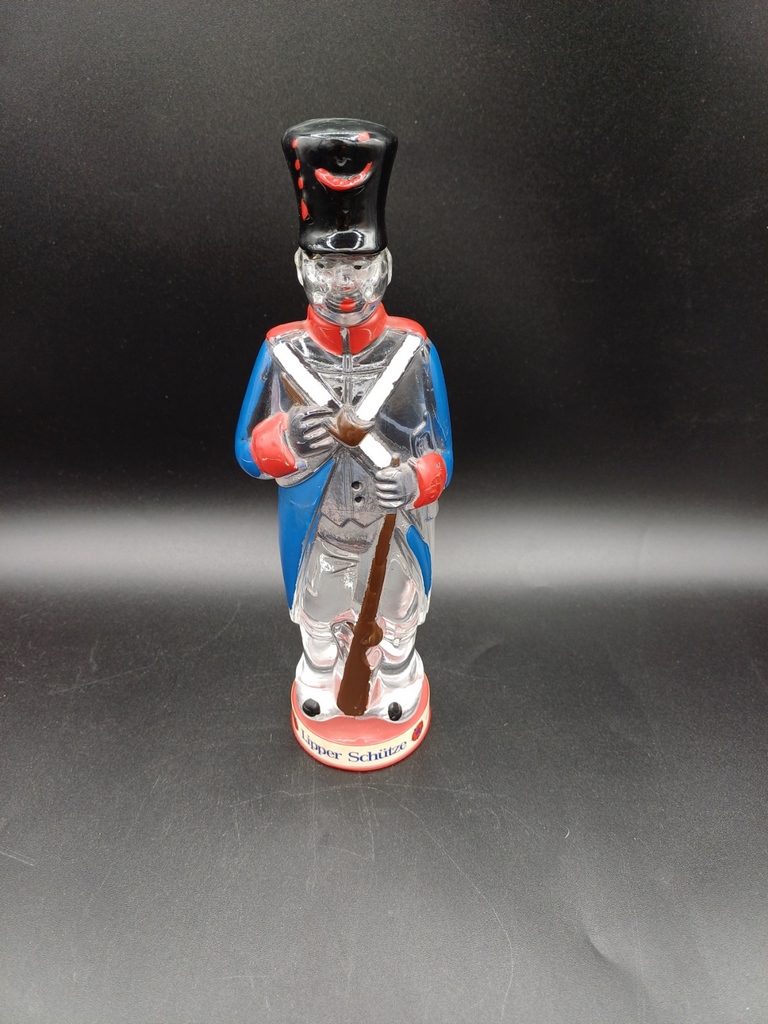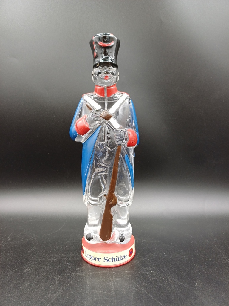 Botella de ginebra Lipper Schütze. Llena. Alemania. Vidrio pintado a mano. La base es el tapón de rosca de la botella. 32 % vol. 0,2 L. Tamaño: 24 cm.