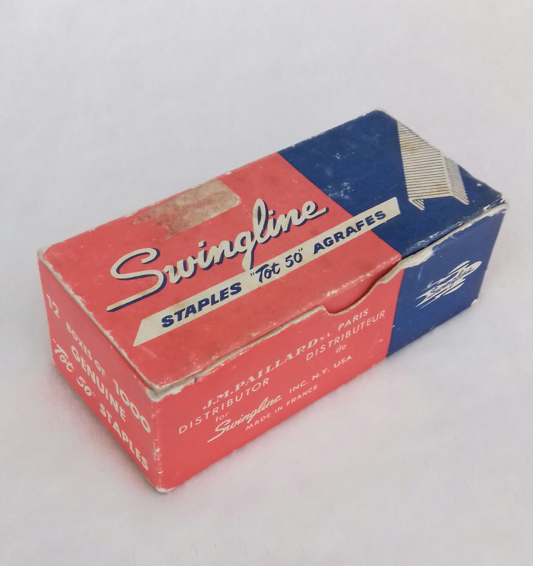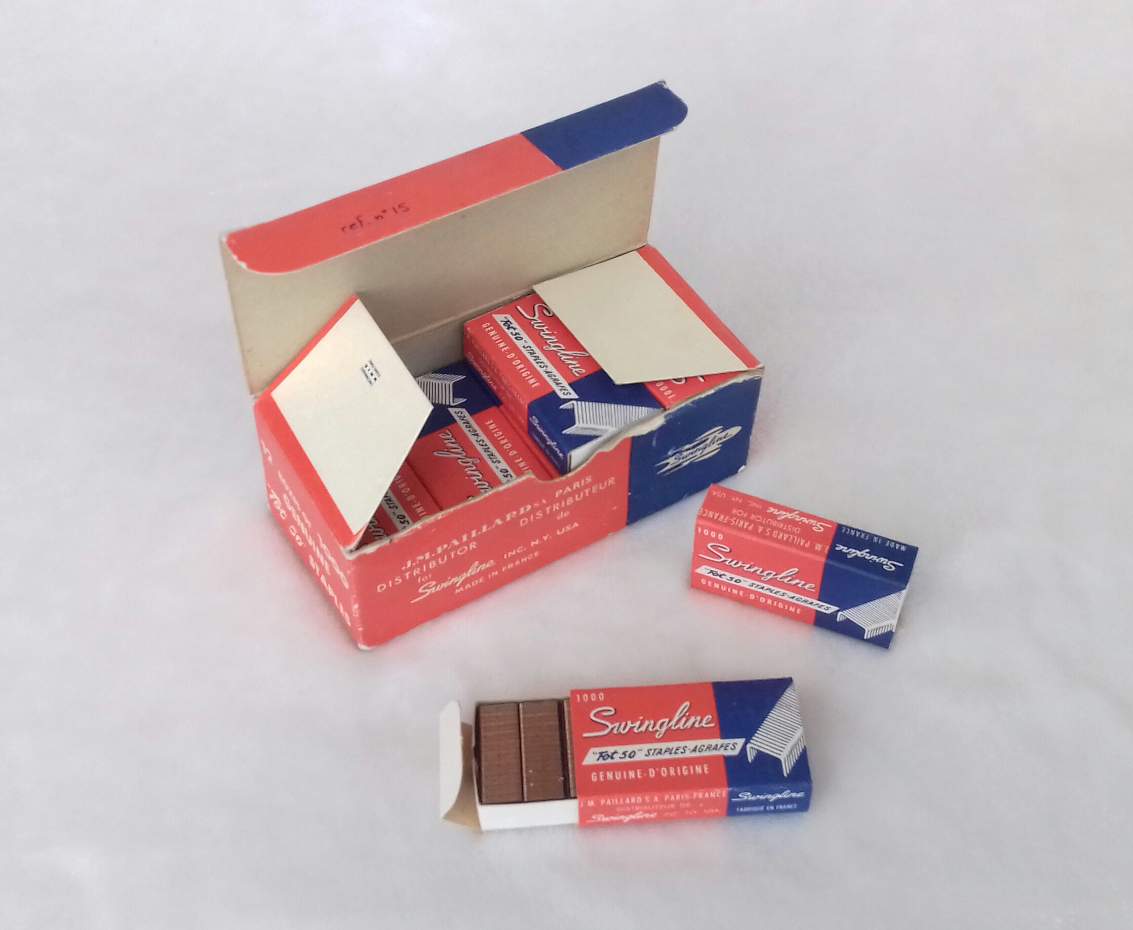 Antigua caja de grapas de la marca 'Swingline'. Está completa, conteniendo 12 cajas pequeñas de 1.000 grapas cada una. En total 12.000 grapas estándar para todo tipo de grapadoras. Fabricadas en Francia. Años '50.'Swingline' es una marca de grapas y grapadoras de Estados Unidos. La empresa se fundó en 1925 en la ciudad de Nueva York, con el nombre de 'Parrot Speed Fastener Company'. No tomó el nombre de Swingline hasta 1956.