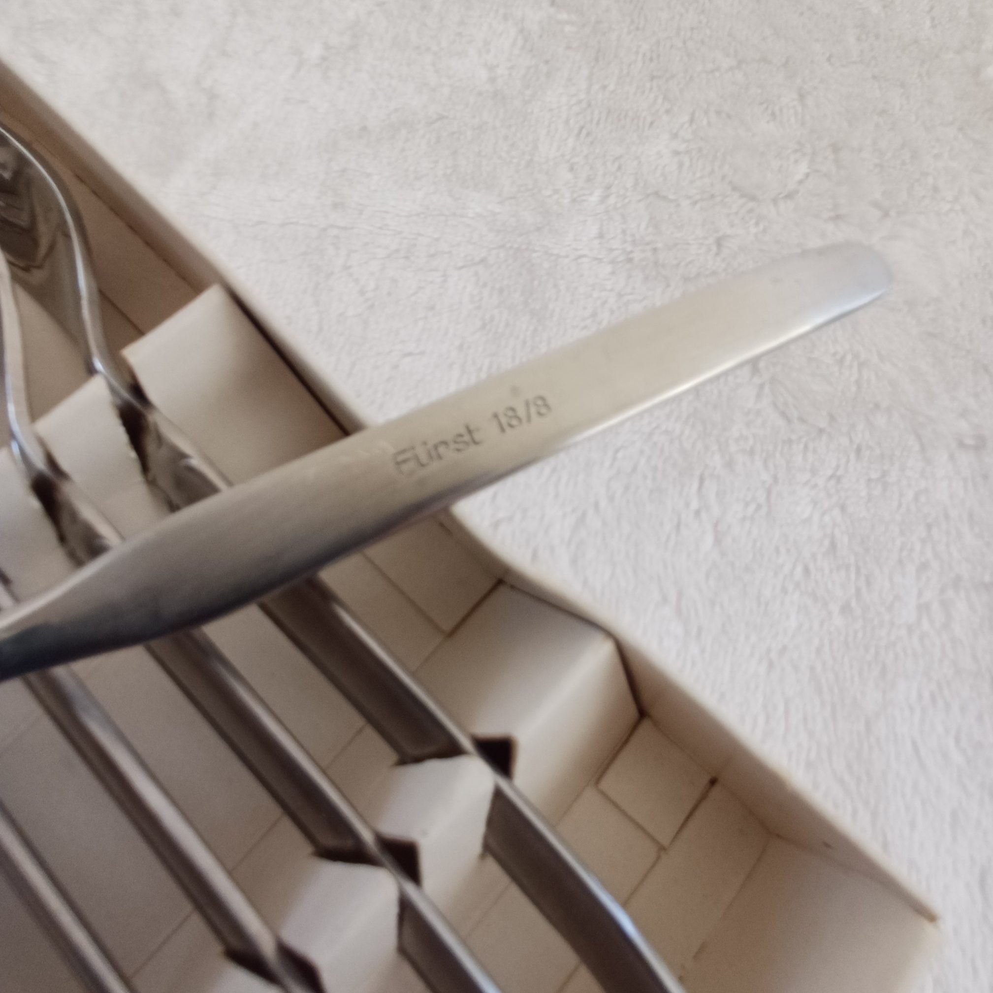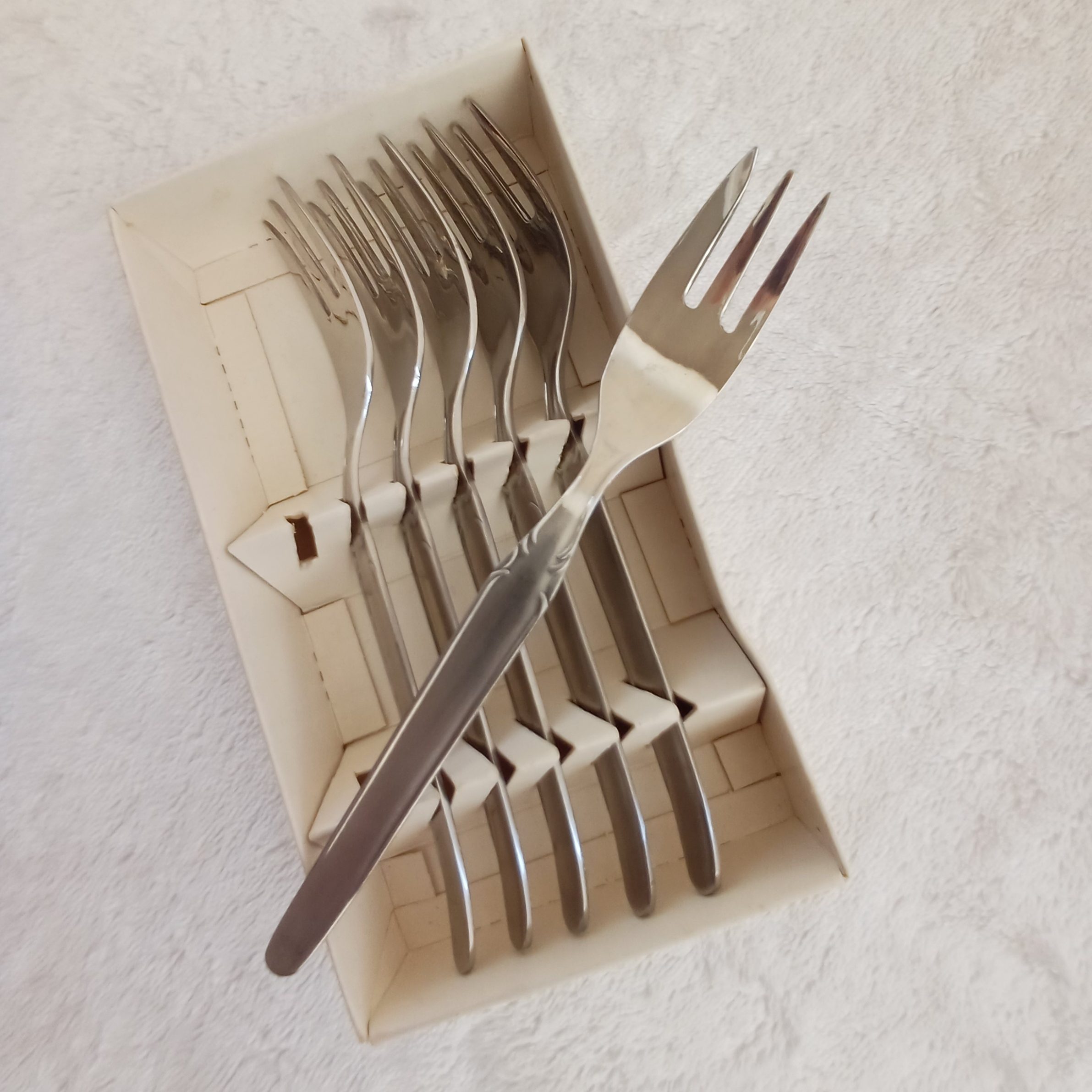Caja de seis tenedores de aperitivo de la marca alemana Fürst Besteck con una aleación de cromo/níquel de 18/8 que pertenece al grupo de los más resistentes. Tamaño: 16 cm.