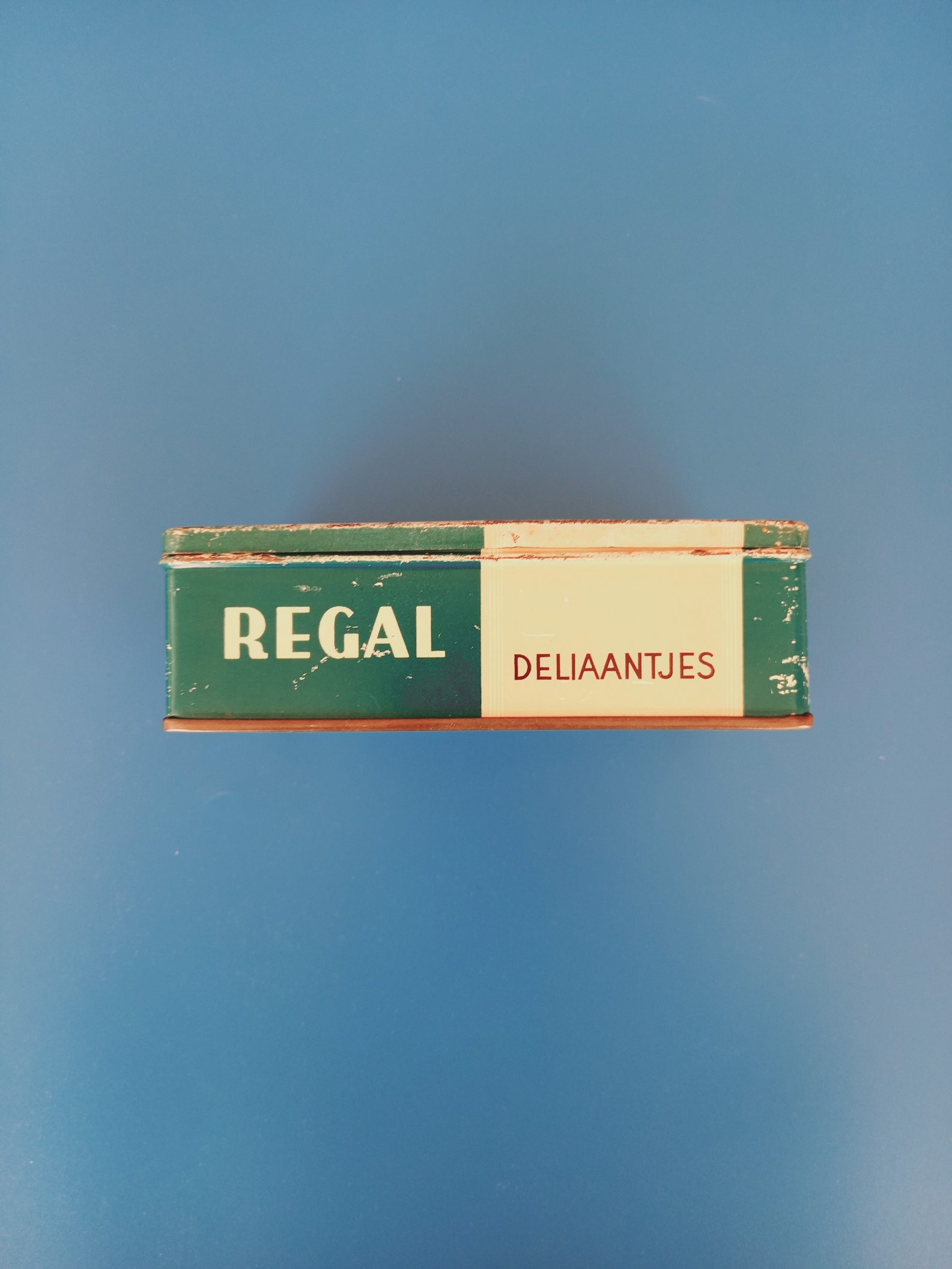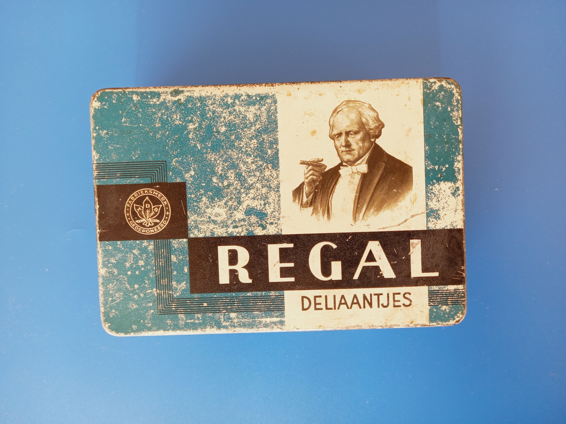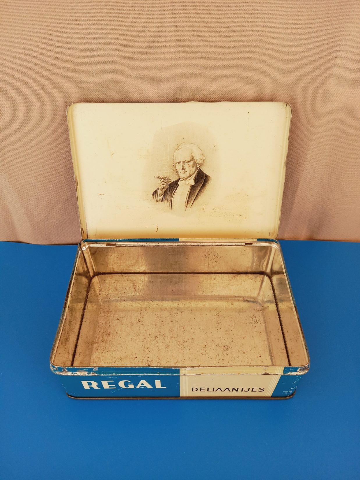 Caja de puros de la marca Regal. Es de hojalata y las medidas son 15,5 cm x 10,5 cm x 4,7 cm