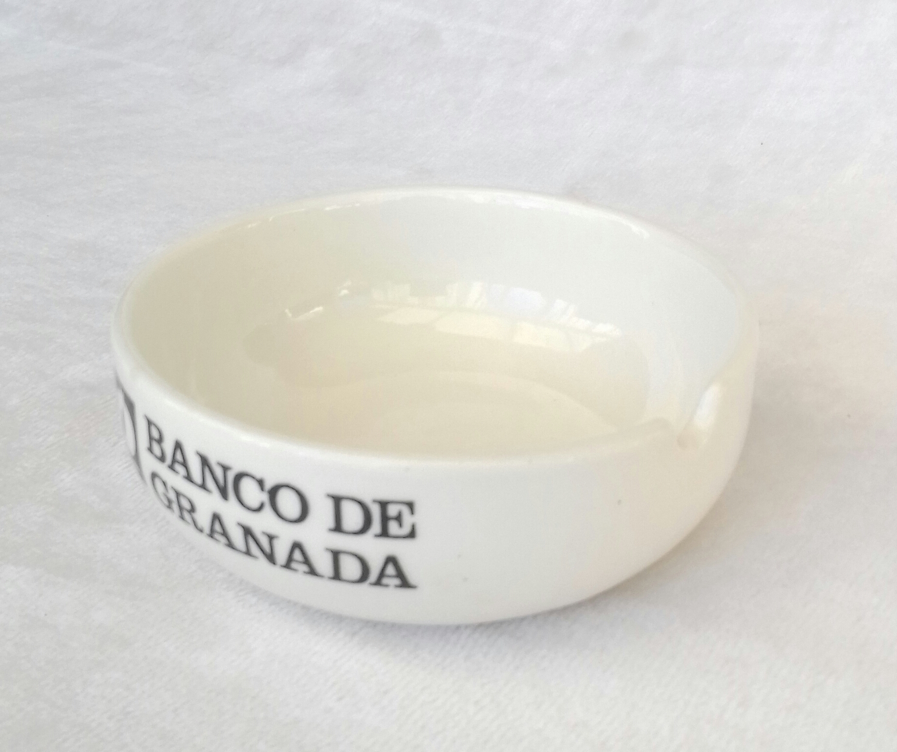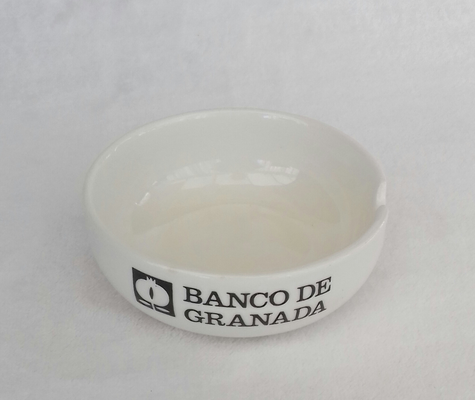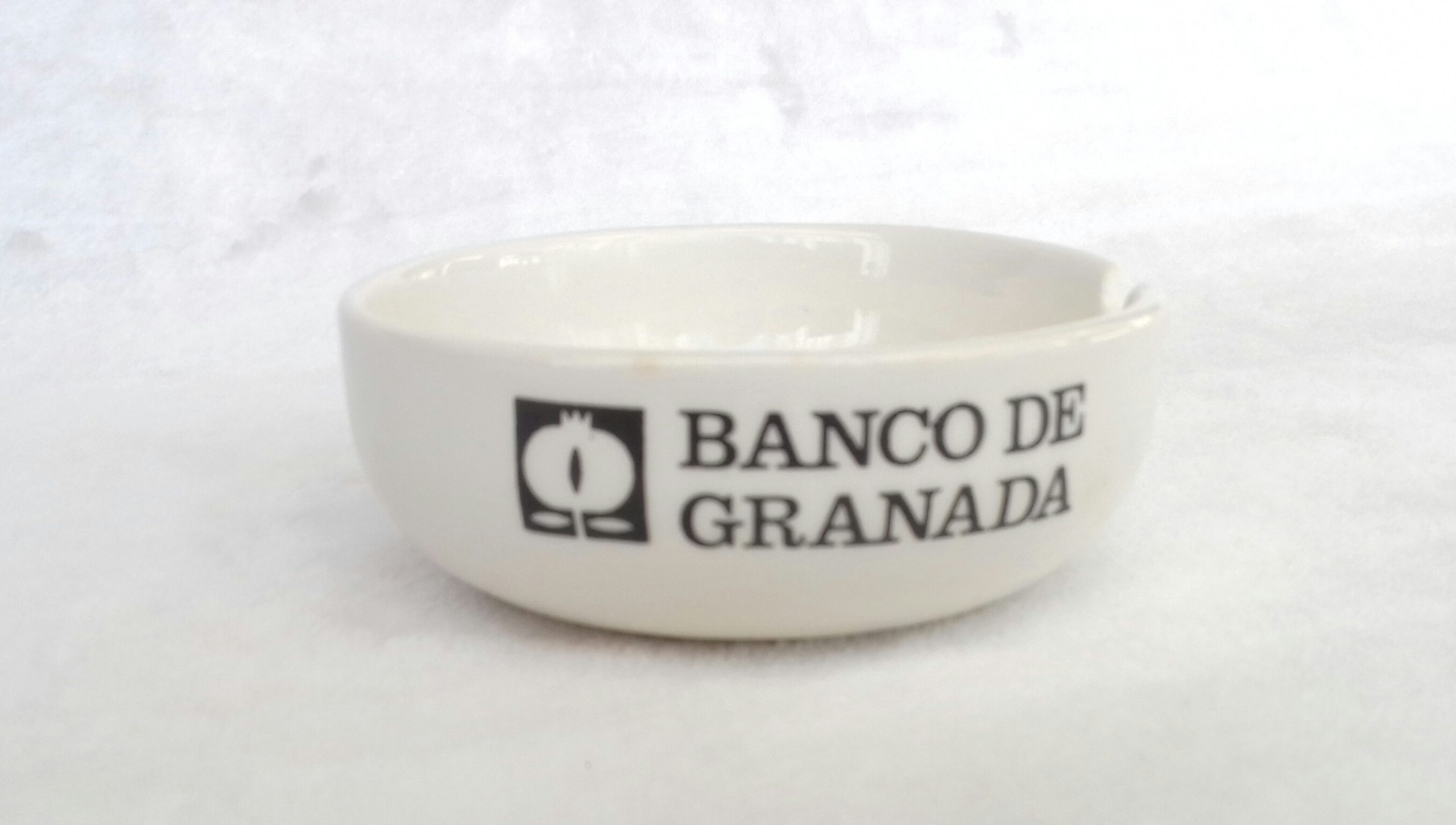 Cenicero de loza con publicidad del Banco de Granada, fabricado por la casa San Claudio. Perfecto estado de conservación. Diámetro: 10 cm. Alto: 4 cm.