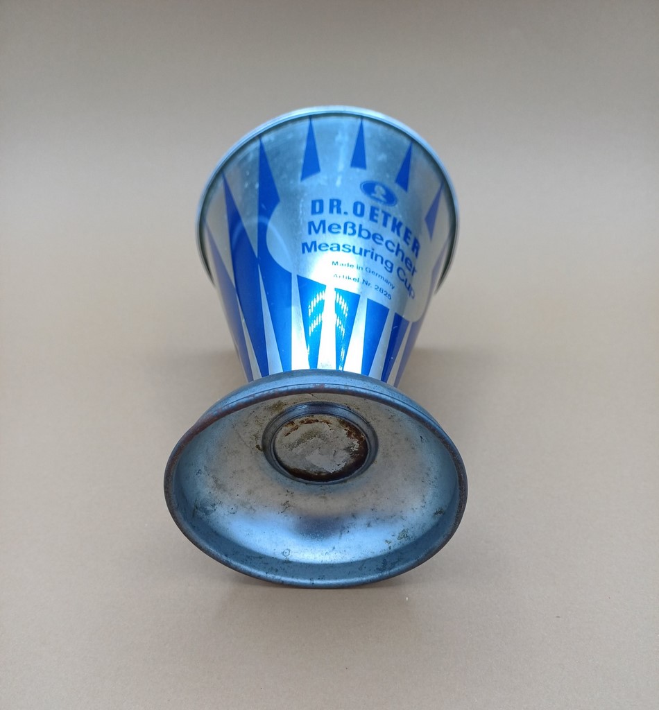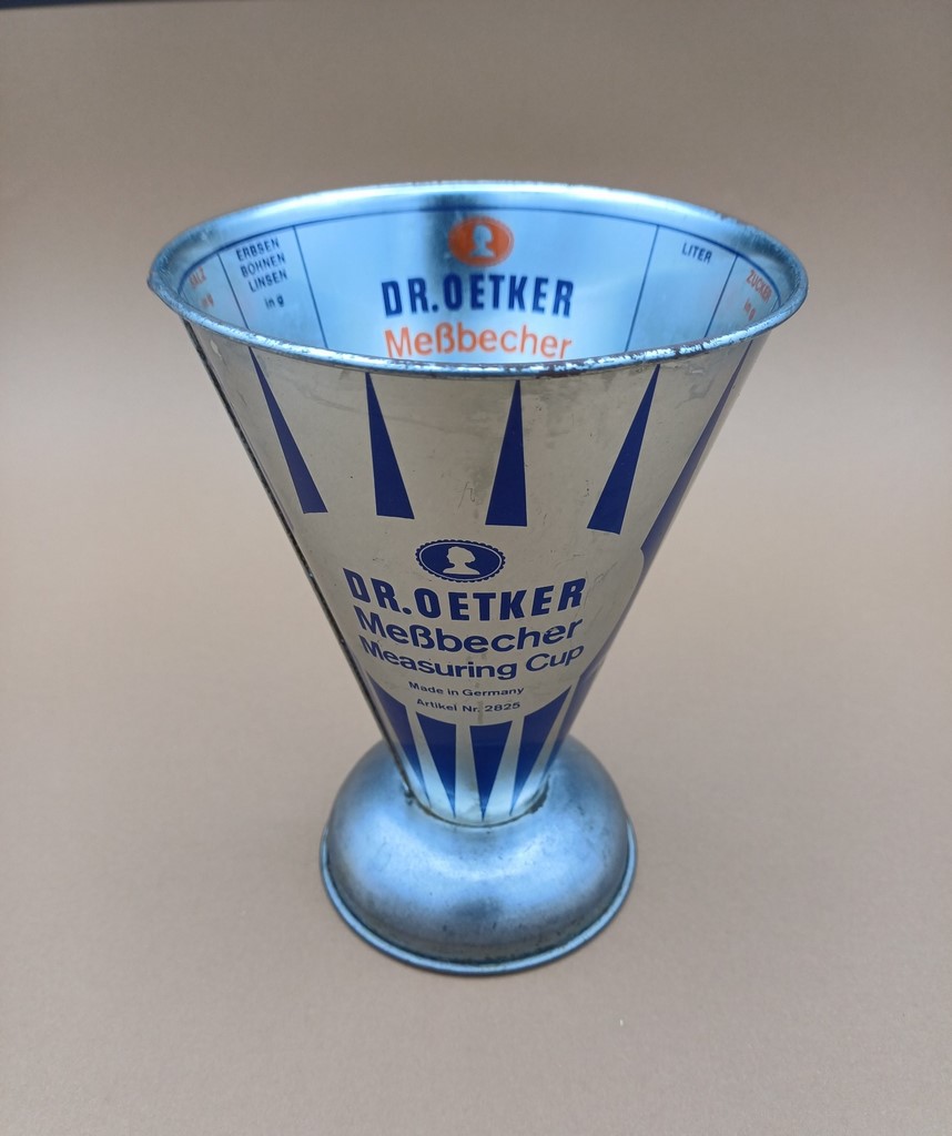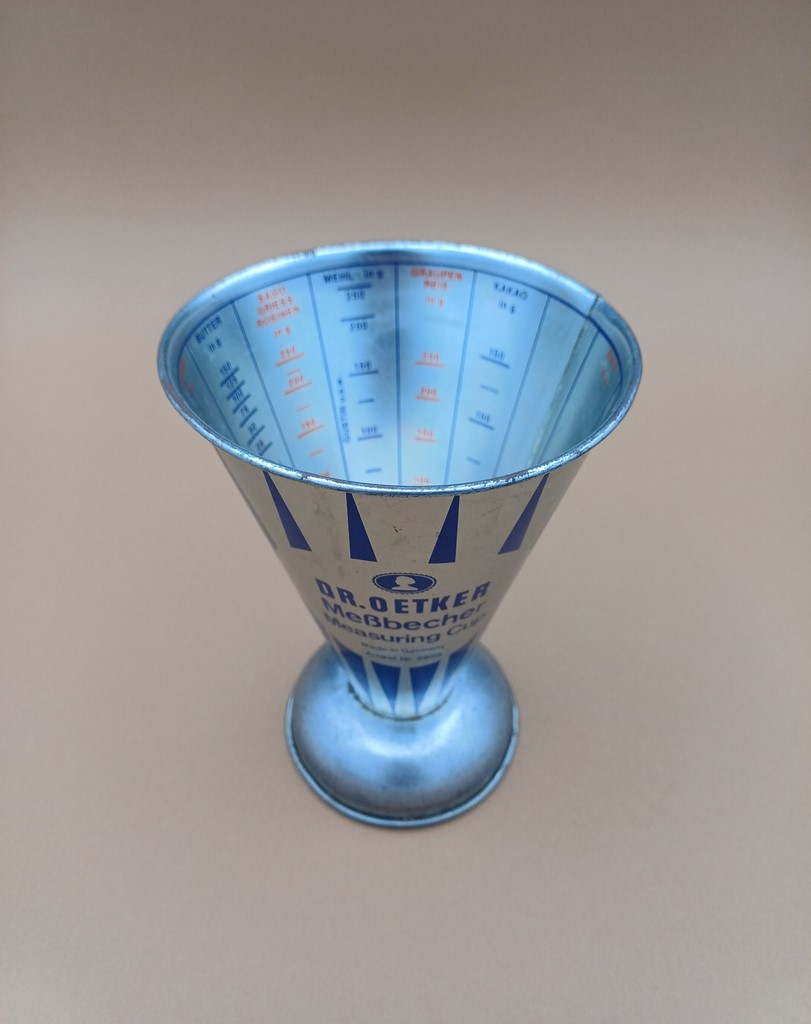 Copa para medidas de la marca Dr. Oetker. Fabricada en Alemania. Tiene para medir líquidos, azúcar, mantequilla, pasas, harina, cebada, cacao, sal y legumbres. 14,5 cm de alto y 11 cm de diámetro.