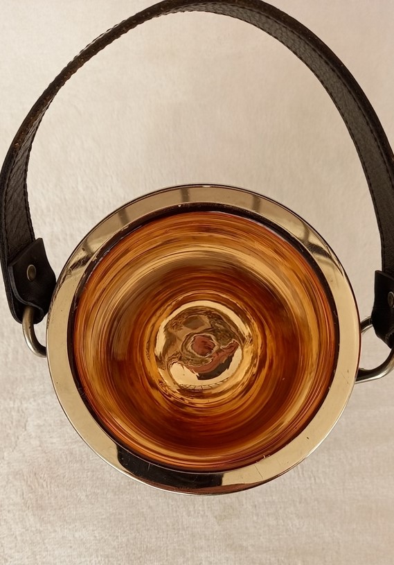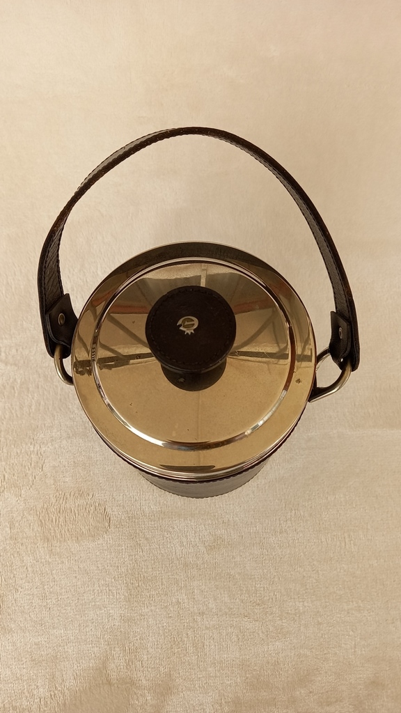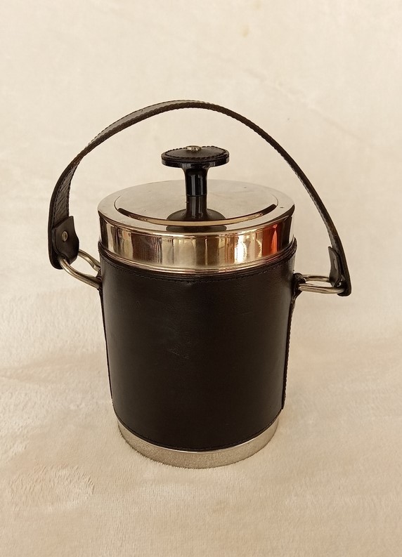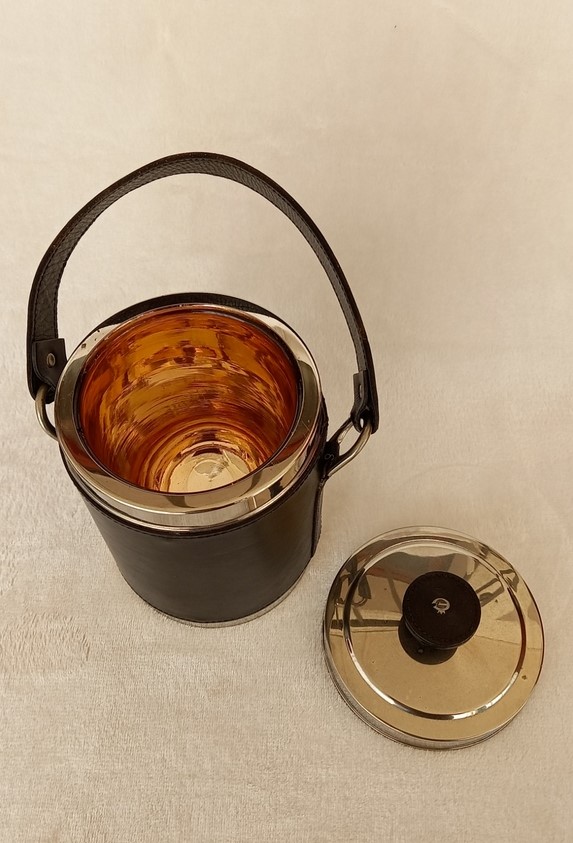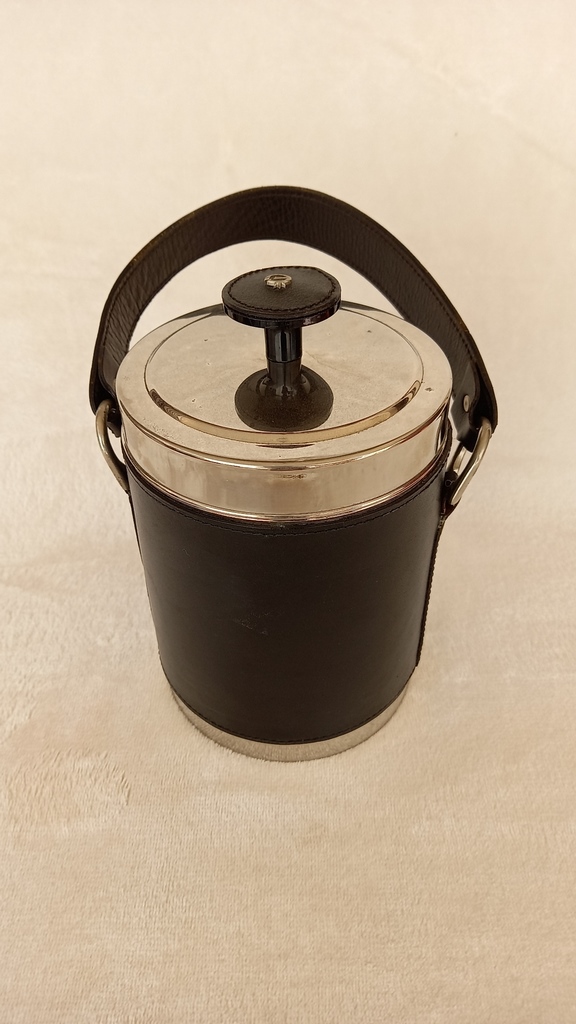 Cubitera forrada en imitación de cuero con asa para transportar. Tapadera cromada con tirador.