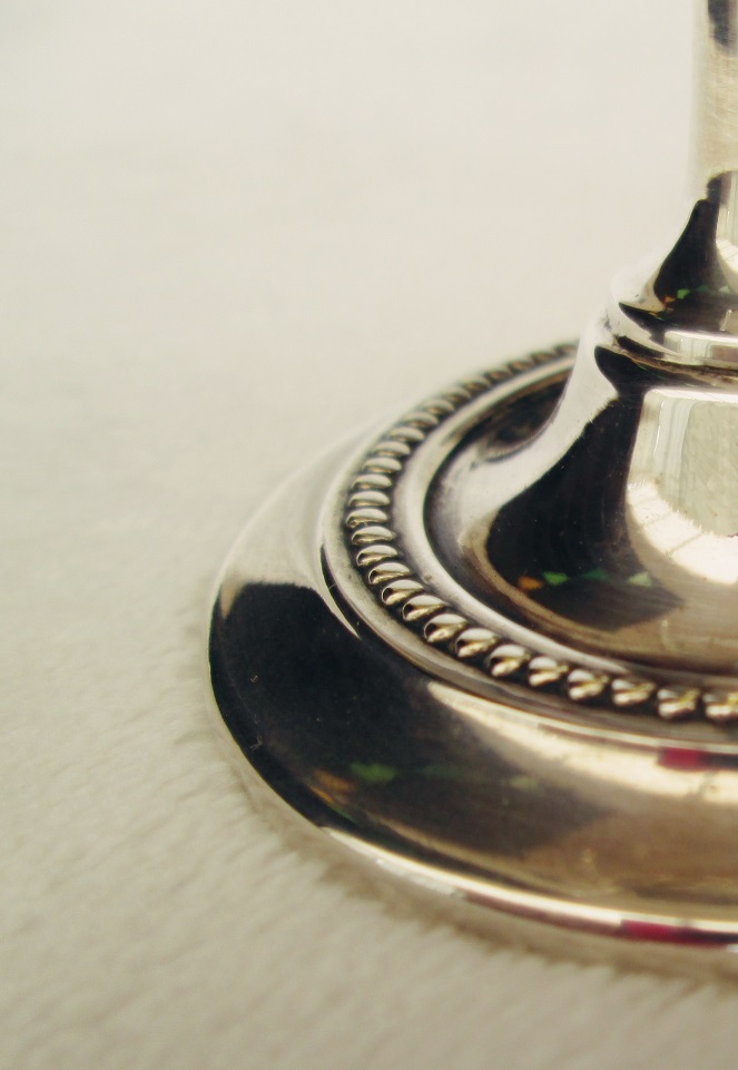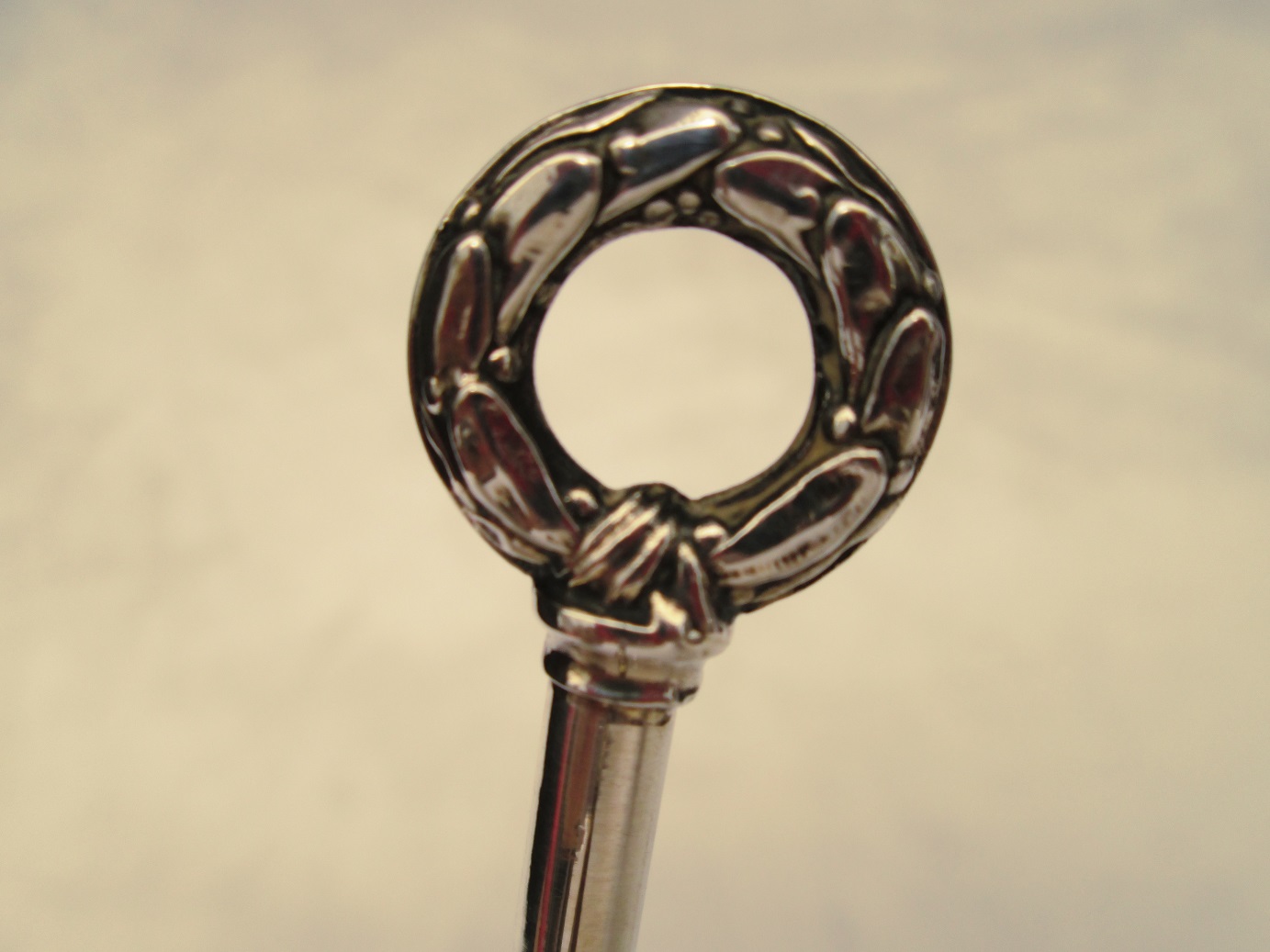 Original cuelga anillos fabricado en alpaca plateada, con dos ganchos sencillos y dos dobles. En la parte superior tiene un asidero en círculo con dibujo de corona de laurel. Mide 19 cm de altura.