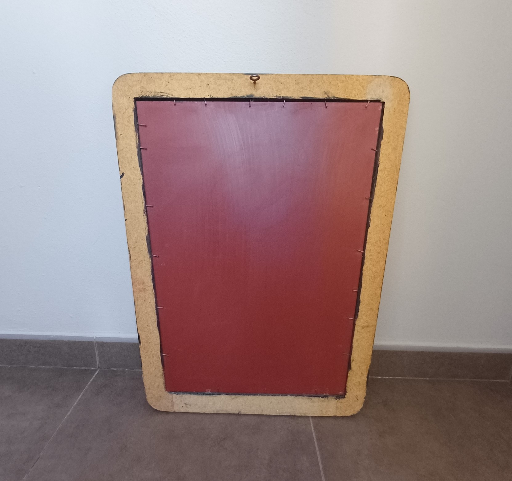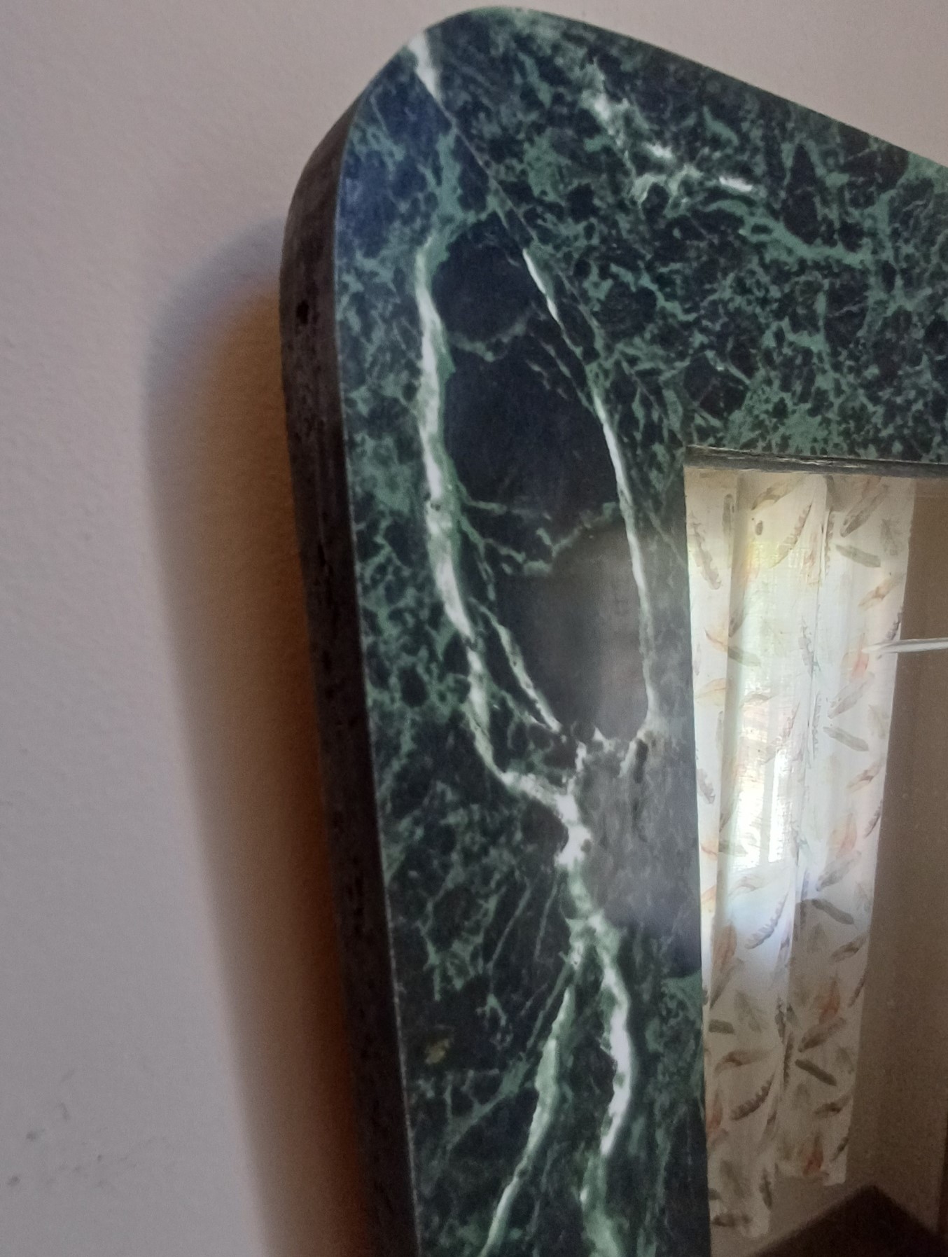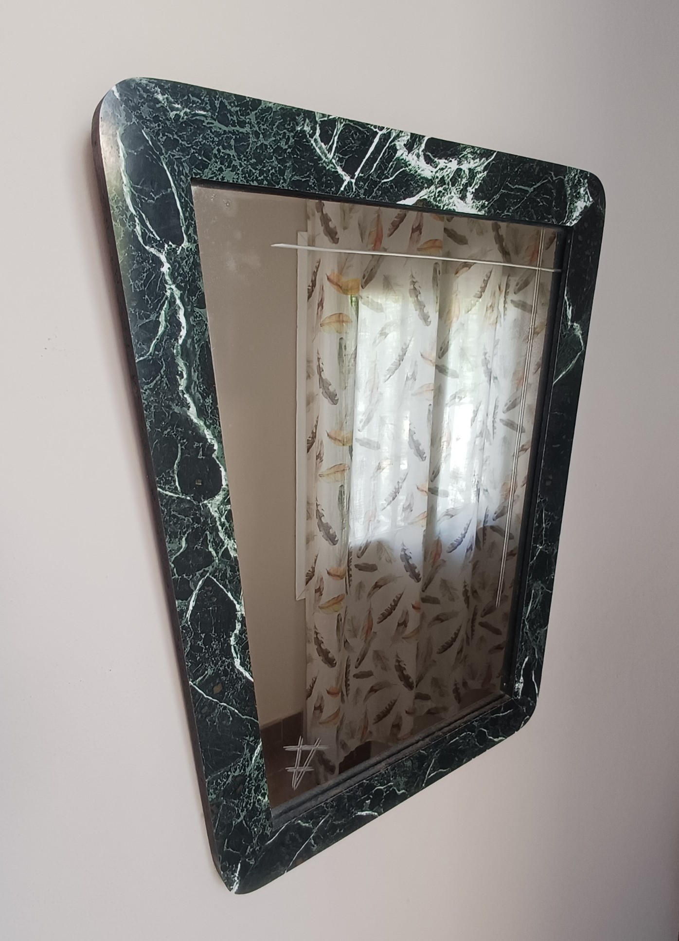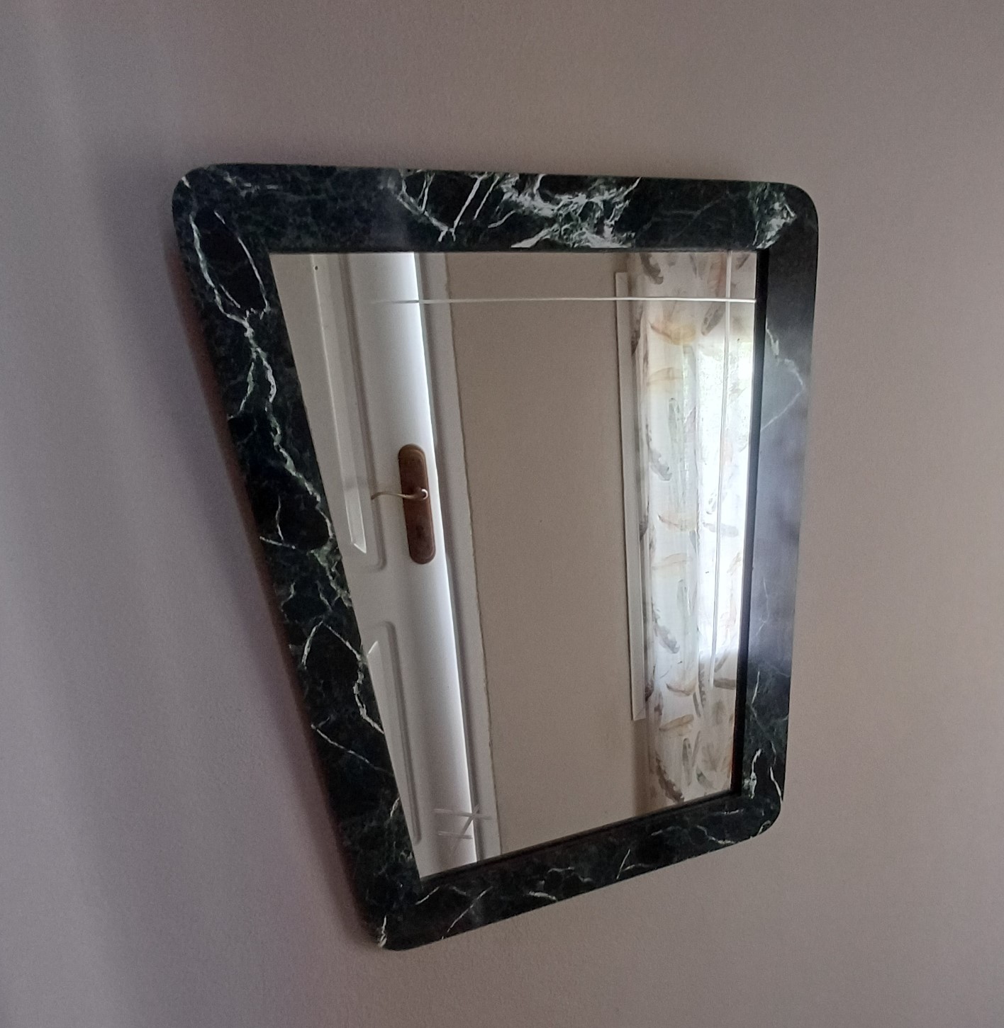 Espejo realizado en formica imitando mármol negro/verdoso sobre aglomerado. El espejo tiene adornos tallados. Ideal para colocar en una entrada. La forma es trapezoidal, siendo el lado superior más largo que el inferior. Medidas: 49,5 cm de ancho (parte superior); 40 cm de ancho (parte inferior); 60 cm de alto; 5 cm el ancho del marco. El espejo tiene en una pequeña zona muestras del paso del tiempo, tal y como aparece en las fotos. Tiene un perchero compañero (Consultar en caso de estar interesados).