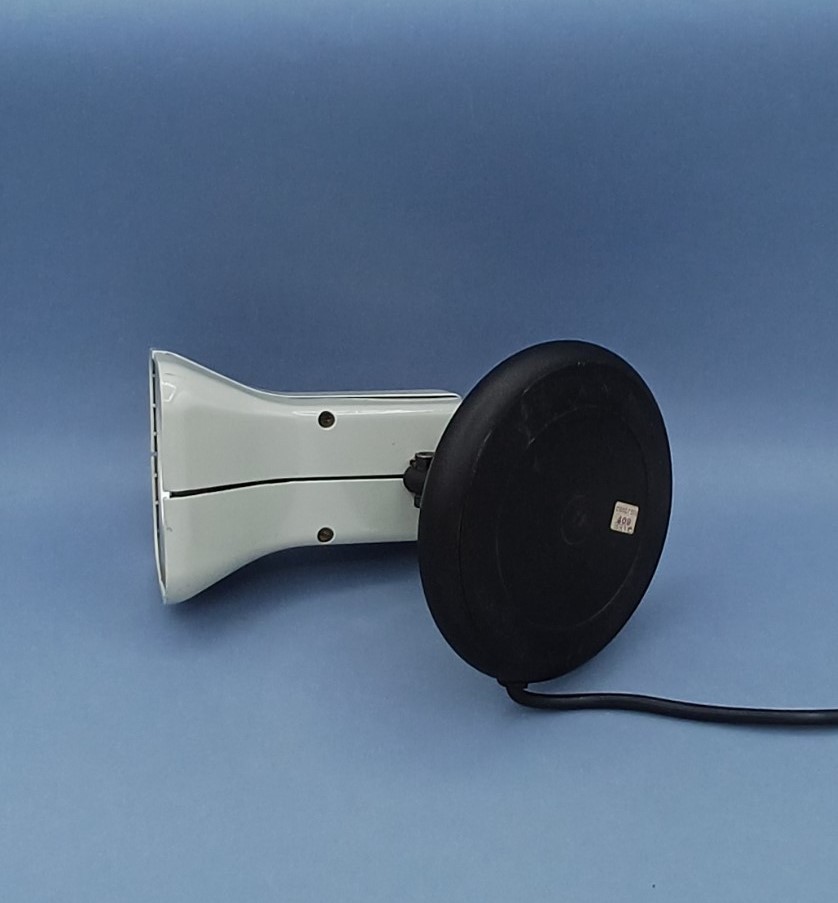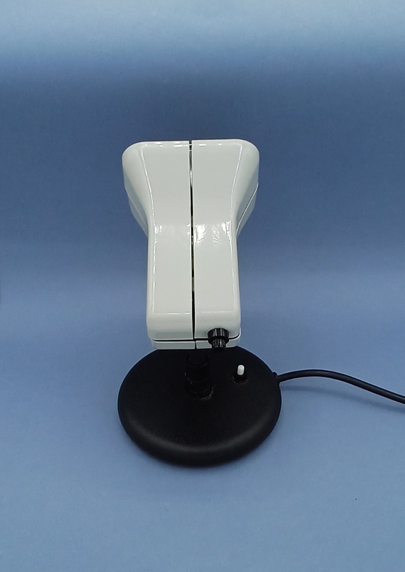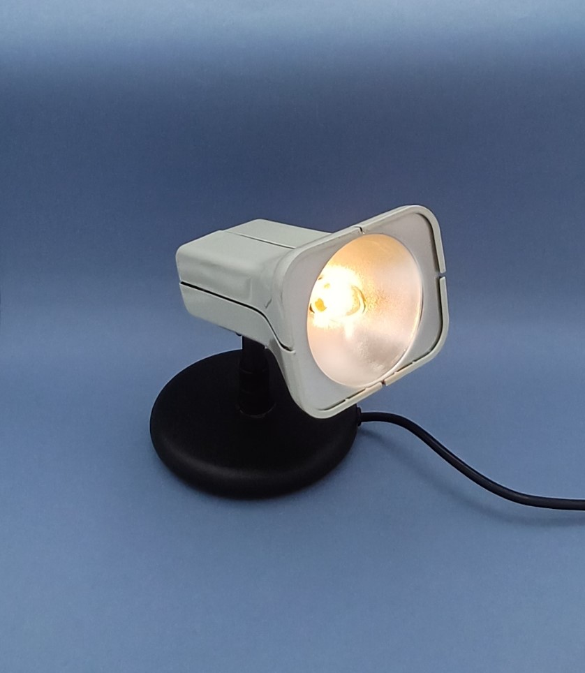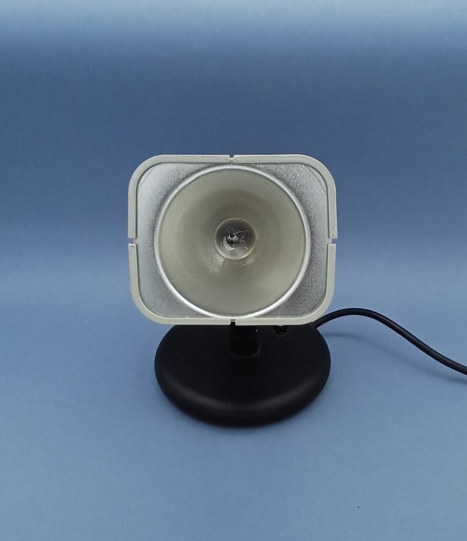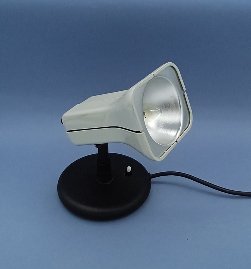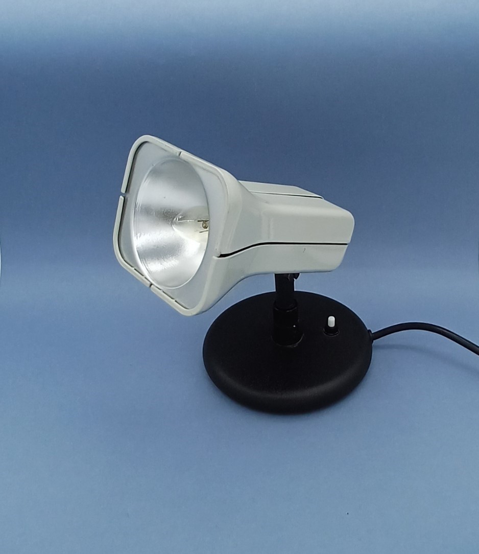 Foco de sobremesa de metal esmaltado de la marca Lita. Tiene un interruptor en su base y un fusible en su parte posterior. Bombilla de boca estrecha. Medidas: 18,5 cm de alto, 15 cm de diámetro la base, 11,5 cm de ancho el foco y 20 cm de profundidad.