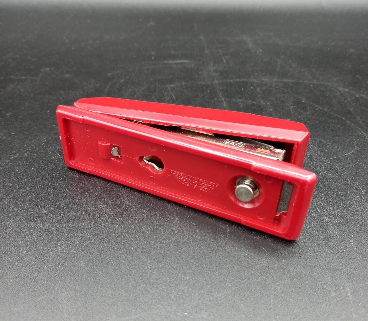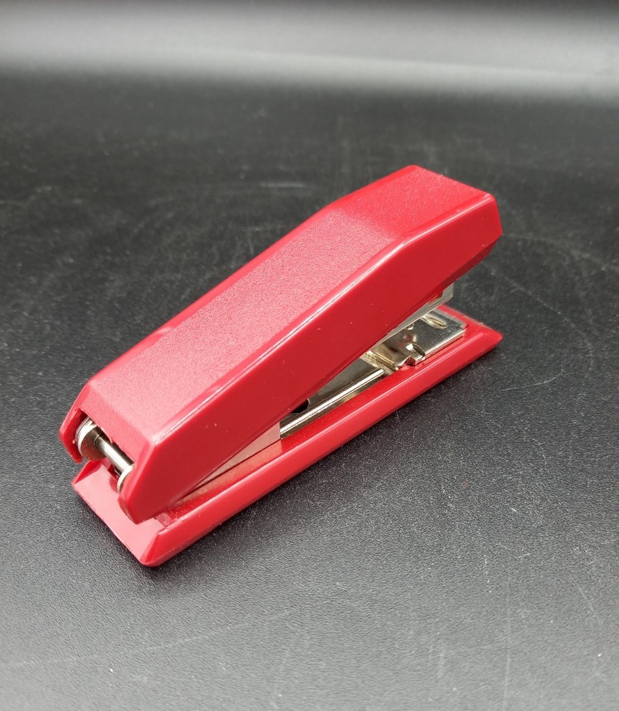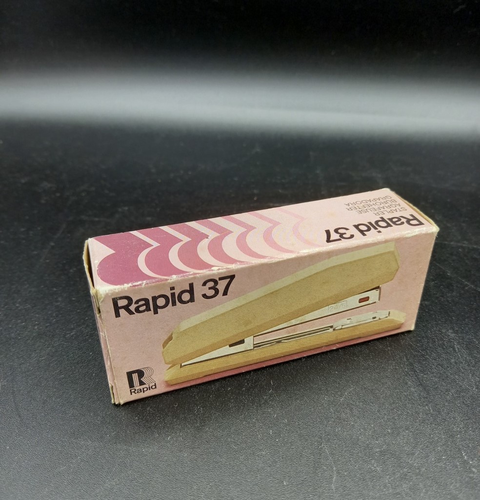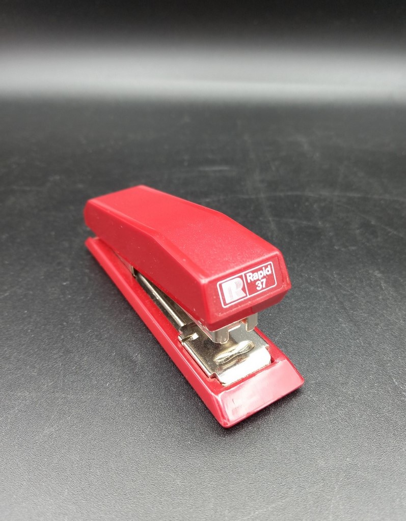 Grapadora sueca marca Rapid 37. Hecha en plástico rojo y metal. Con su caja original. En perfecto estado y funcionando. Medidas: largo 10,5 cm, ancho 2,8 cm, alto 4 cm.