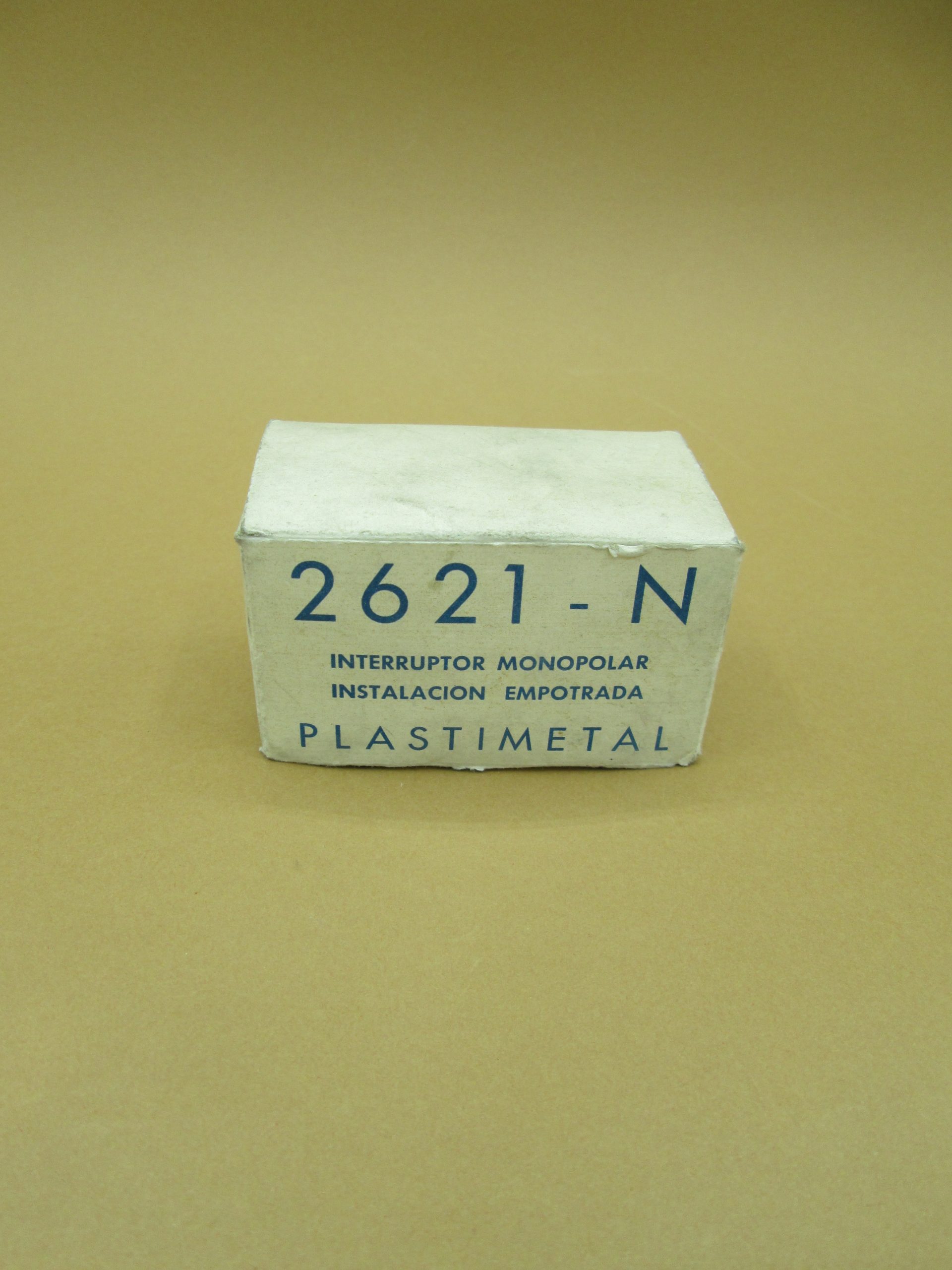 Interruptor sencillo monopolar para empotrar marca Plastimetal con caja original que le falta la solapa. Color negro. 15 amperios, 500 voltios. Nuevo. Procedente de liquidación de tienda de electricidad.