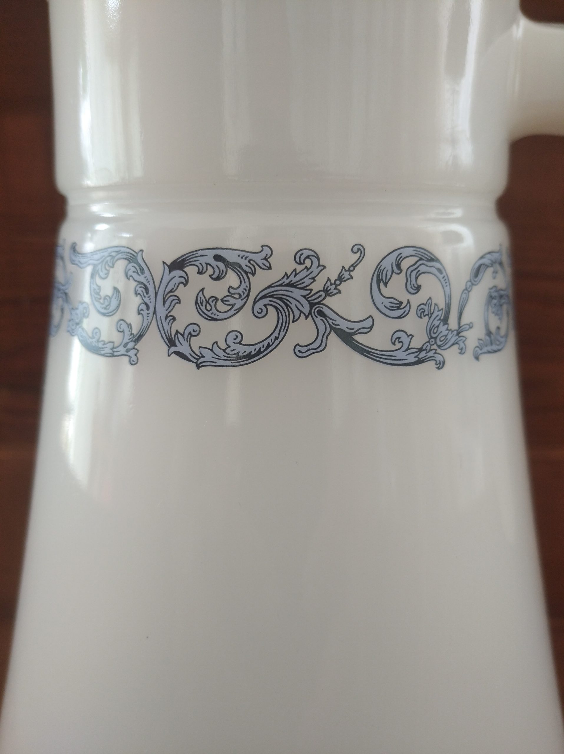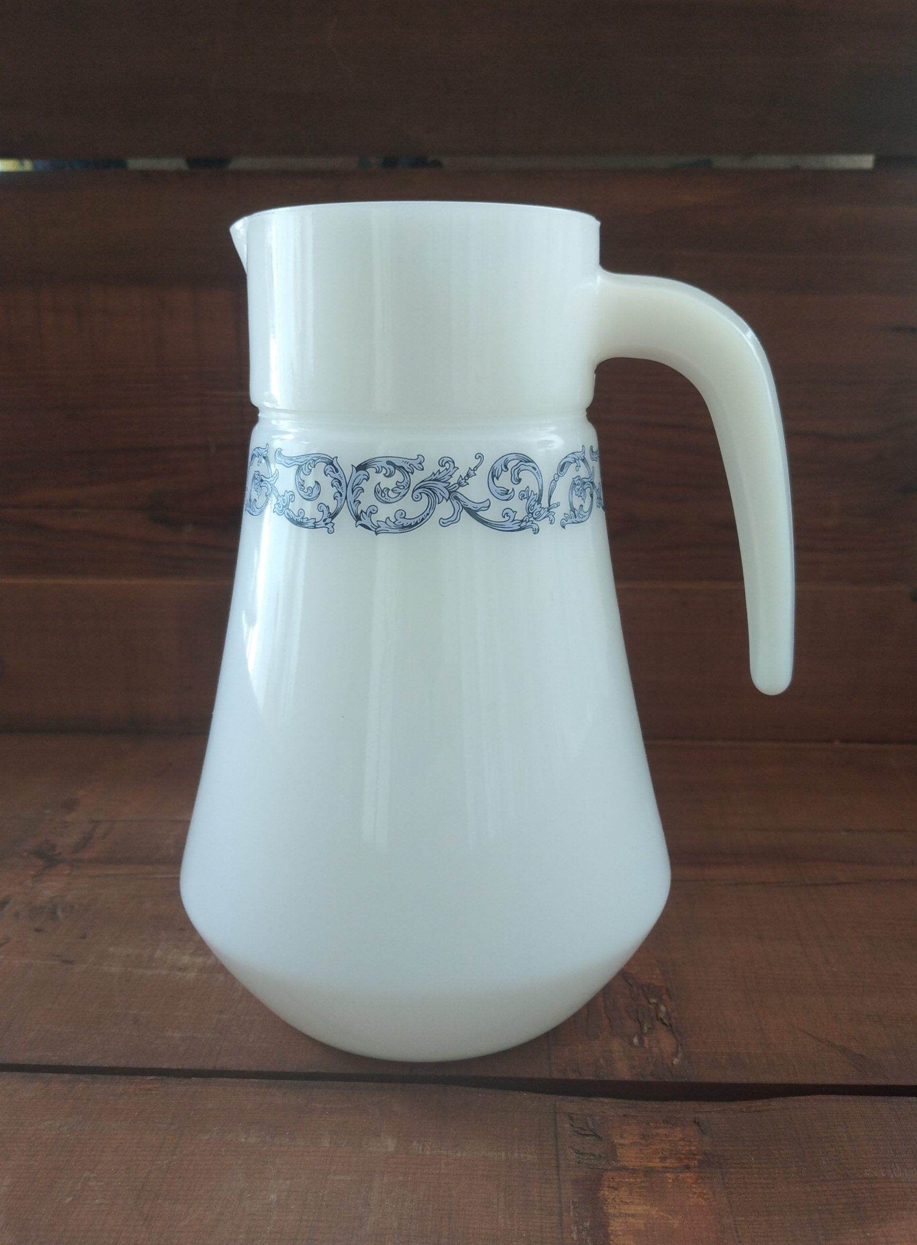 Jarra de agua de cristal opalino blanco decorada con cenefa en azul con motivos vegetales.