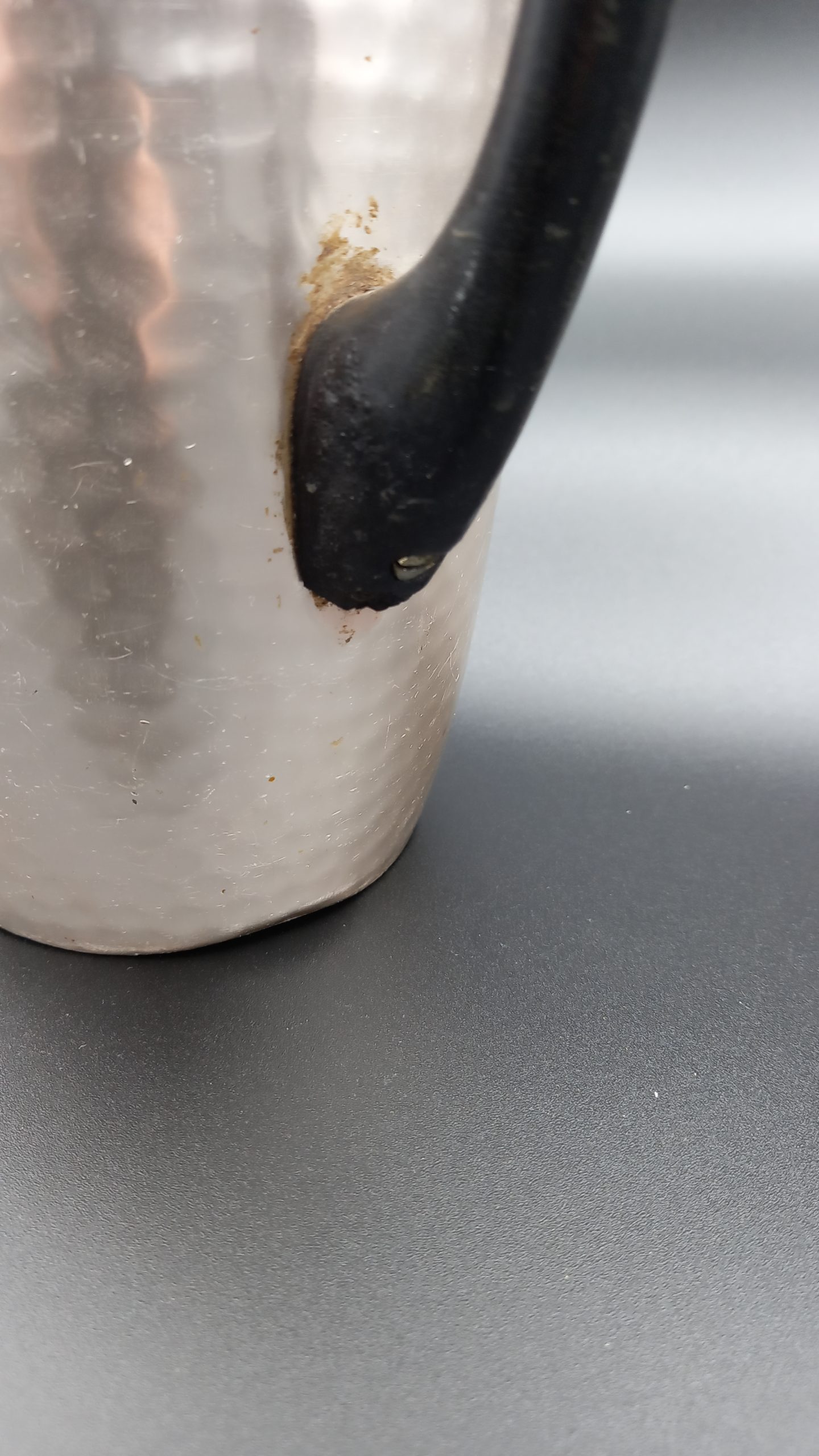 Jarra de aluminio martelé en cobre de la marca MMM (Manufacturas Metálicas Madrileñas). 23 cm de altura. Señales del paso del tiempo.