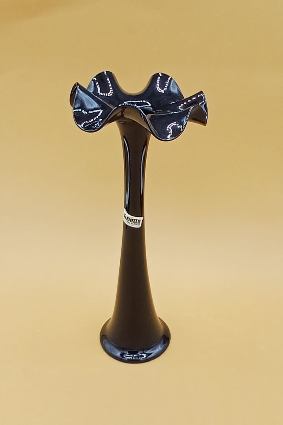 Jarrón de cristal negro con borde ondulado marca Anetta. Conserva su pegatina original. 24 cm de alto.