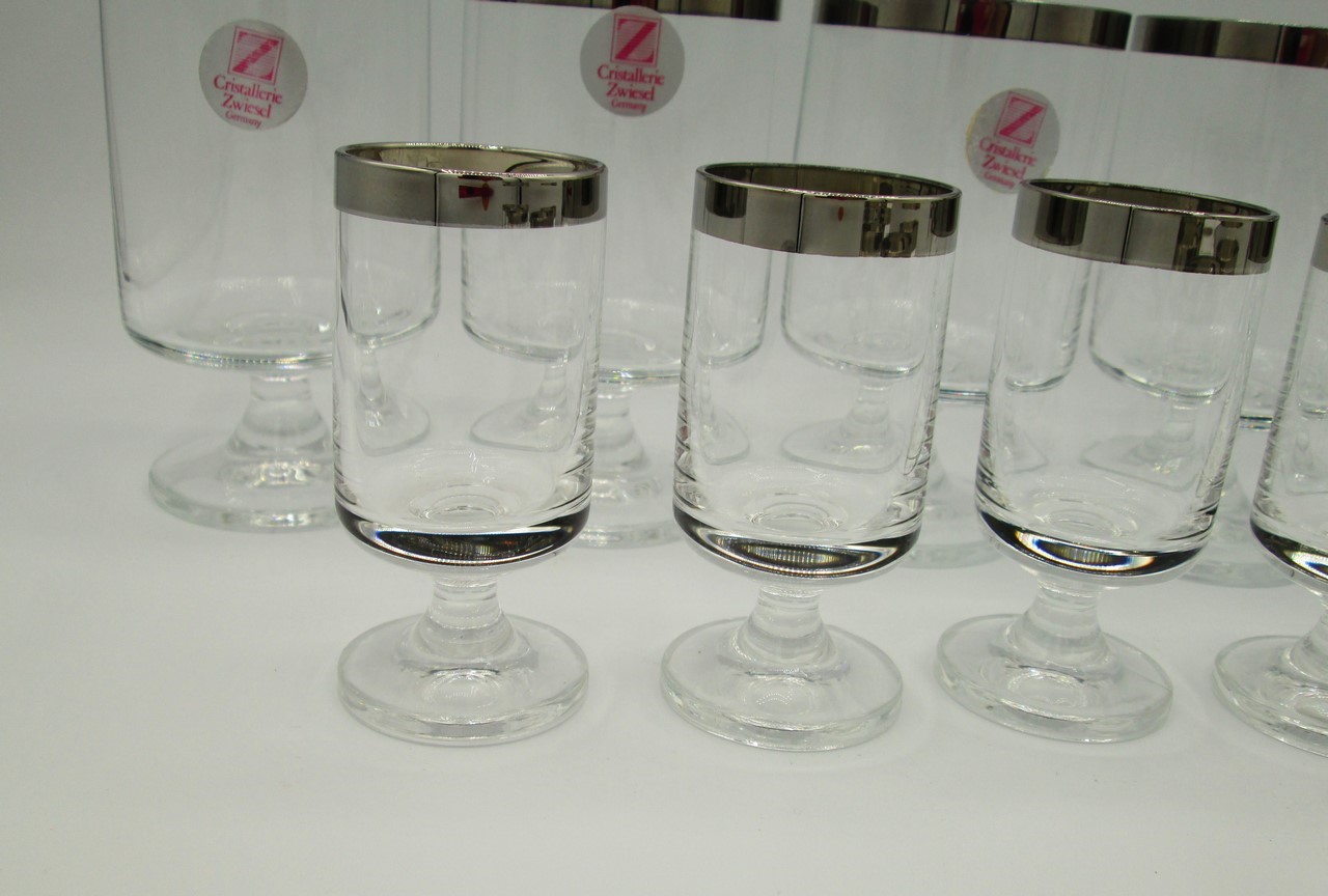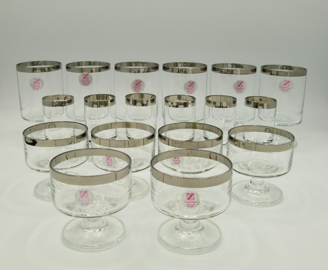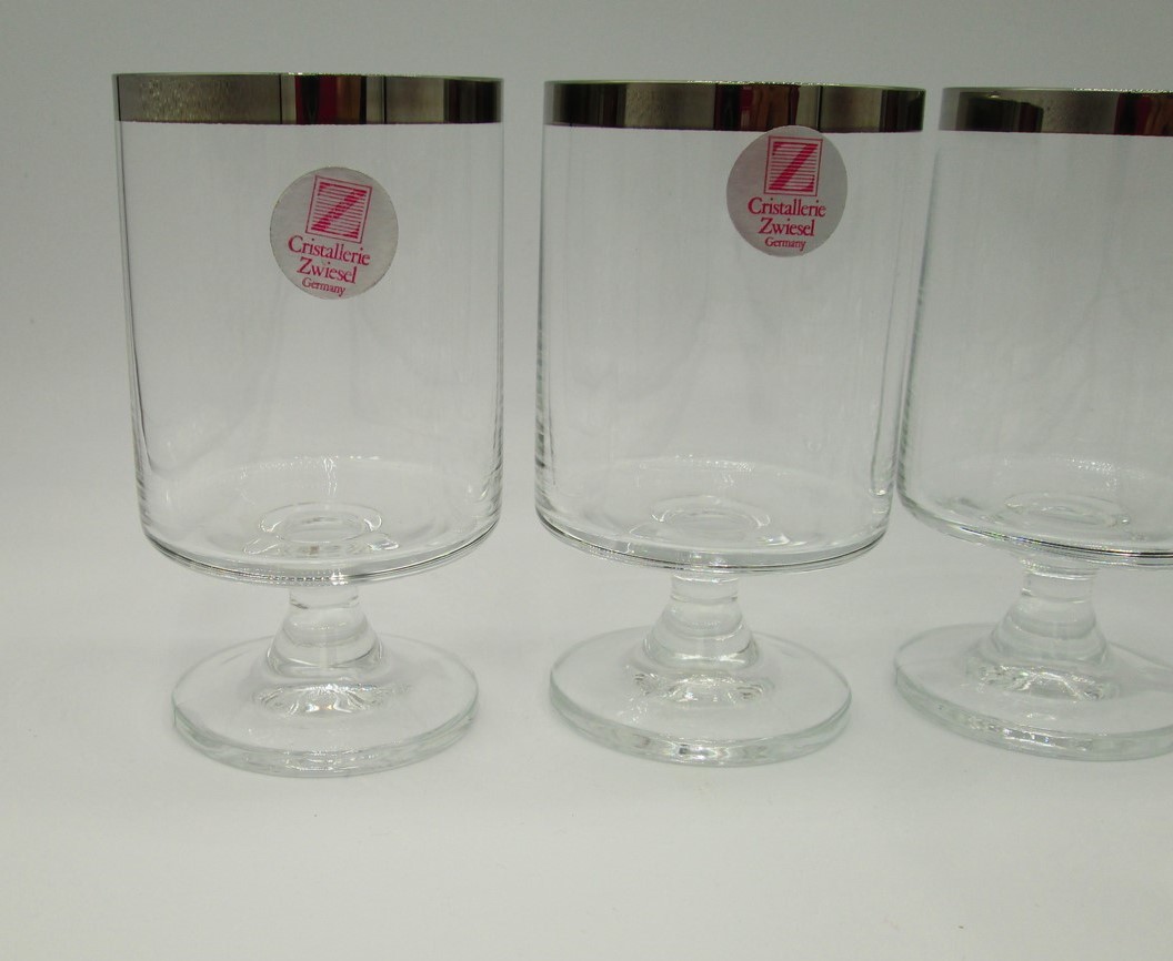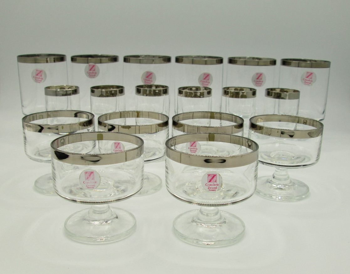 Juego de 18 copas de cristal 'Cristallerie Zwiesel' fabricadas en Alemania. El juego está formado por 6 copas grandes para vino, 6 copas cortas y 6 copas pequeñas. Todas están ribeteadas por una franja plateada de 7 mm. La mayoría aún conserva la pegatina original, por lo que están sin uso. Medidas copas grandes: 11 cm de alto x 6 cm de boca; Medidas copas cortas: 6,5 cm de alto x 6,5 cm de boca; Medidas copas pequeñas: 8,5 cm de alto x 3,5 cm de boca.