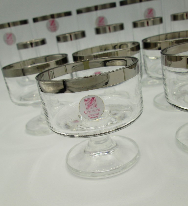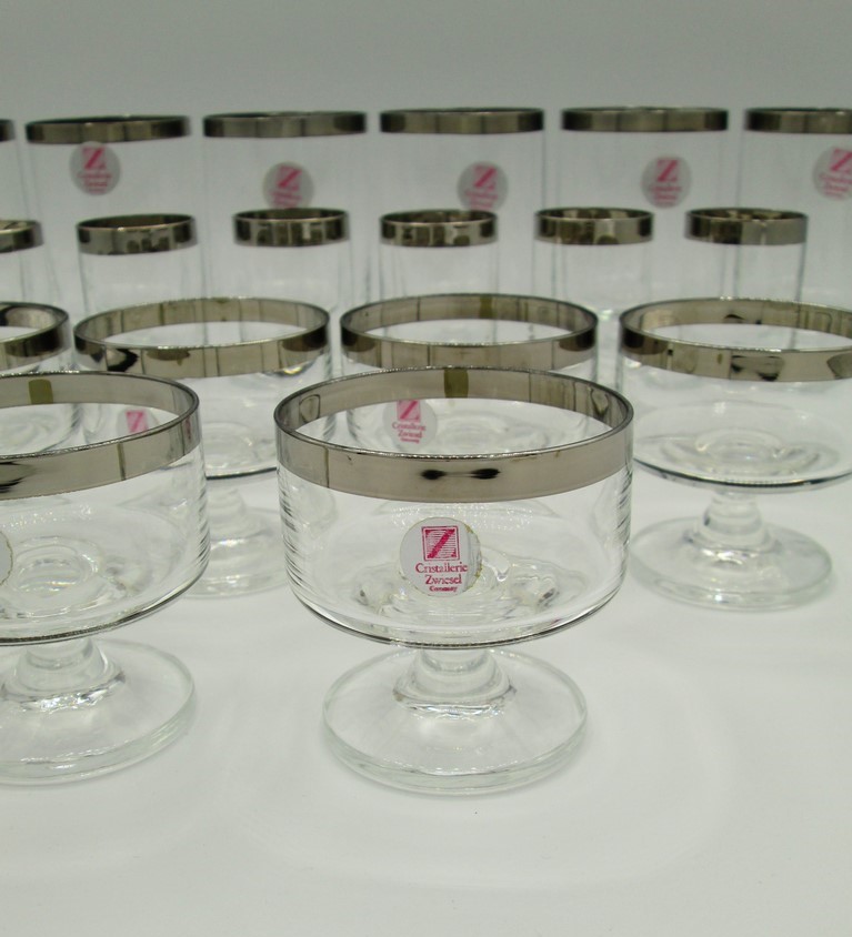 Juego de 18 copas de cristal ‘Cristallerie Zwiesel’ fabricadas en Alemania. El juego está formado por 6 copas grandes para vino, 6 copas cortas y 6 copas pequeñas. Todas están ribeteadas por una franja plateada de 7 mm. La mayoría aún conserva la pegatina original, por lo que están sin uso. Medidas copas grandes: 11 cm de alto x 6 cm de boca; Medidas copas cortas: 6,5 cm de alto x 6,5 cm de boca; Medidas copas pequeñas: 8,5 cm de alto x 3,5 cm de boca.