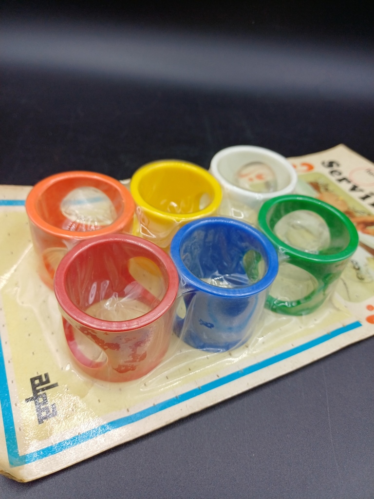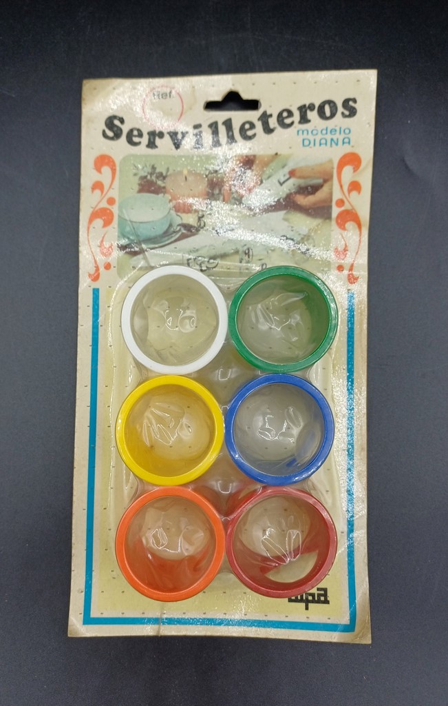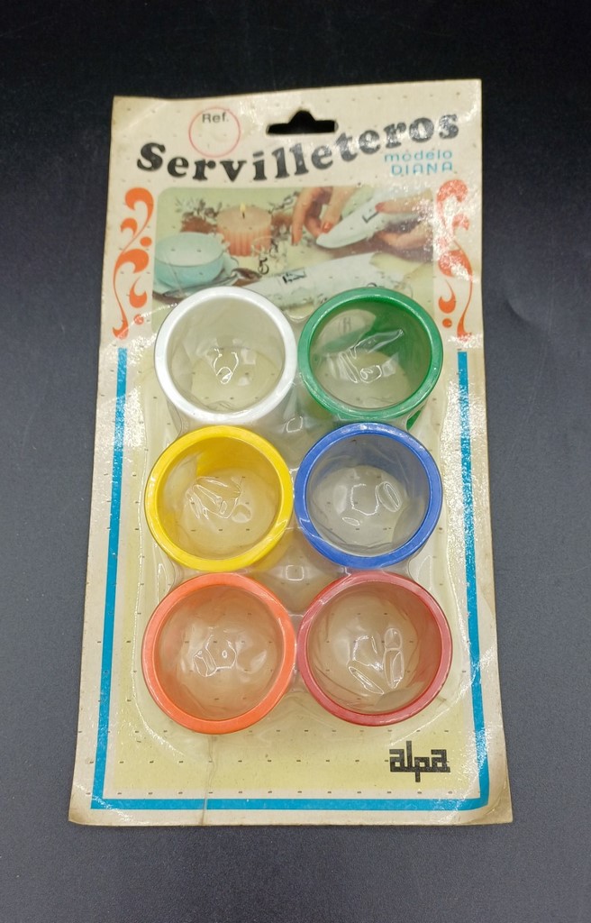 Conjunto de seis servilleteros de plástico de distintos colores. Medidas: 4 cm de longitud y 4,5 cm de diámetro.