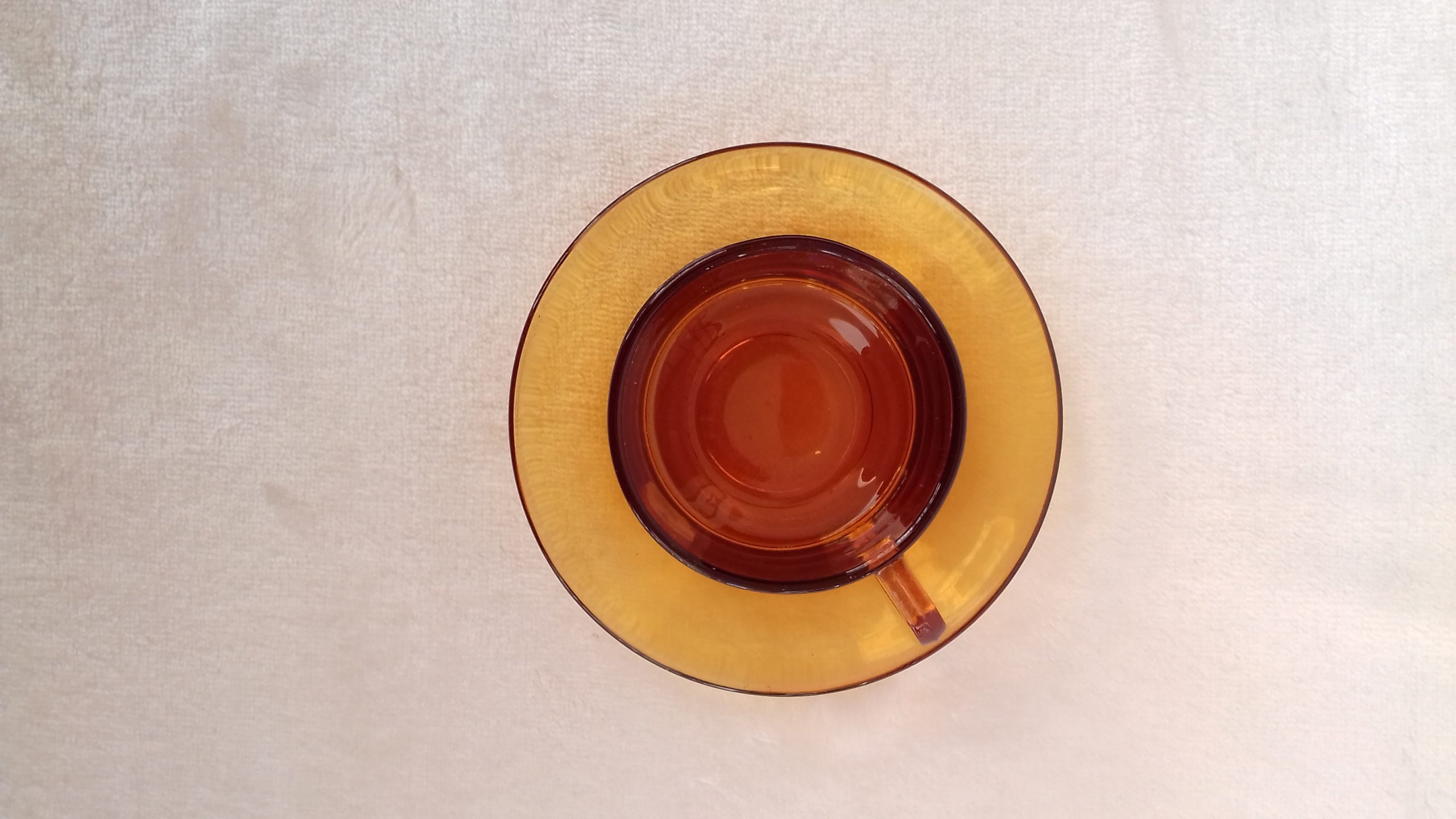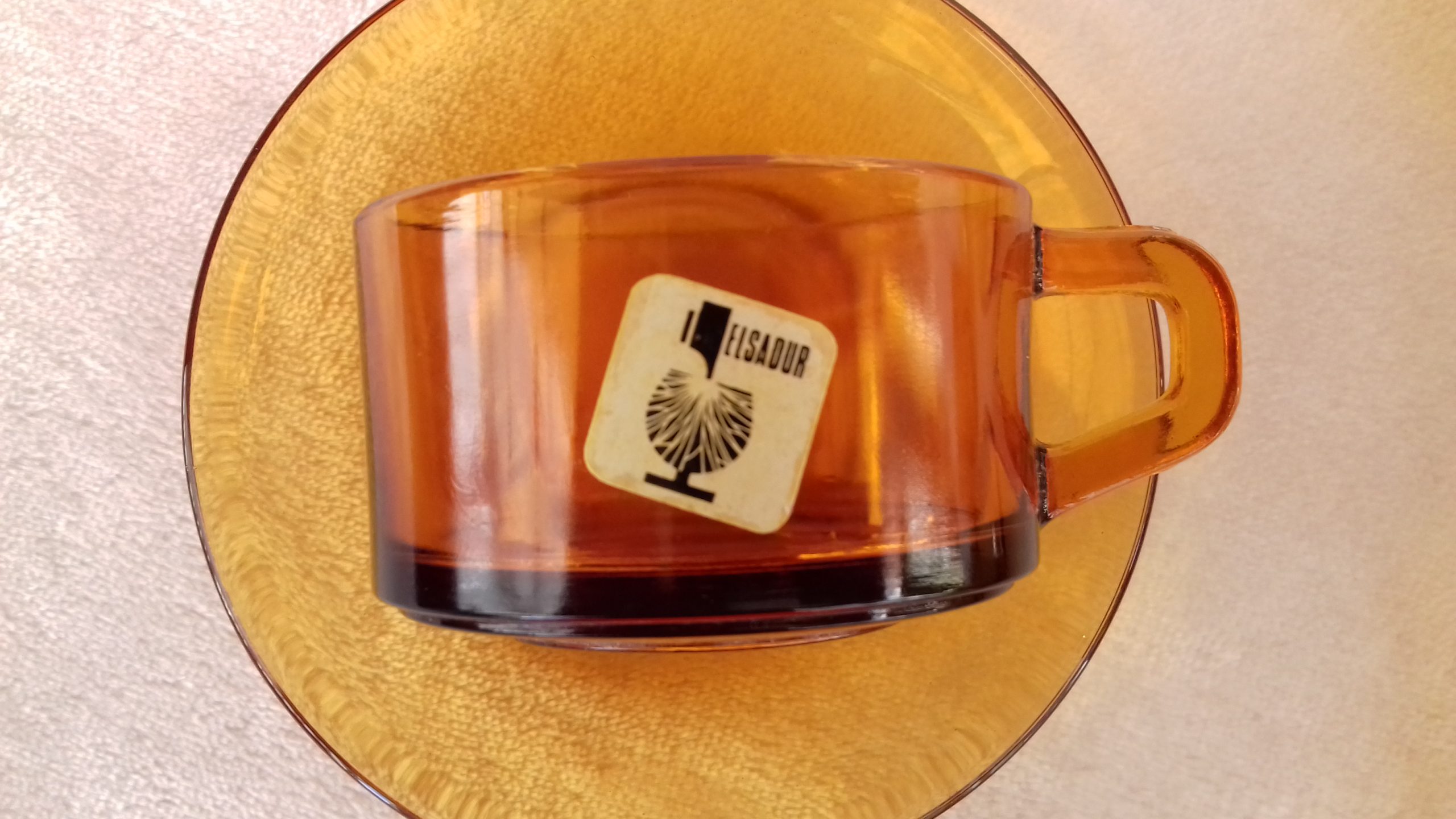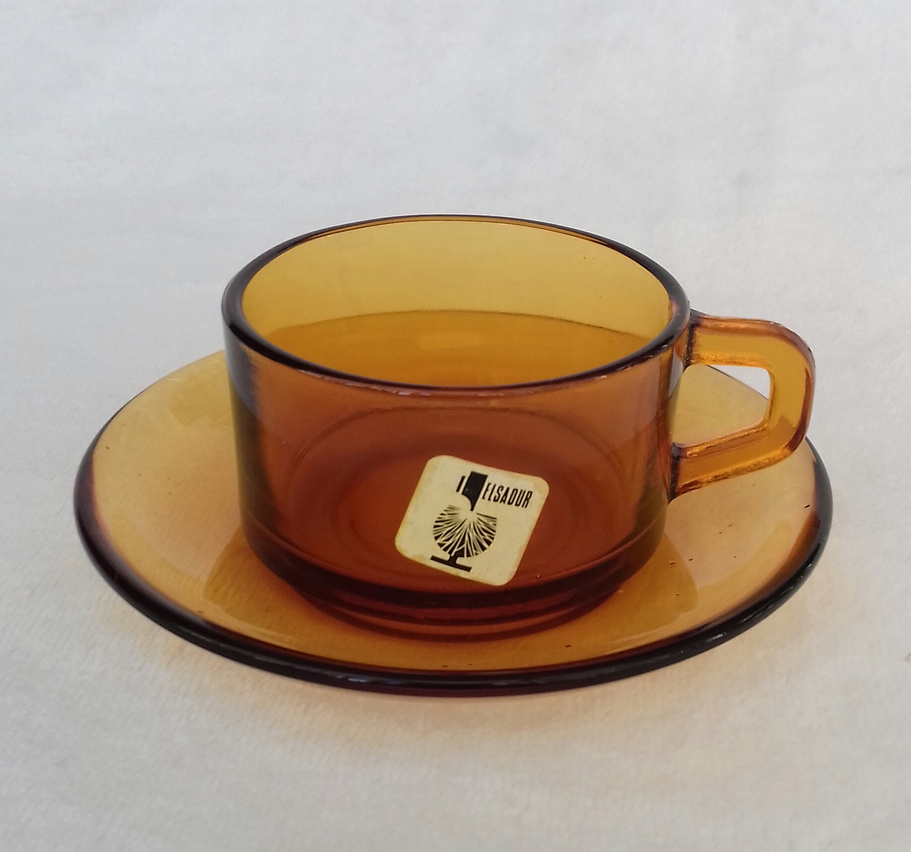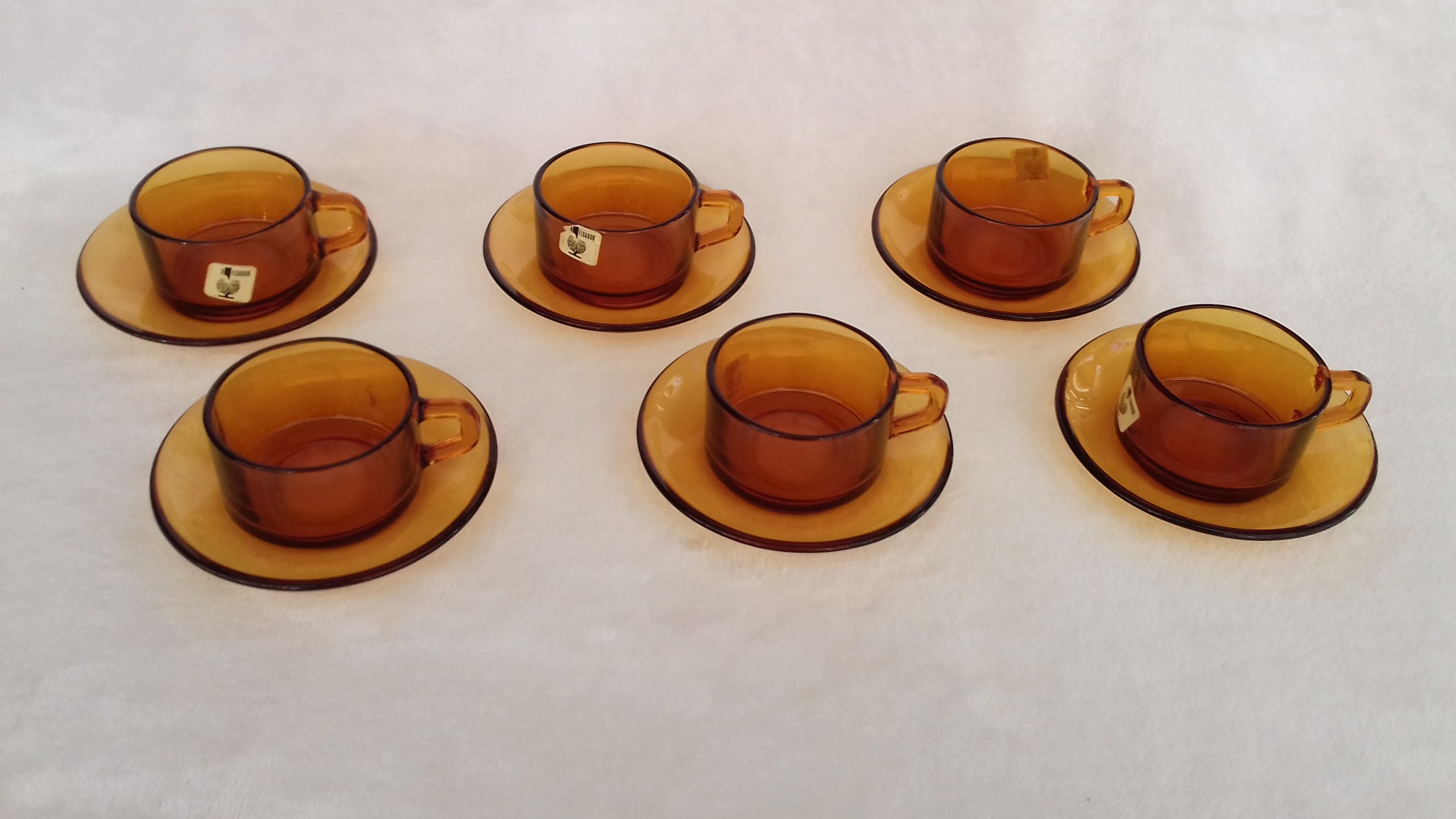 Juego de seis tazas de café con sus correspondientes platos de la marca Elsadur. Años '60. Están sin utilizar, aún con las etiquetas puestas. Las medidas de las tazas son: diámetro 7cm; alto 4cm. El diámetro de los platos es de 11,5cm.