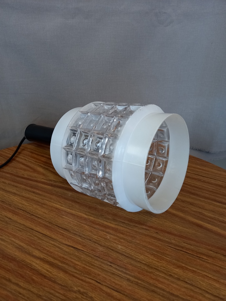 Lámpara de techo con tulipa de cristal prensado en blanco liso en la parte superior e inferior y en relieve con motivos simétricos en el cuerpo principal. El soporte es de metal. Recableada. Portalámparas antiguo con corona de cerámica. Medidas: Diámetro 15 cm, Altura tulipa 17 cm, altura total lámpara hasta el techo 56 cm. Se encuentra en buen estado, aunque el soporte negro tiene marcas del paso del tiempo.