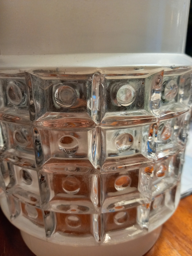 Lámpara de techo con tulipa de cristal prensado en blanco liso en la parte superior e inferior y en relieve con motivos simétricos en el cuerpo principal.