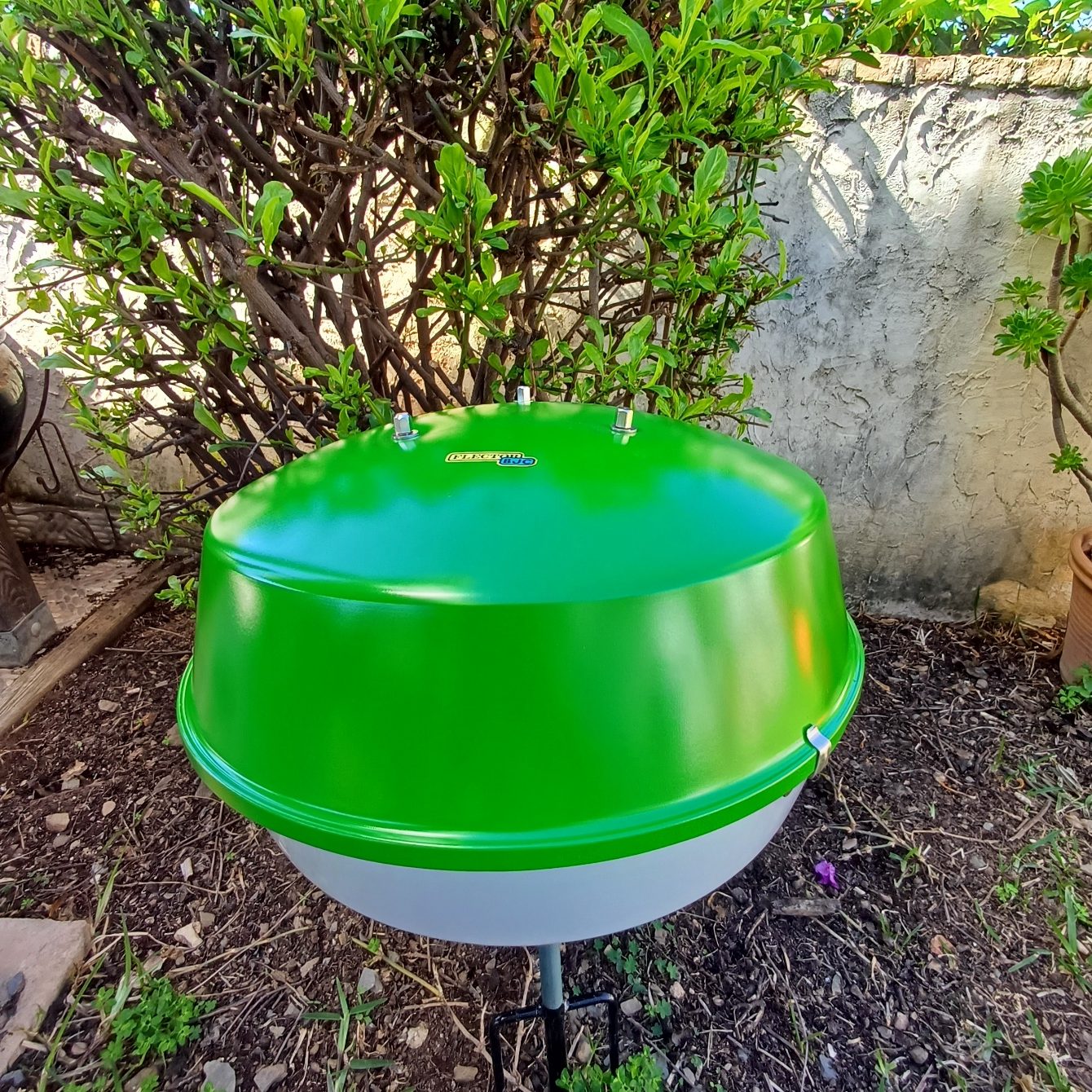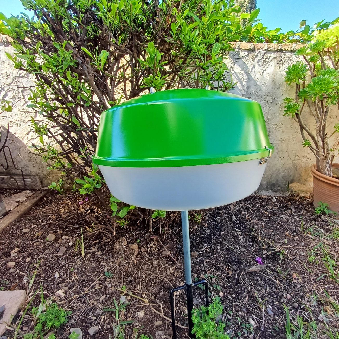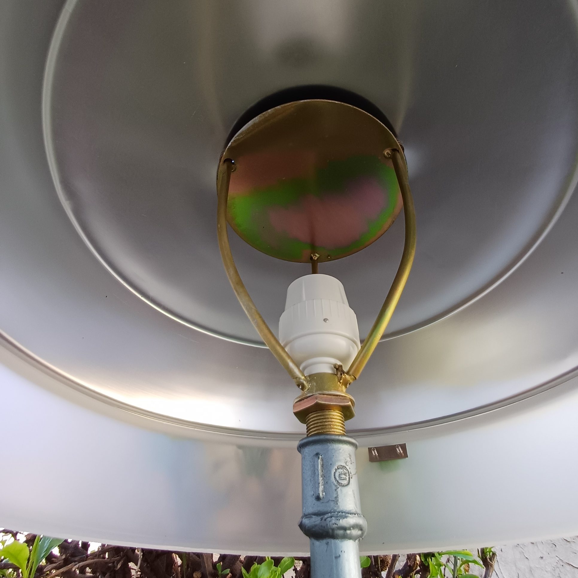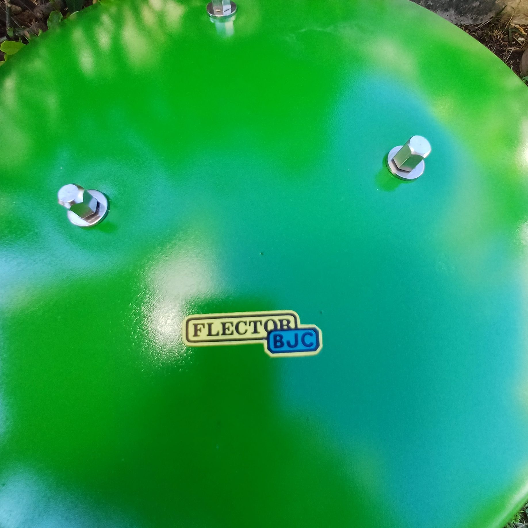 Lámpara de jardín de la serie Flector BJC, años 70, indicada para iluminar la entrada al jardín o un sendero. Forma de seta, en plástico verde. Se vende sin el pincho de hierro. Diámetro 35 cm. Altura 25 cm.