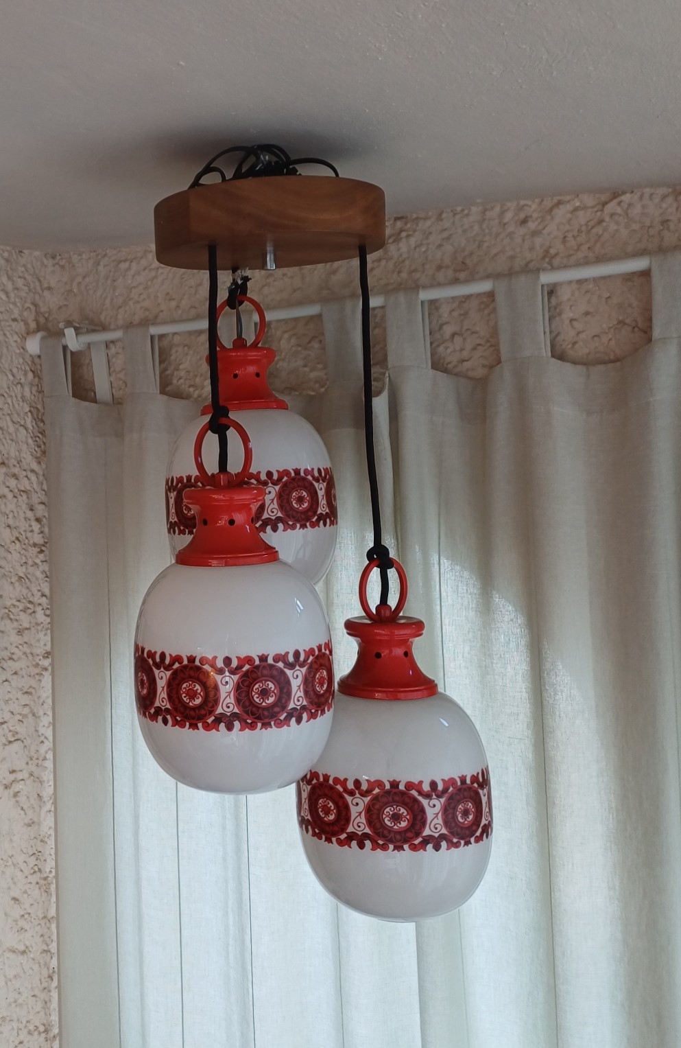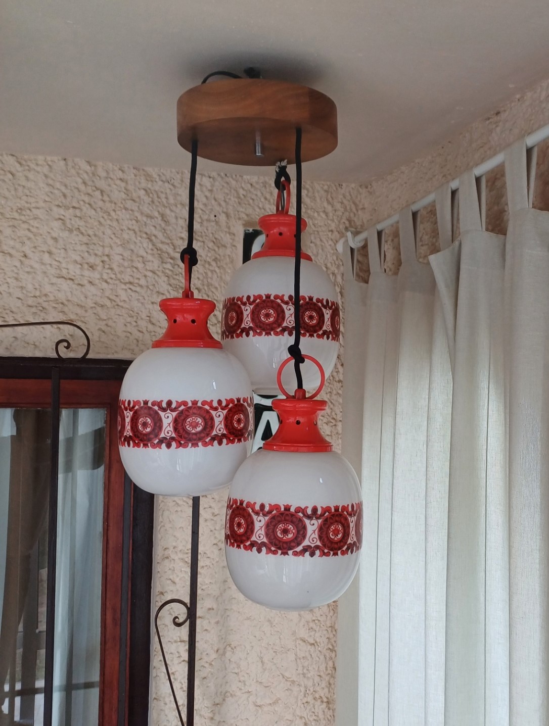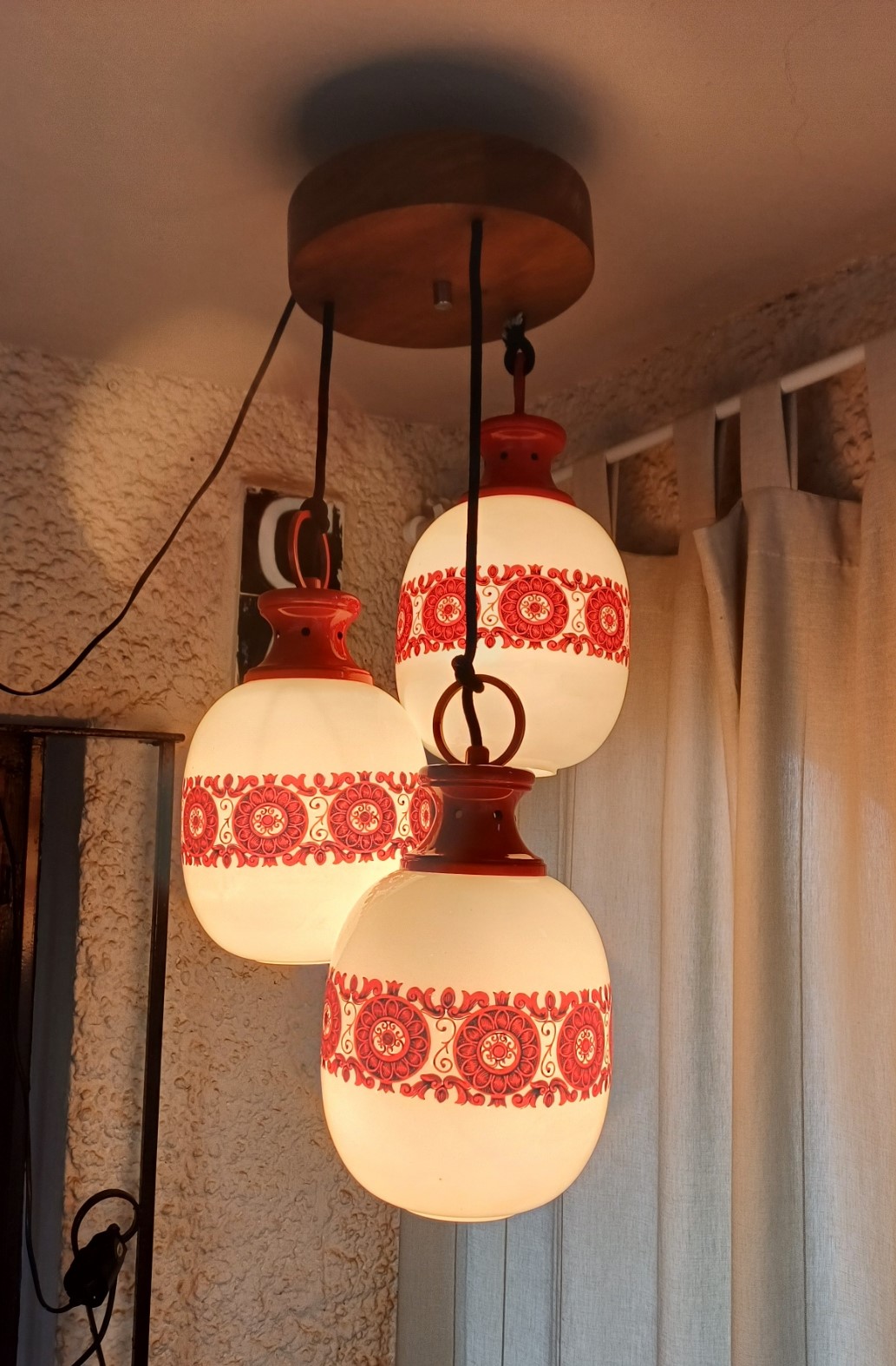 Lámpara triple de techo vintage. Con base de madera y tulipas de cristal.