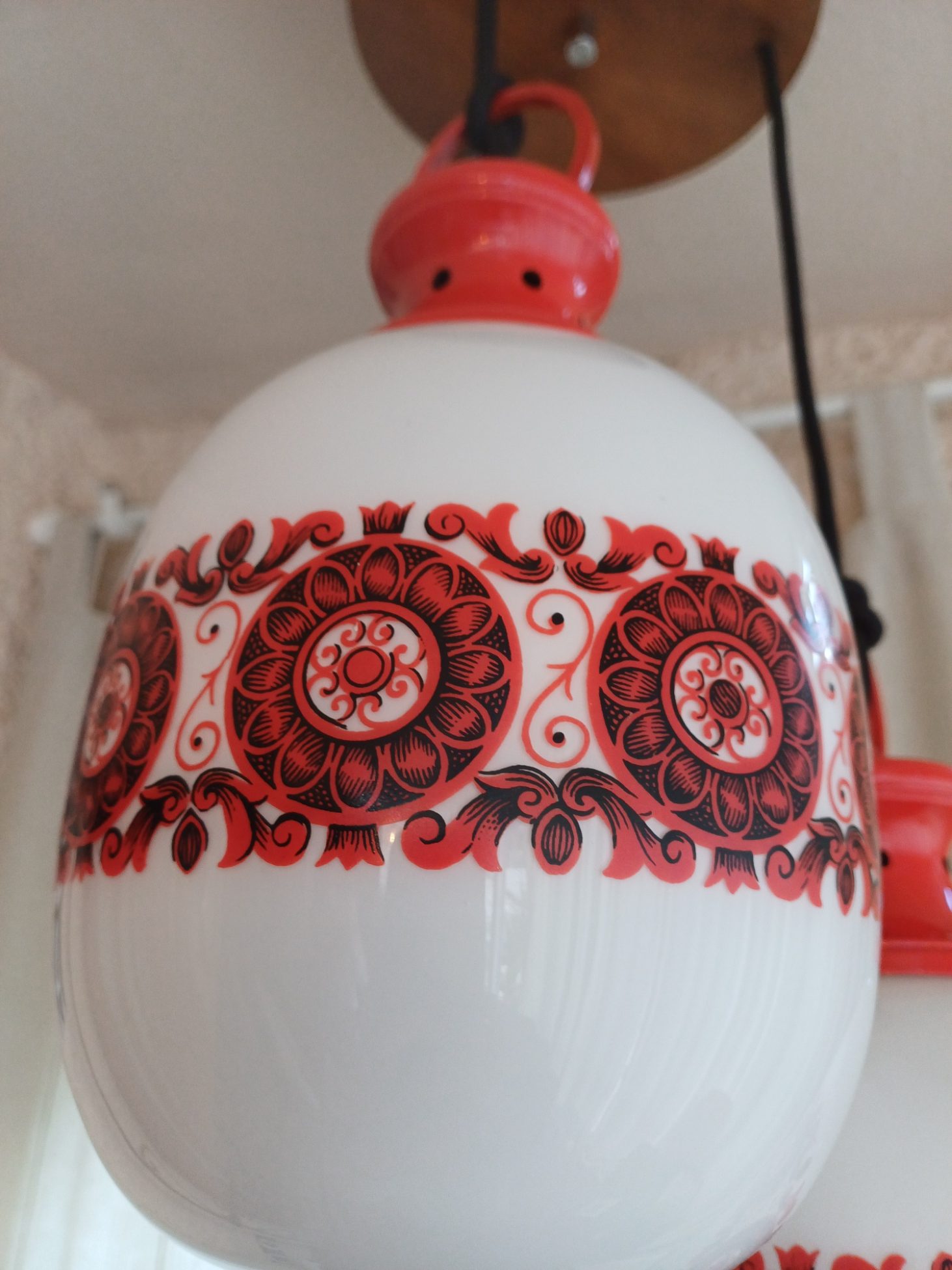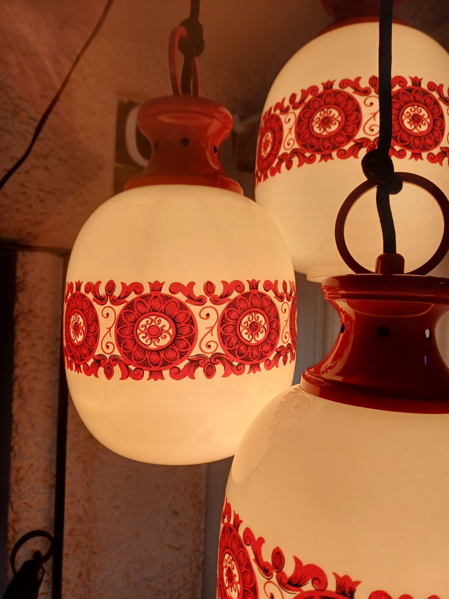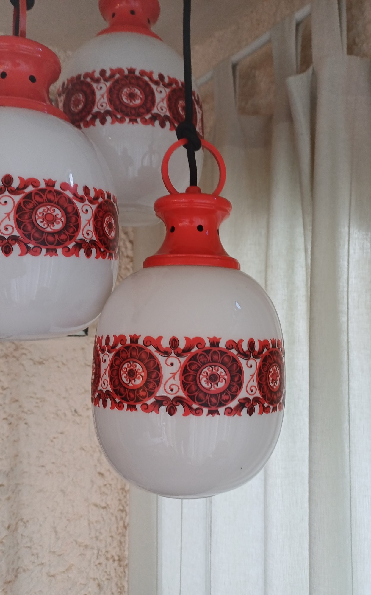 Lámpara triple de techo vintage. Con base de madera y tulipas de cristal.