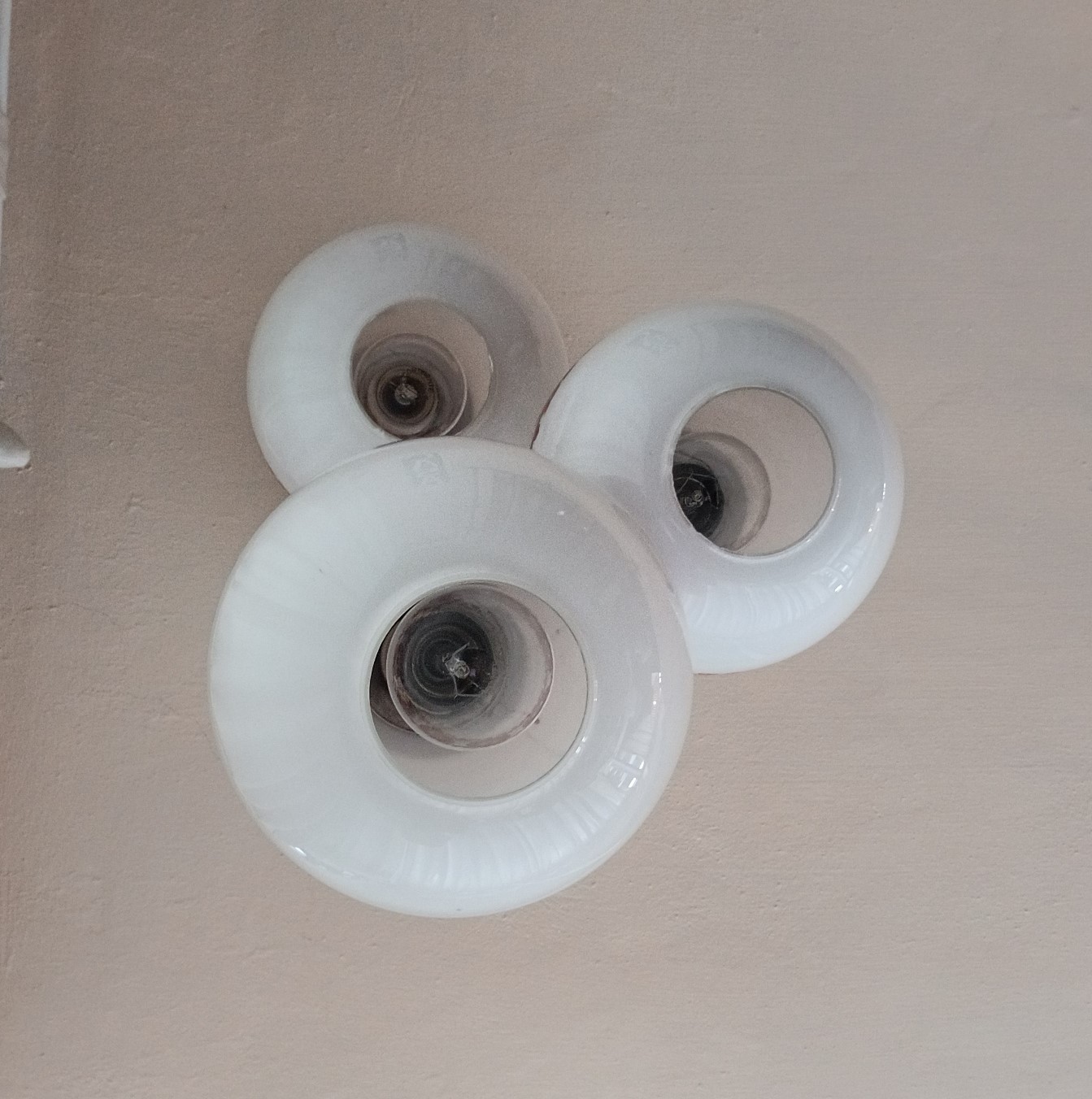 Lámpara triple de techo vintage. La base es de madera y las tres tulipas son de cristal opalino. Las tulipas miden 22 cm de largo y 18 cm de ancho.