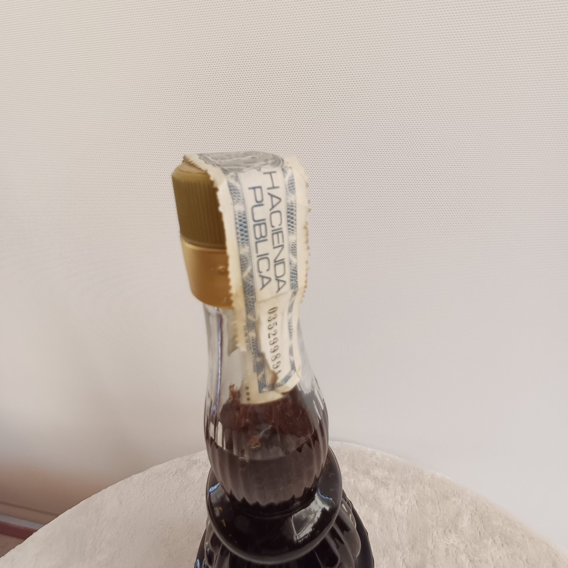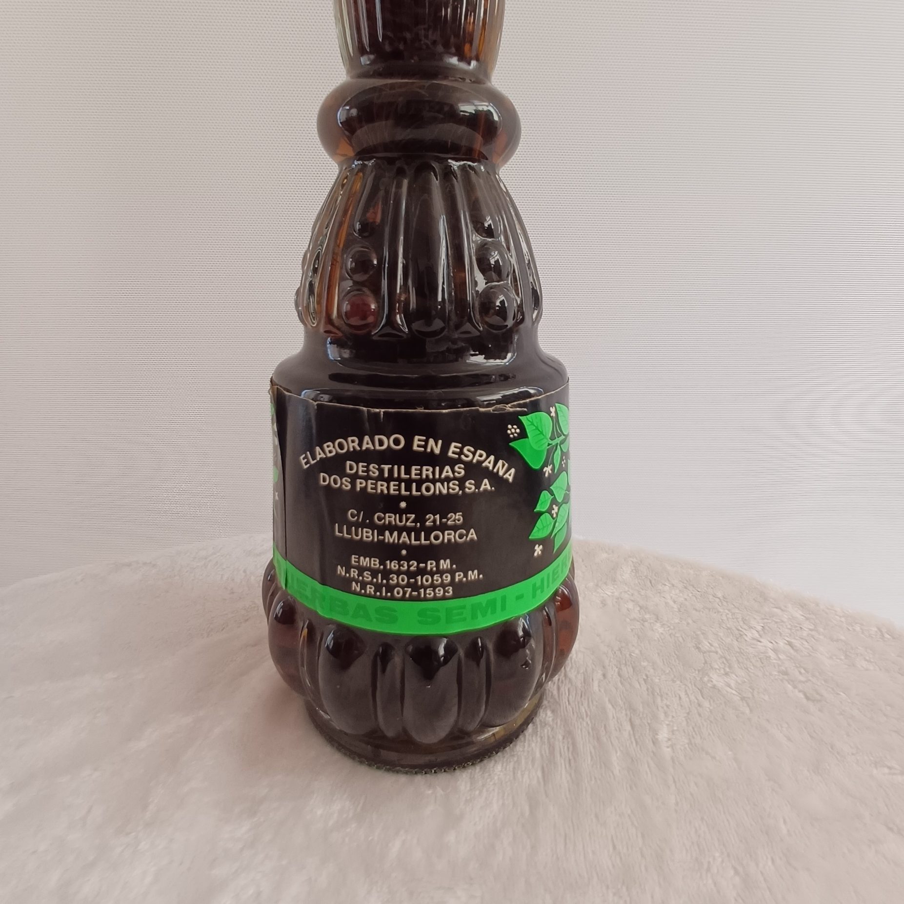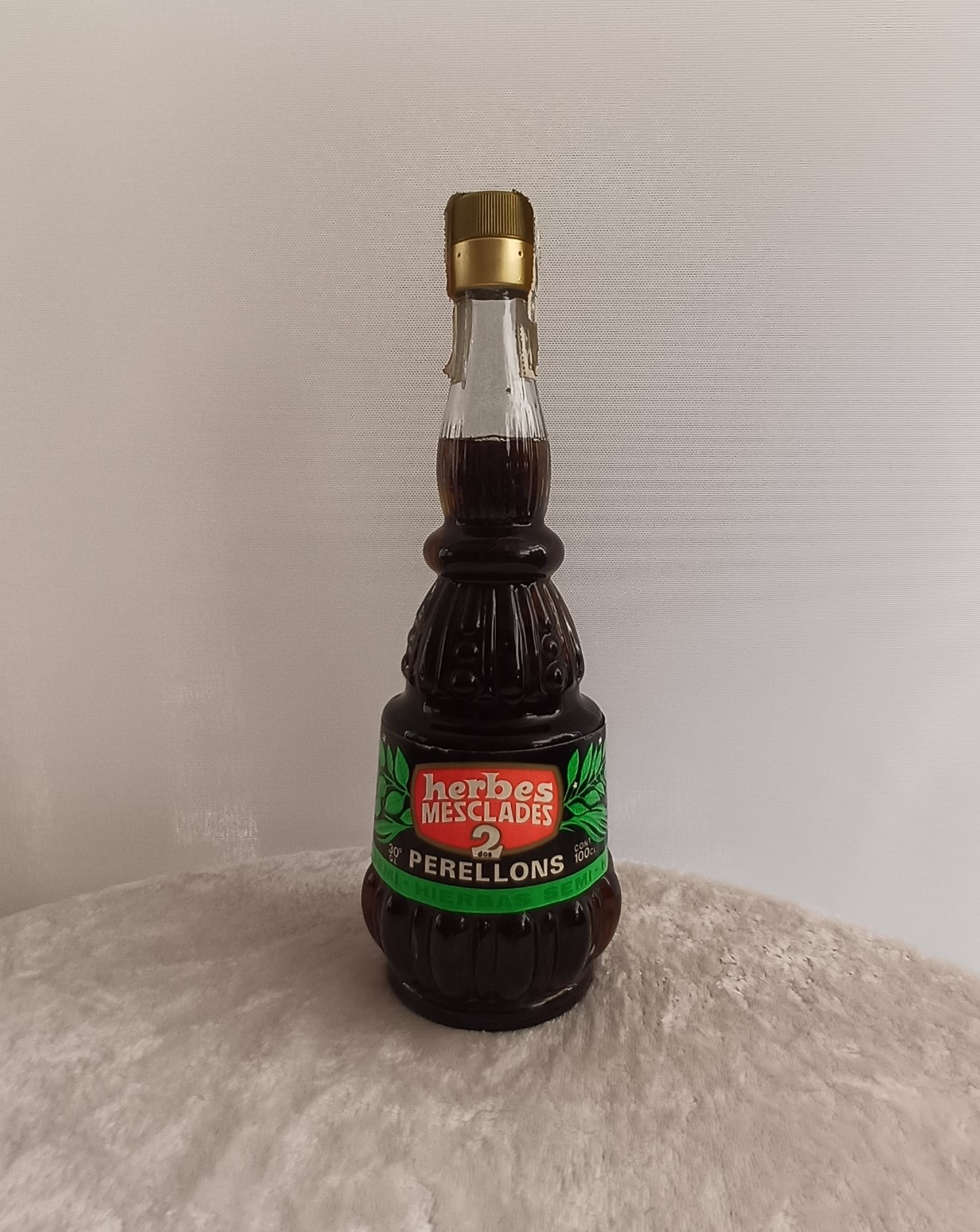 Botella de licor de hierbas 'Dos Perellons'. 30º, 1 litro. Sin empezar y con el precinto original del impuesto sobre el alcohol. Se desconoce el estado del licor. Ideal para coleccionistas. Altura de la botella: 32 cm.