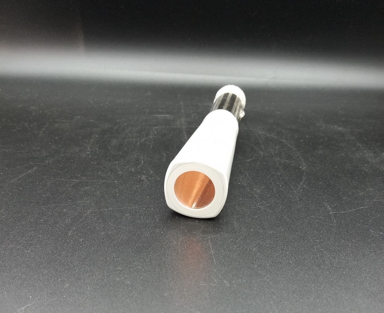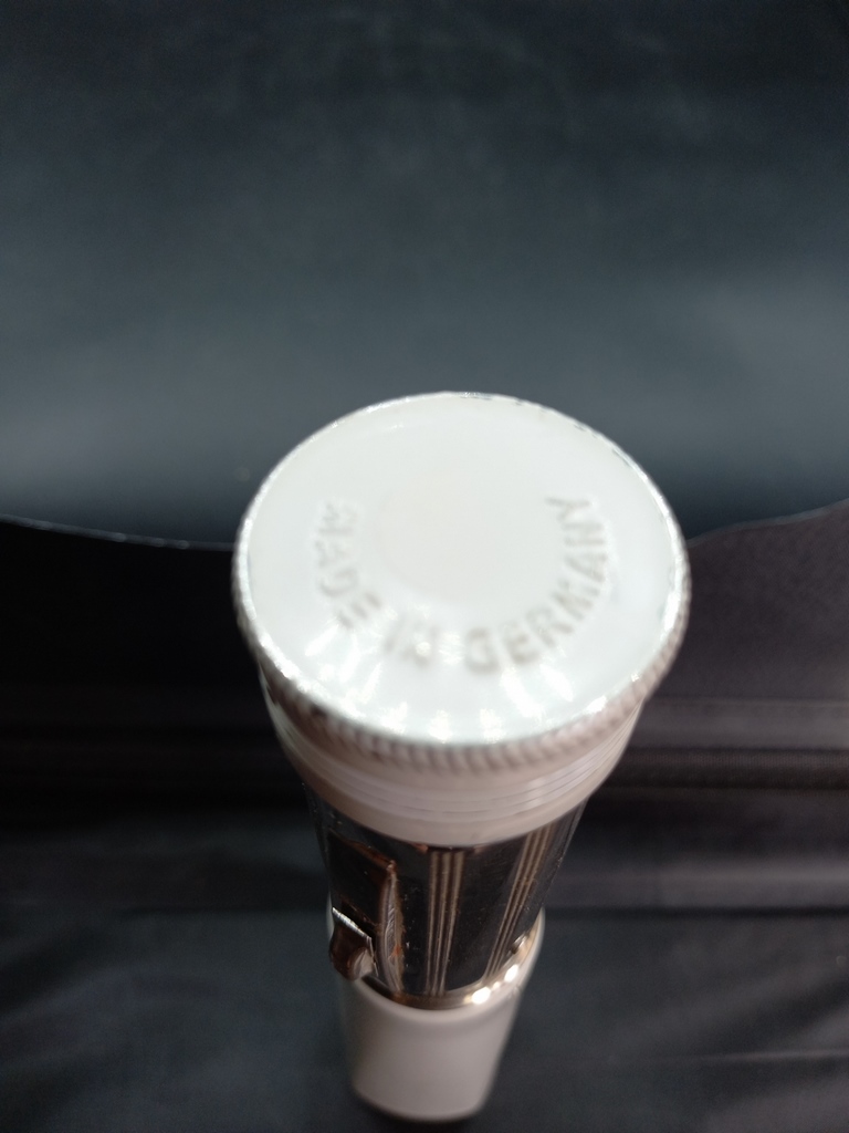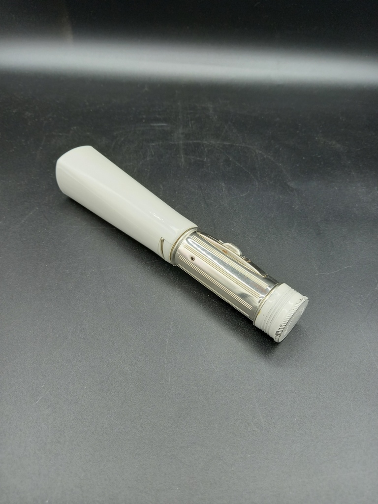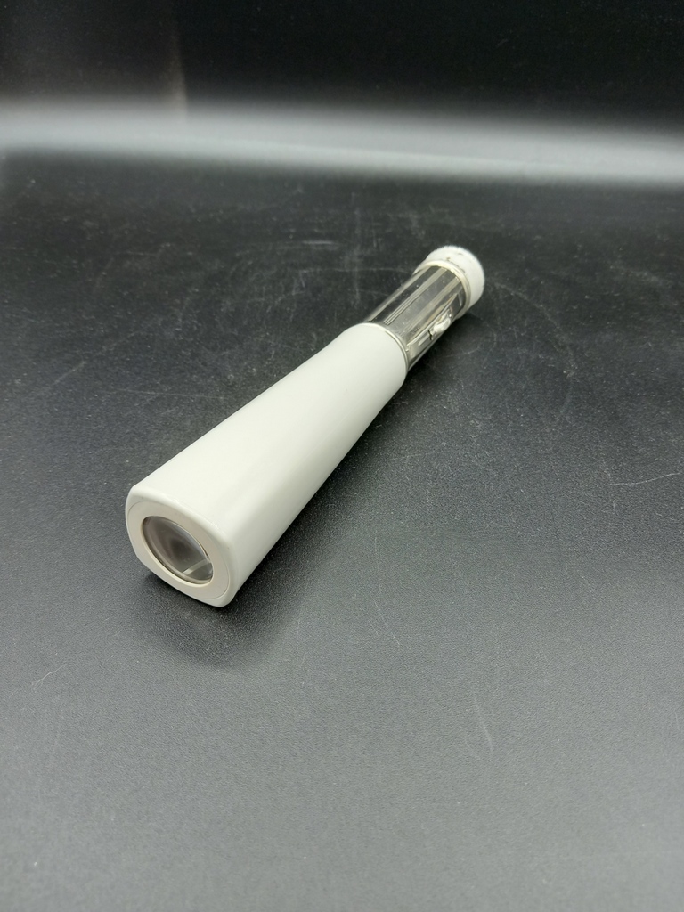 Linterna alemana de plástico blanco y metal. Funciona con dos baterías de 1,5 voltios R14P. Bajo alcance. Mejor como decorativa. 21 cm de largo.