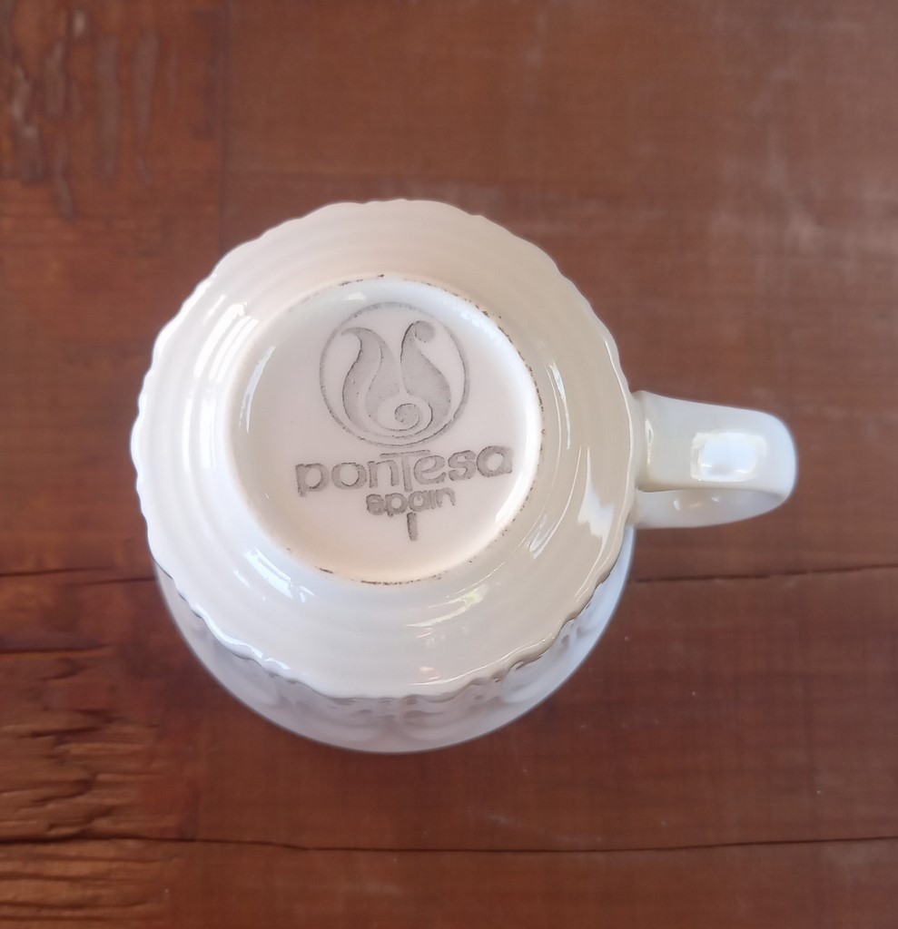 Lote de doce tazas blancas de café de la casa Pontesa. Una de ellas tiene un pequeño golpe (ver fotos). Medidas: alto 5,5 cm; diámetro 6,5 cm.