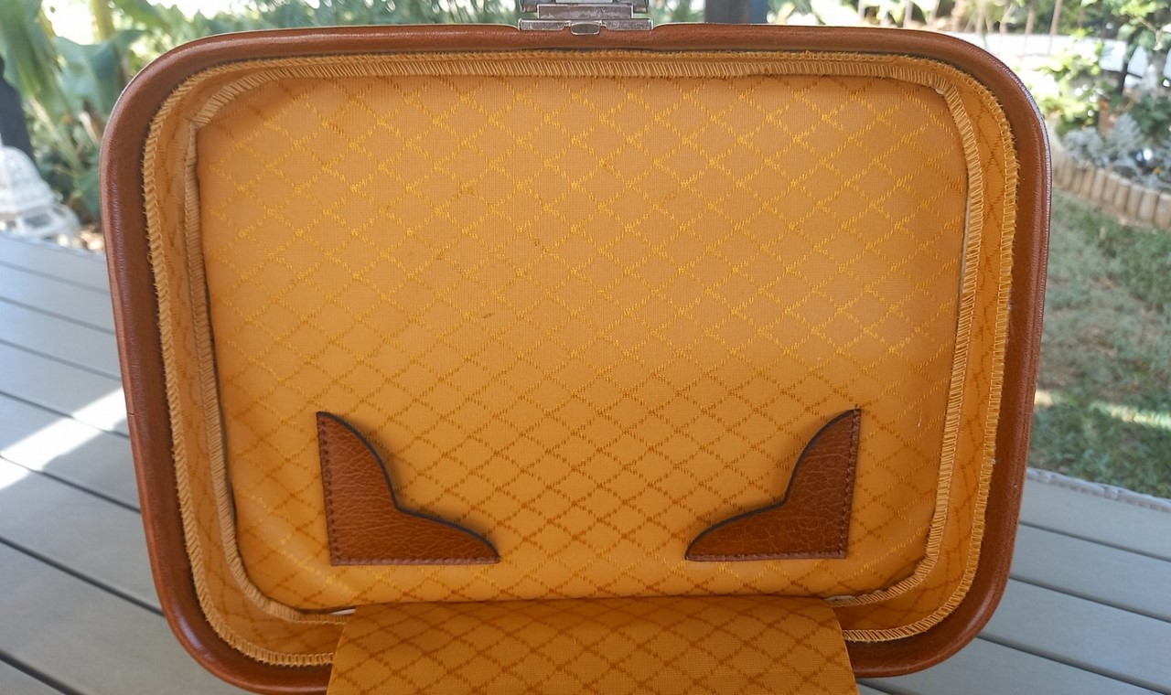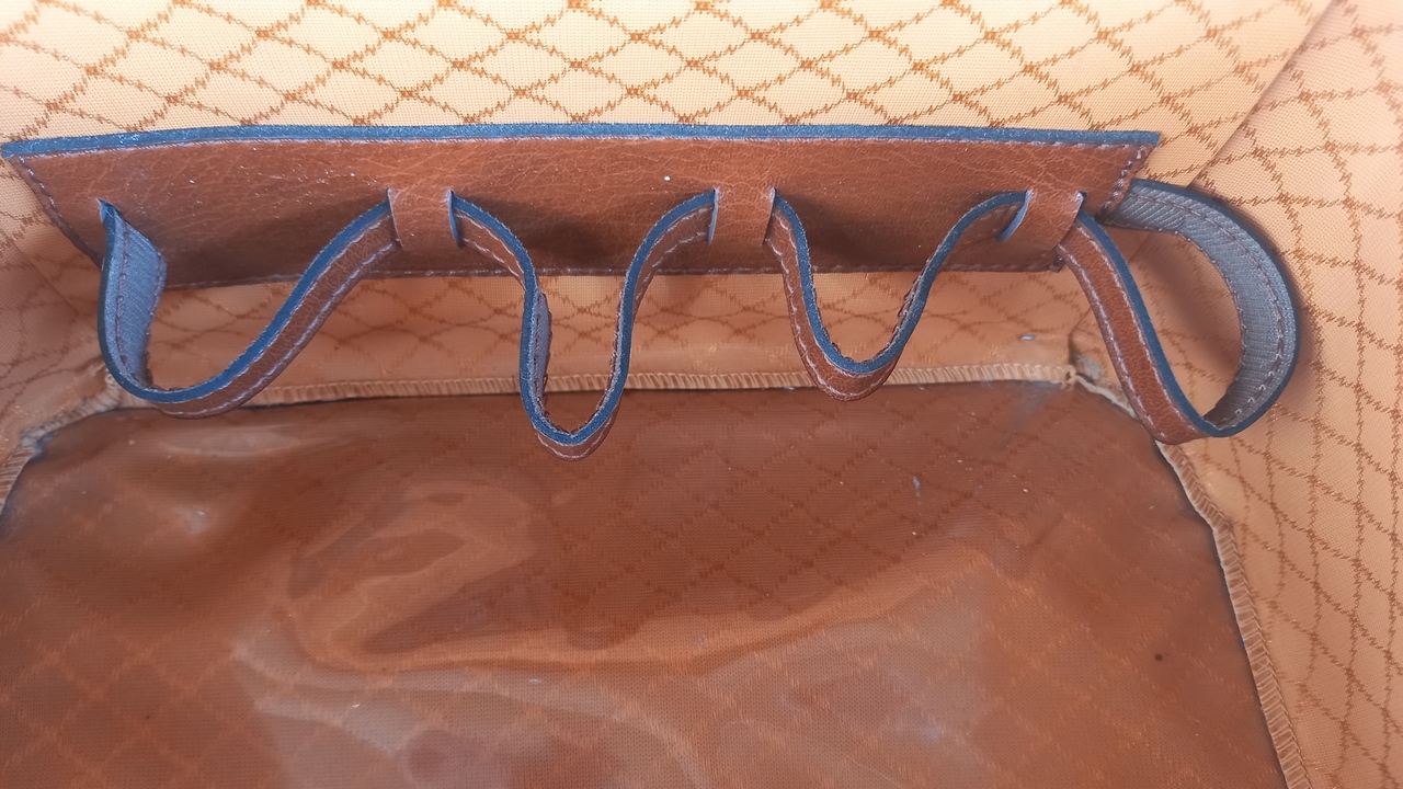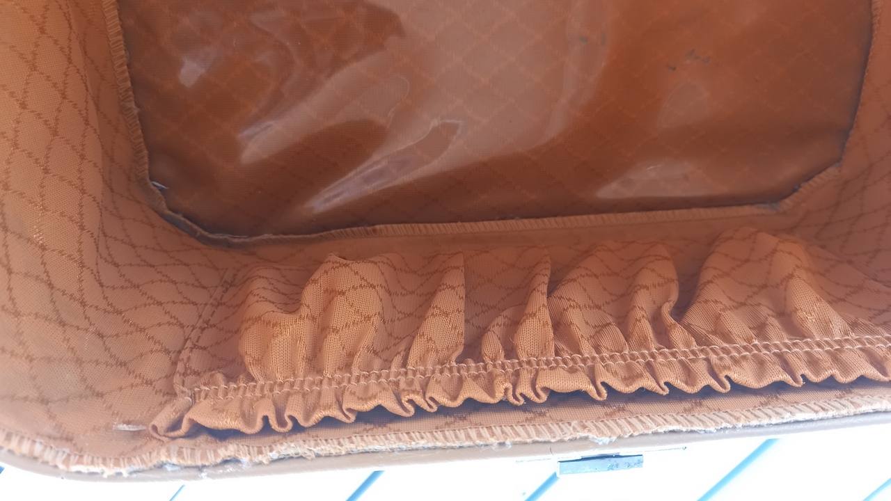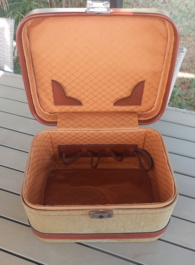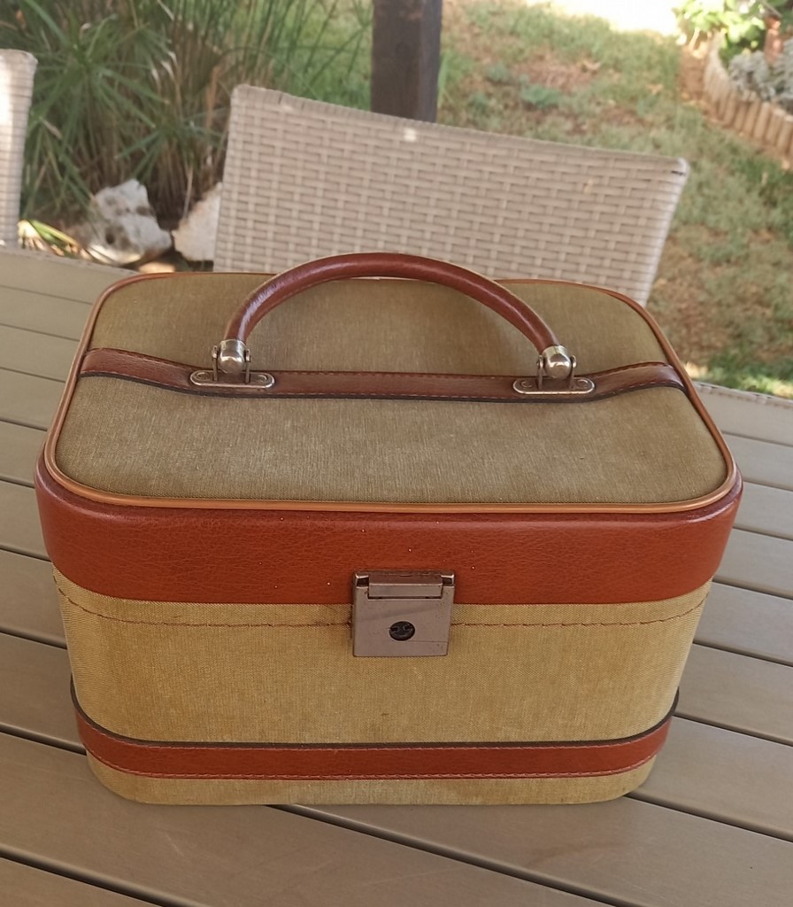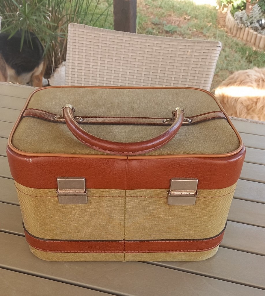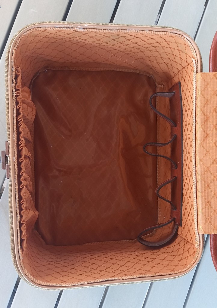 Maletín para ir de picnic o para guardar artículos de costura de polipiel y tela. Su interior está forrado de tela y tiene varios compartimentos regulables así como un bolsillo. No tiene llave. Medidas: largo 30 cm; ancho 23 cm; alto 18 cm.