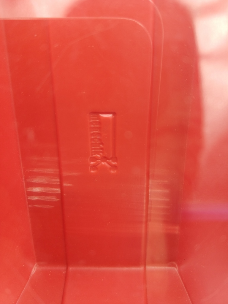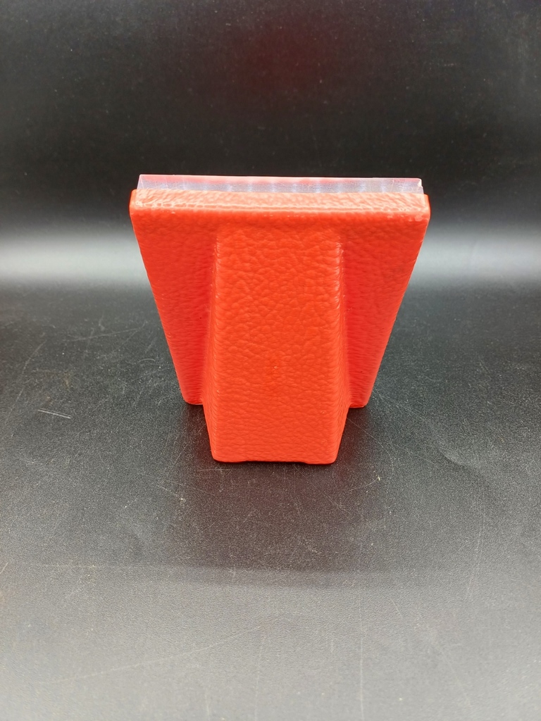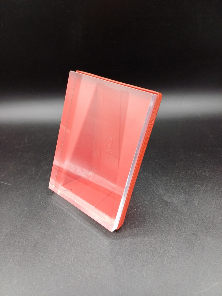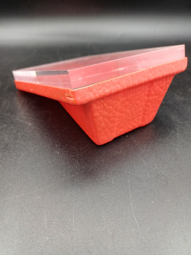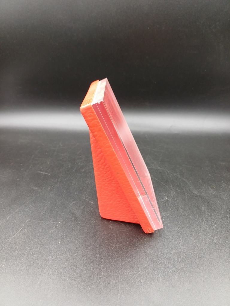 Marco para fotografías (10x14,5) hecho en metacrilato. Diseño de Menschik. La parte posterior es de plástico rojo y la parte frontal es un bloque de metacrilato de 1,8 cm de grosor. La parte posterior presenta un par de grietas en el plástico que no afecta a la funcionalidad del marco y además no se ven cuando se coloque una fotografía, puesto que quedan tapadas por ésta. Aunque en las fotos tiene un tono anaranjado, es completamente rojo.