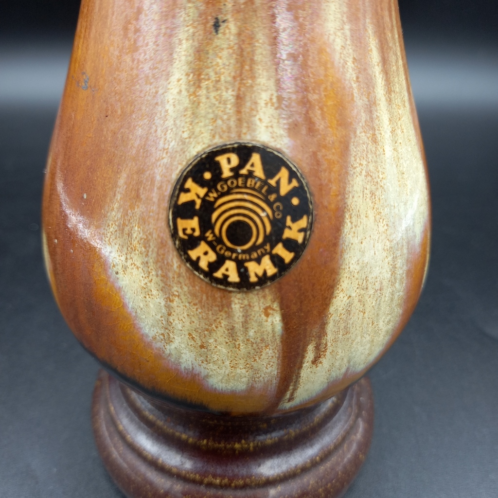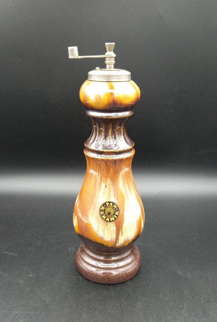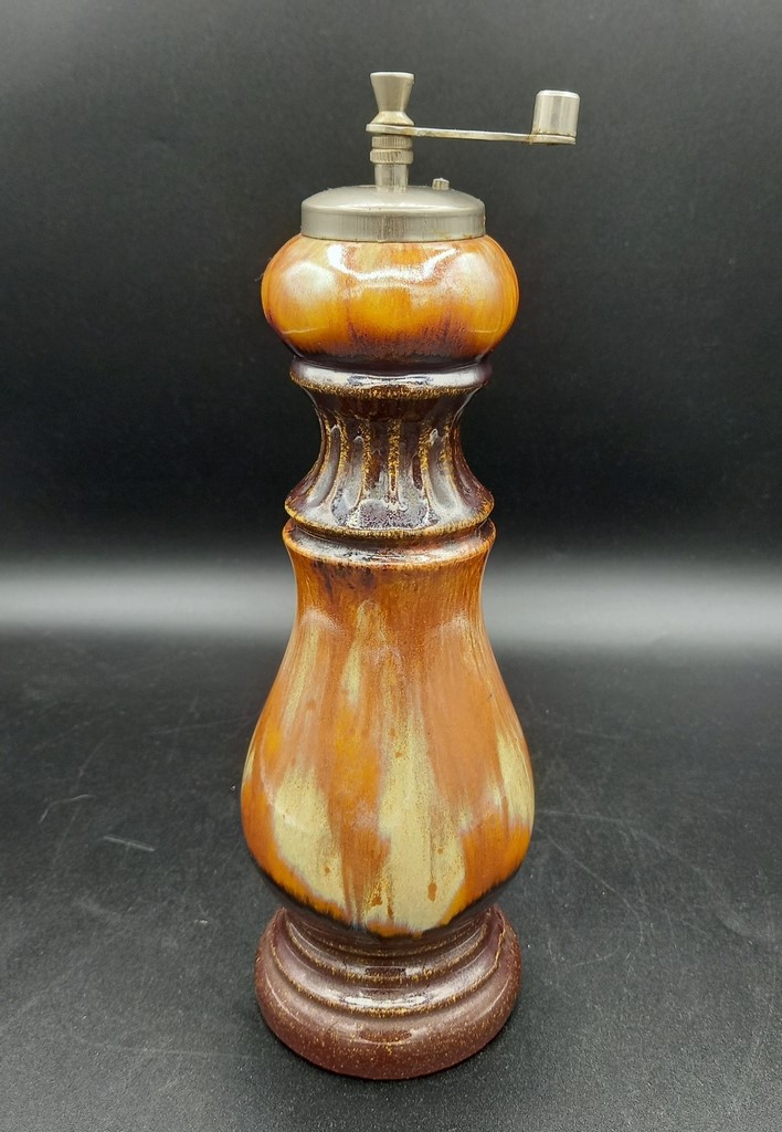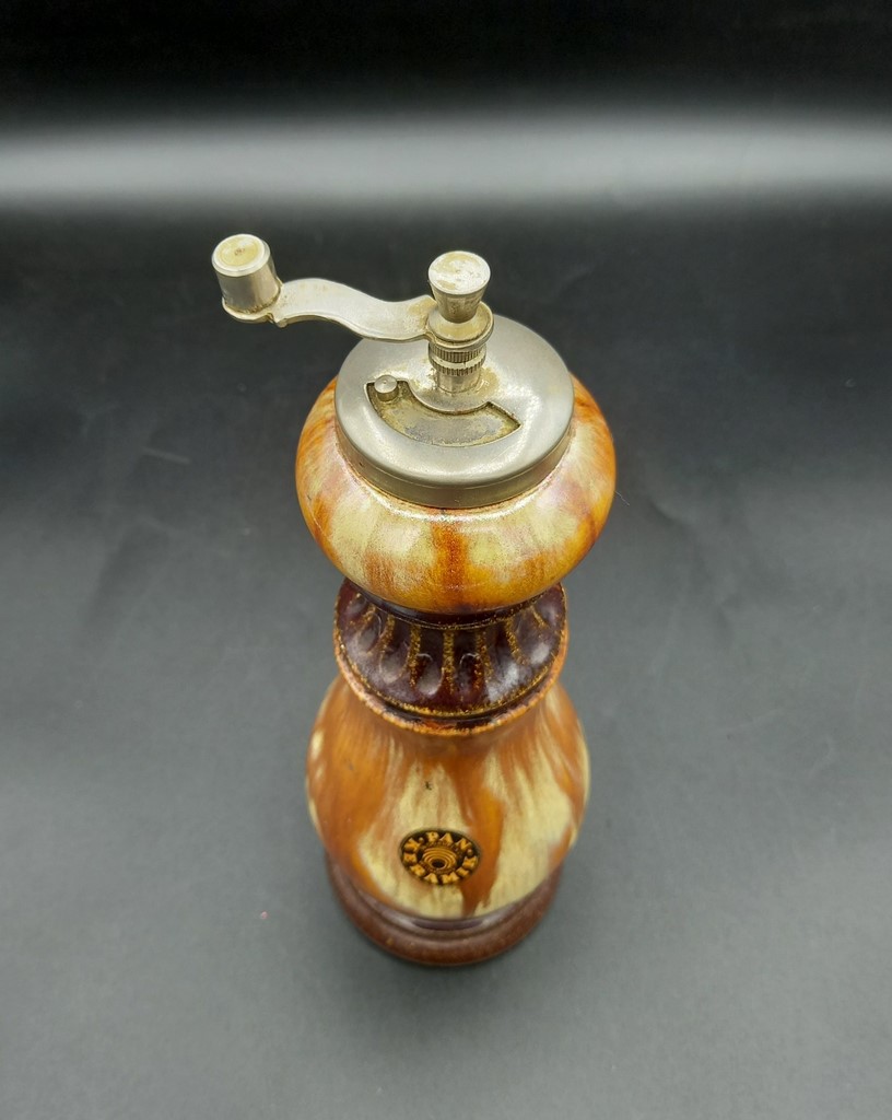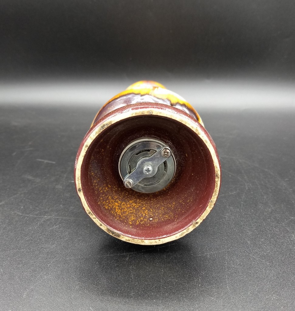 Molinillo de pimienta de cerámica fabricado en Alemania por la casa W. Goebel, empresa de fabricación de artículos de cerámica y porcelana que aún sigue activa desde su fundación en 1871. Medidas: 26 cm de alto, 8 cm en su parte más ancha.