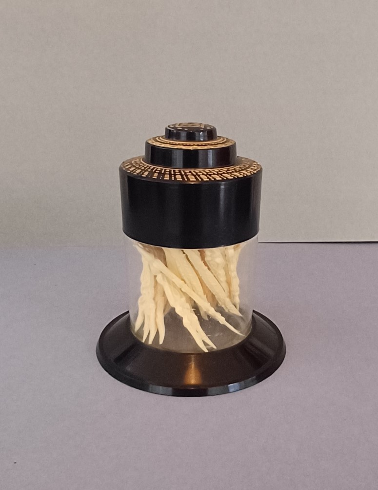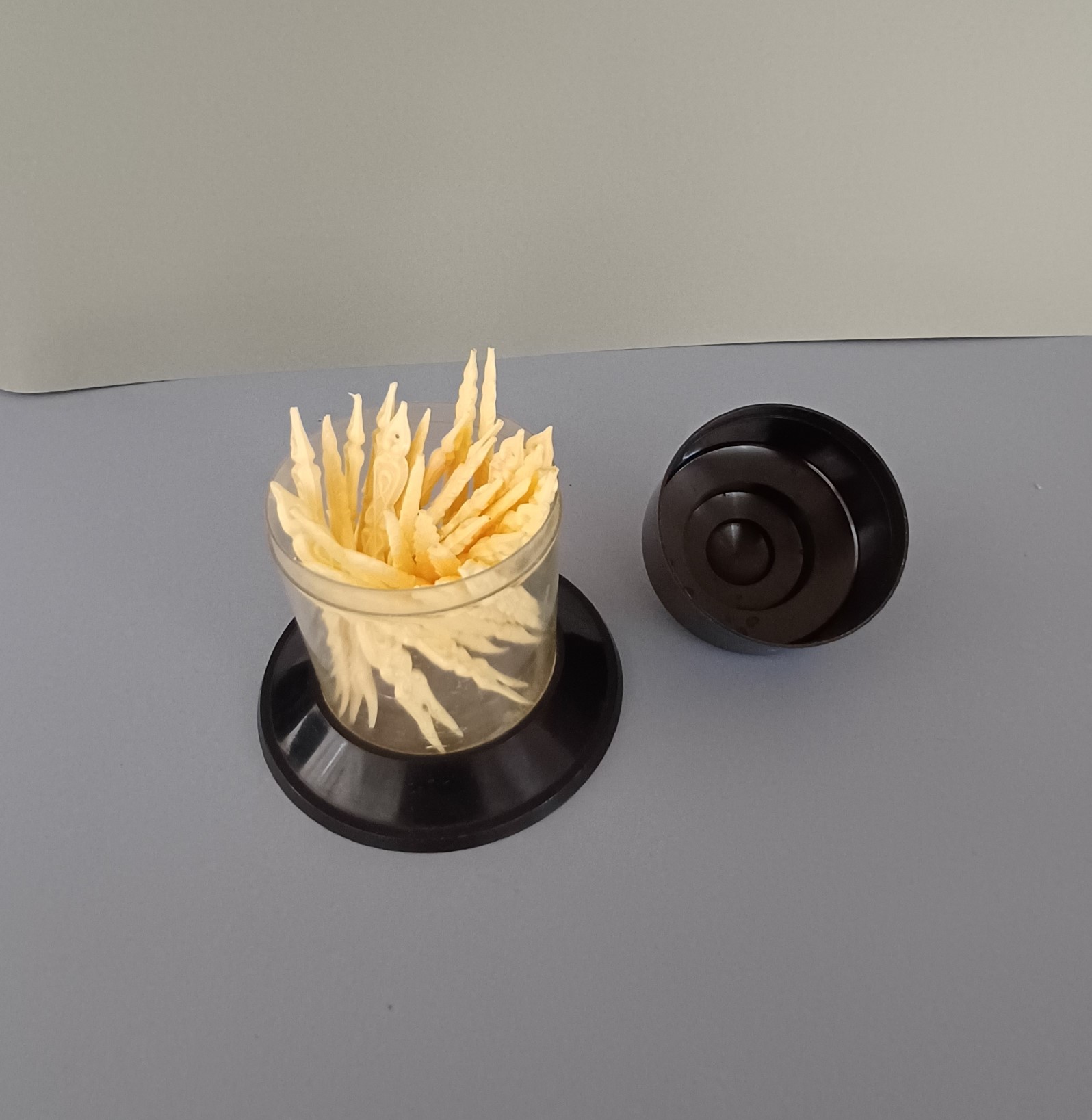 Palillero en su caja de plástico negro. Tiene en total 33 palillos de dos tipos distintos como muestran las fotos. Años 70, Se encuentra en perfecto estado.