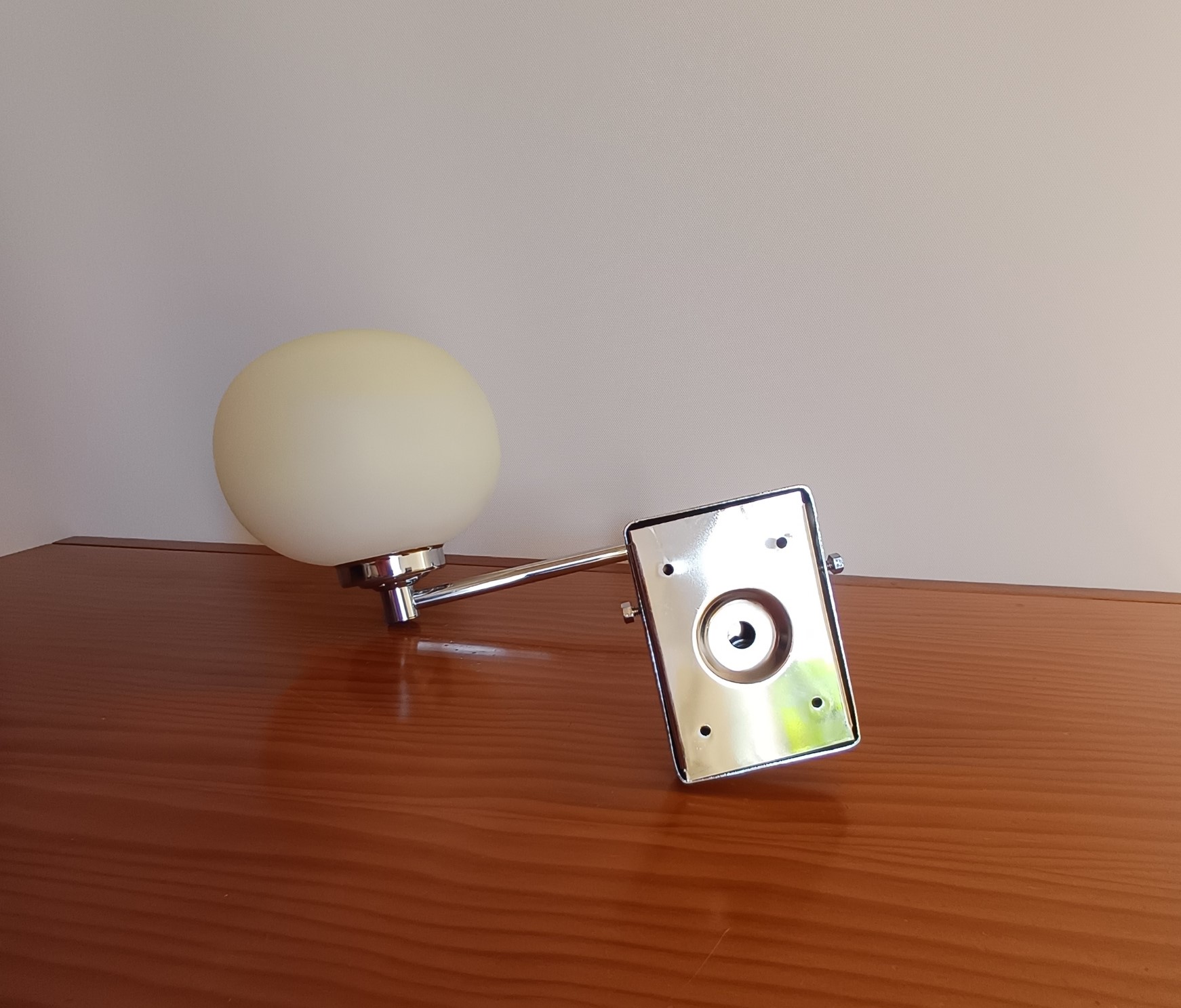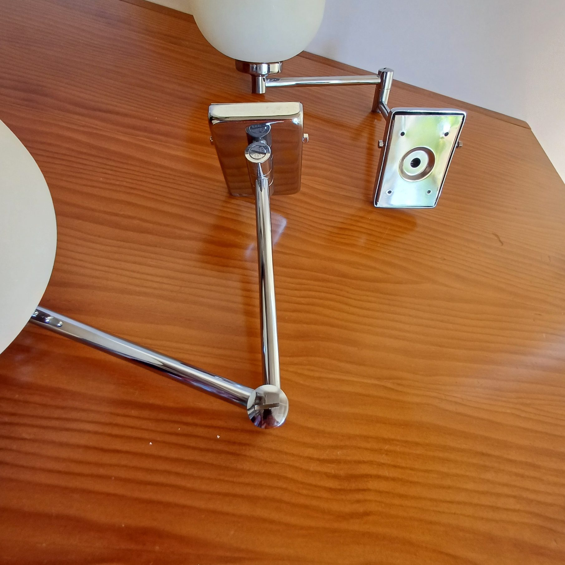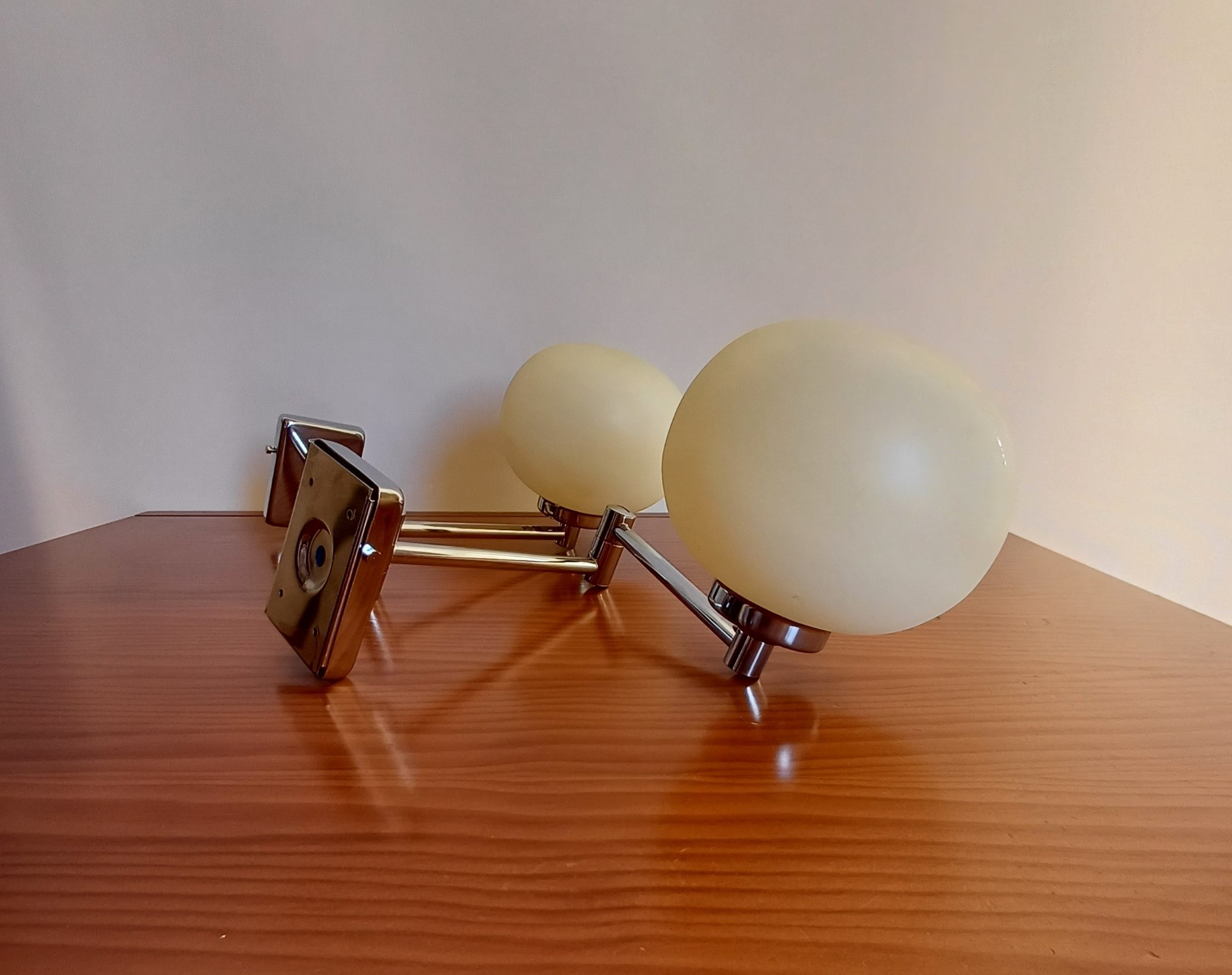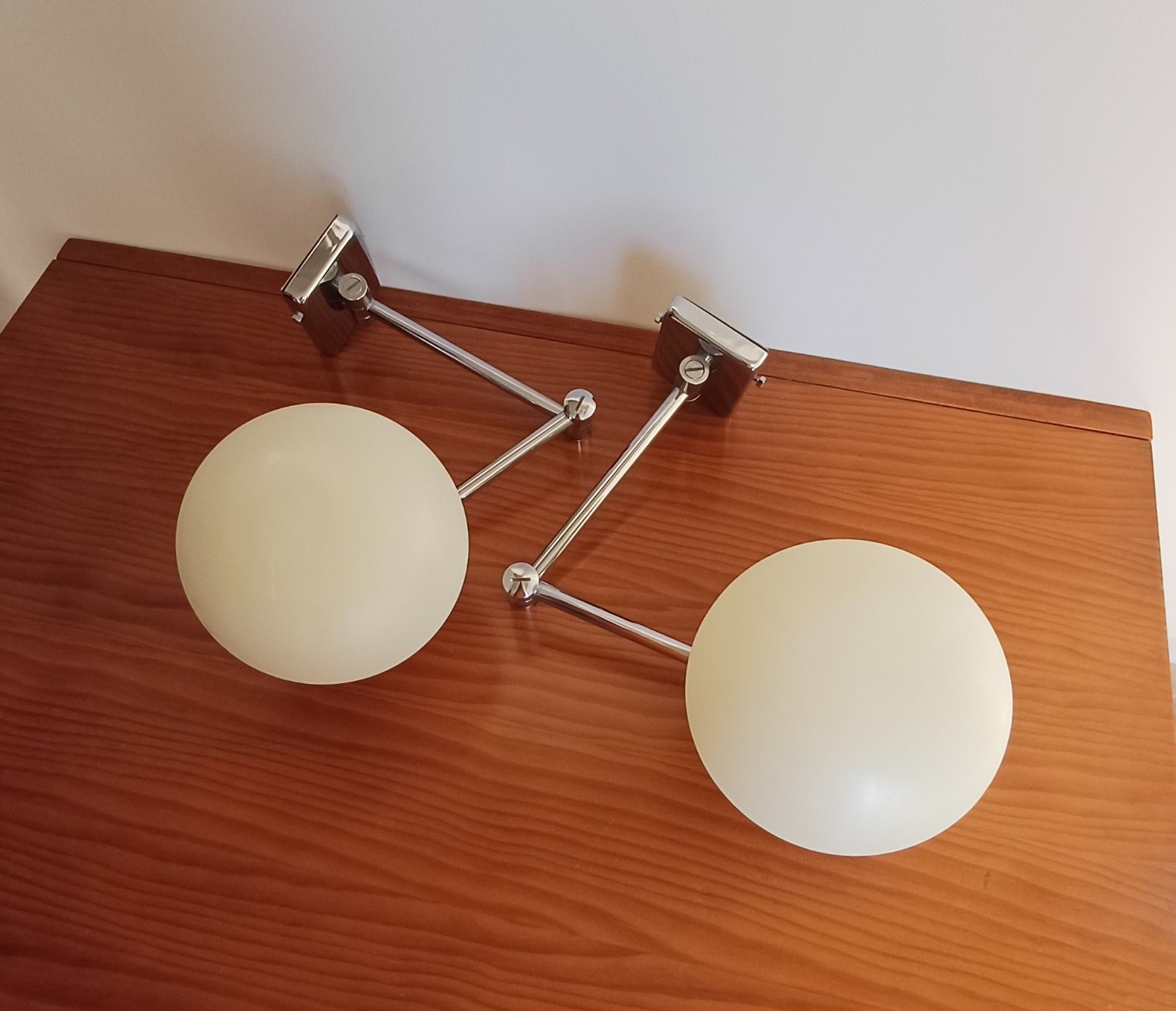 Pareja de apliques con brazos articulados cromados y tulipas ovaladas en cristal recubierto de una capa en blanco roto. Las tulipas tienen alguna ligera rozadura en la capa que las recubre, pero casi inapreciable. Longitud del brazo extendido: 43 cm sin contar la tulipa. Diámetro de la tulipa: 15 cm.