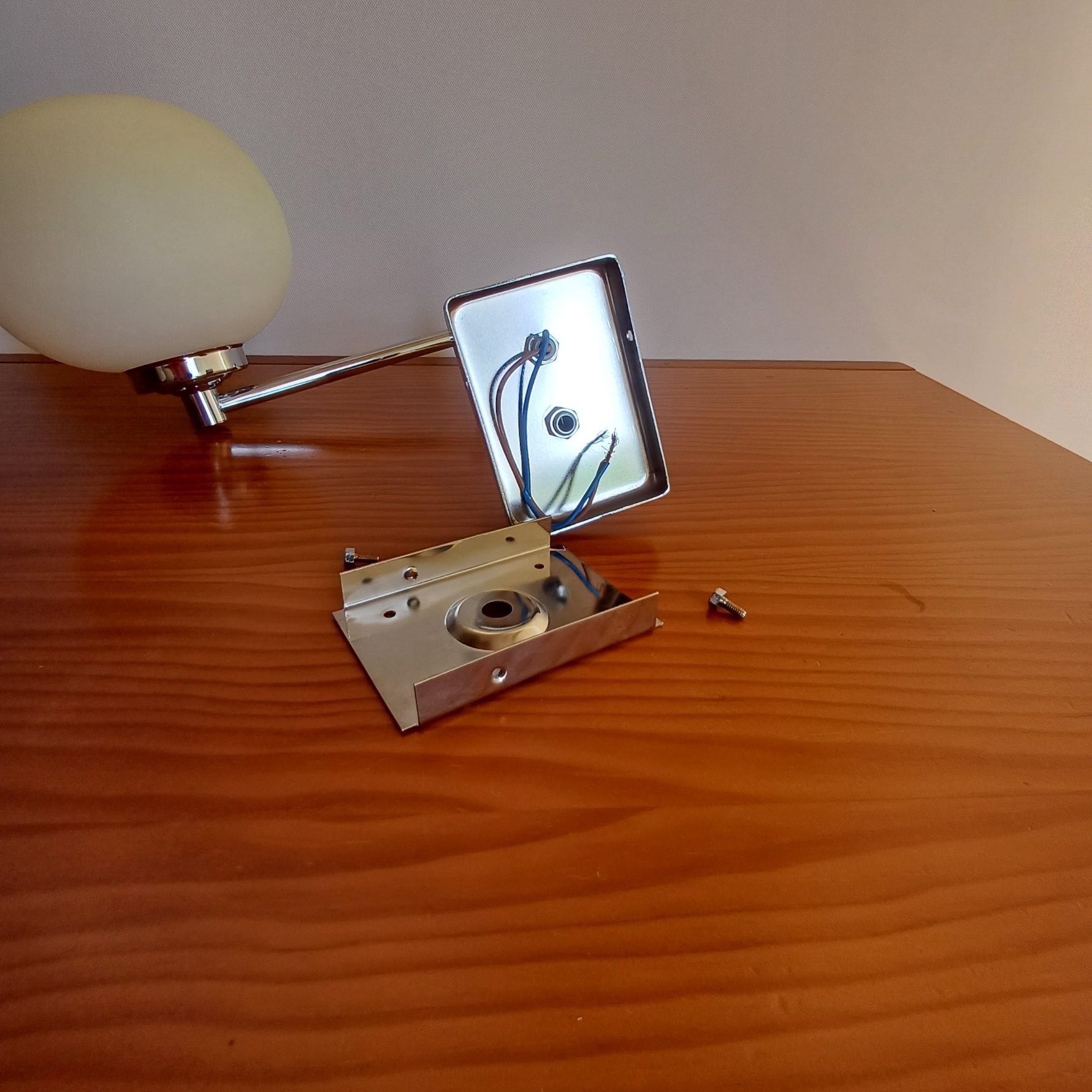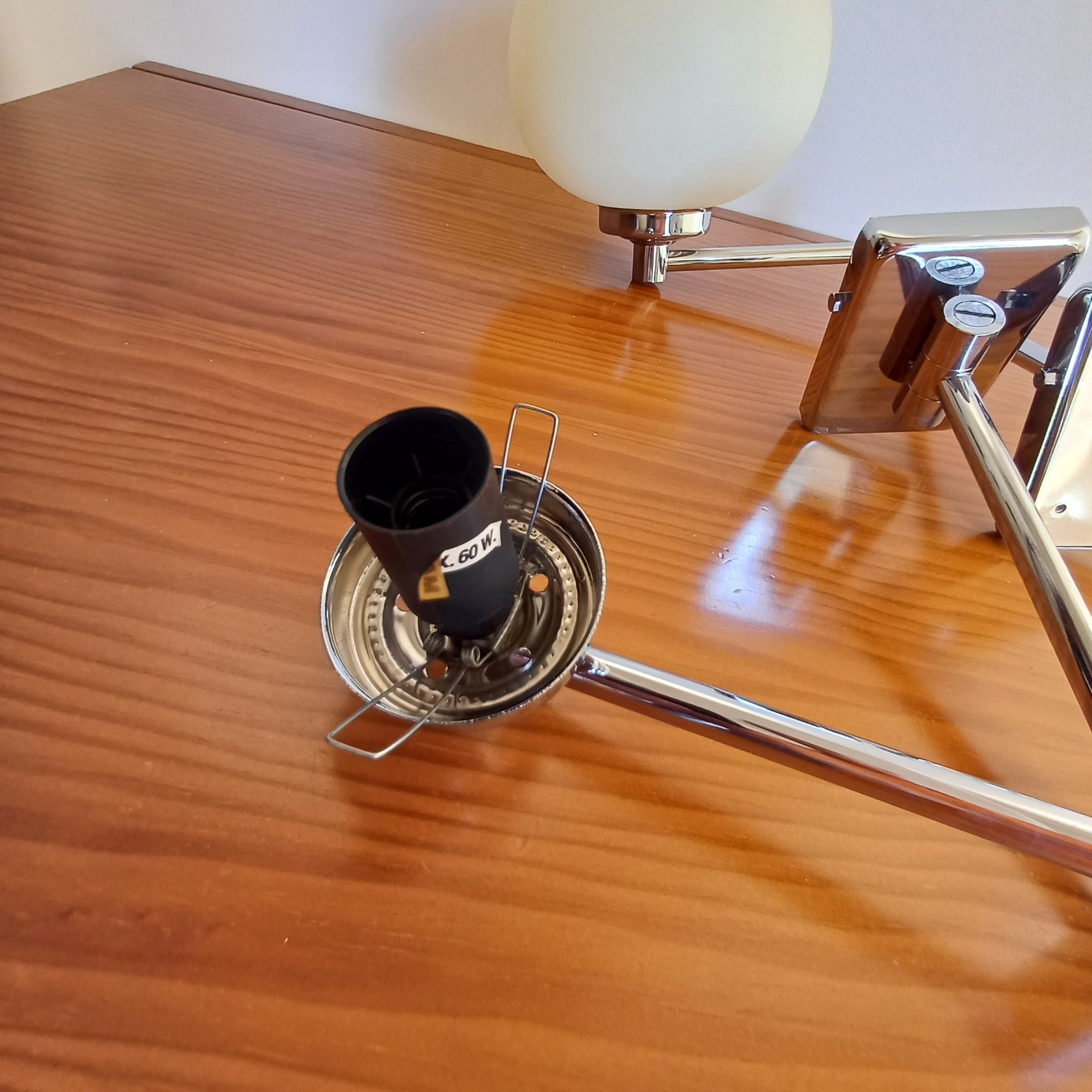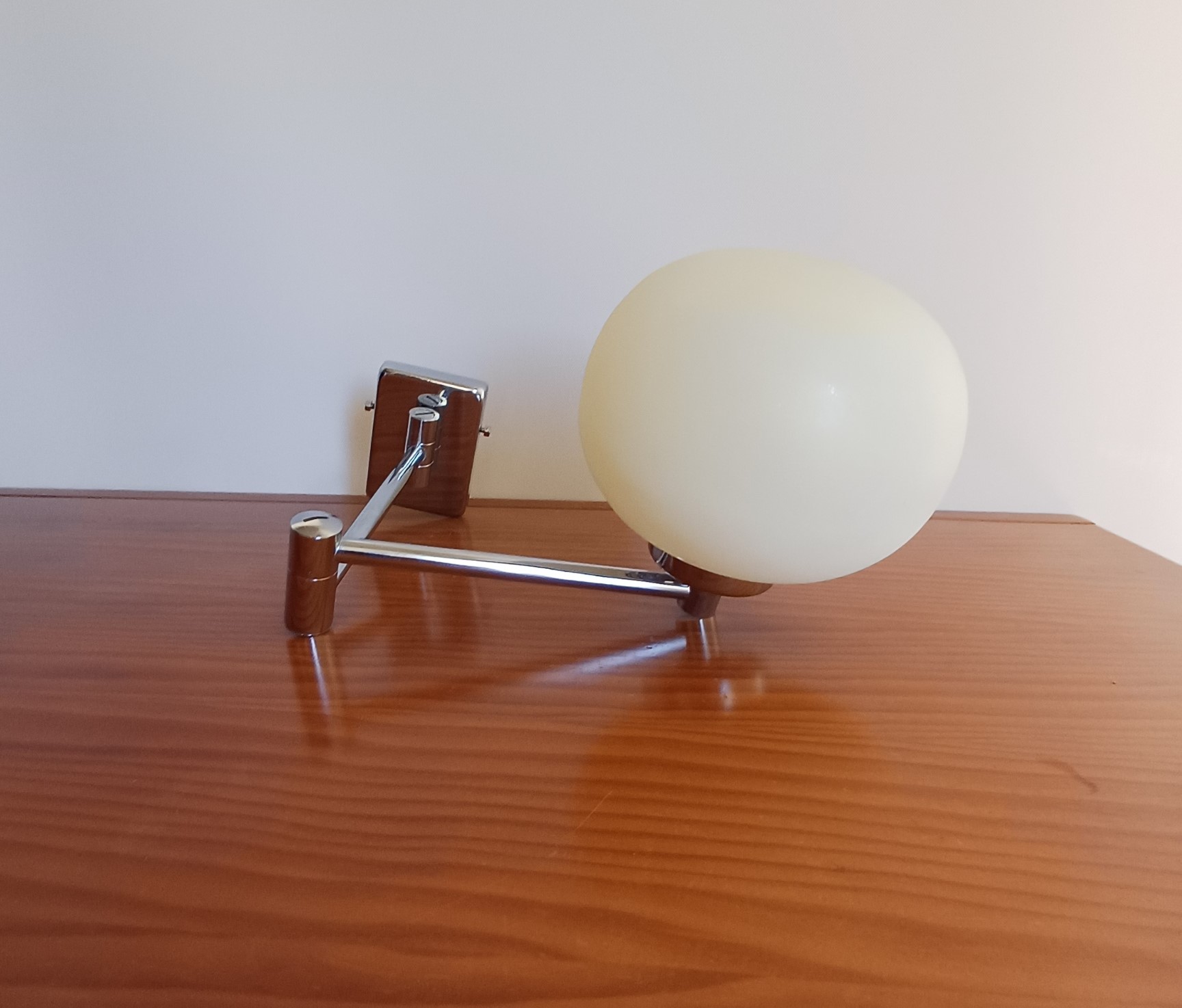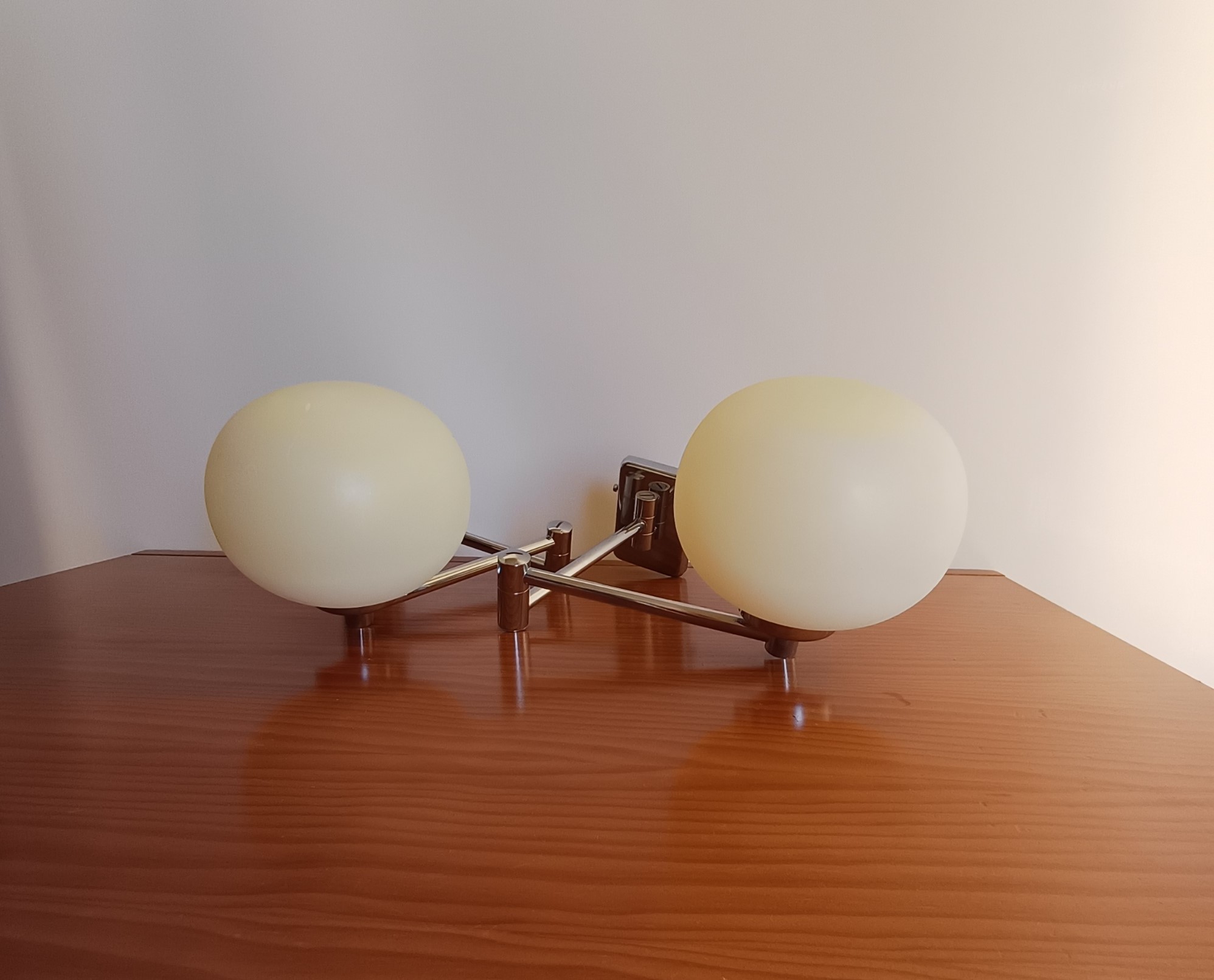 Pareja de apliques con brazos articulados cromados y tulipas ovaladas en cristal recubierto de una capa en blanco roto. Las tulipas tienen alguna ligera rozadura en la capa que las recubre, pero casi inapreciable. Longitud del brazo extendido: 43 cm sin contar la tulipa. Diámetro de la tulipa: 15 cm.