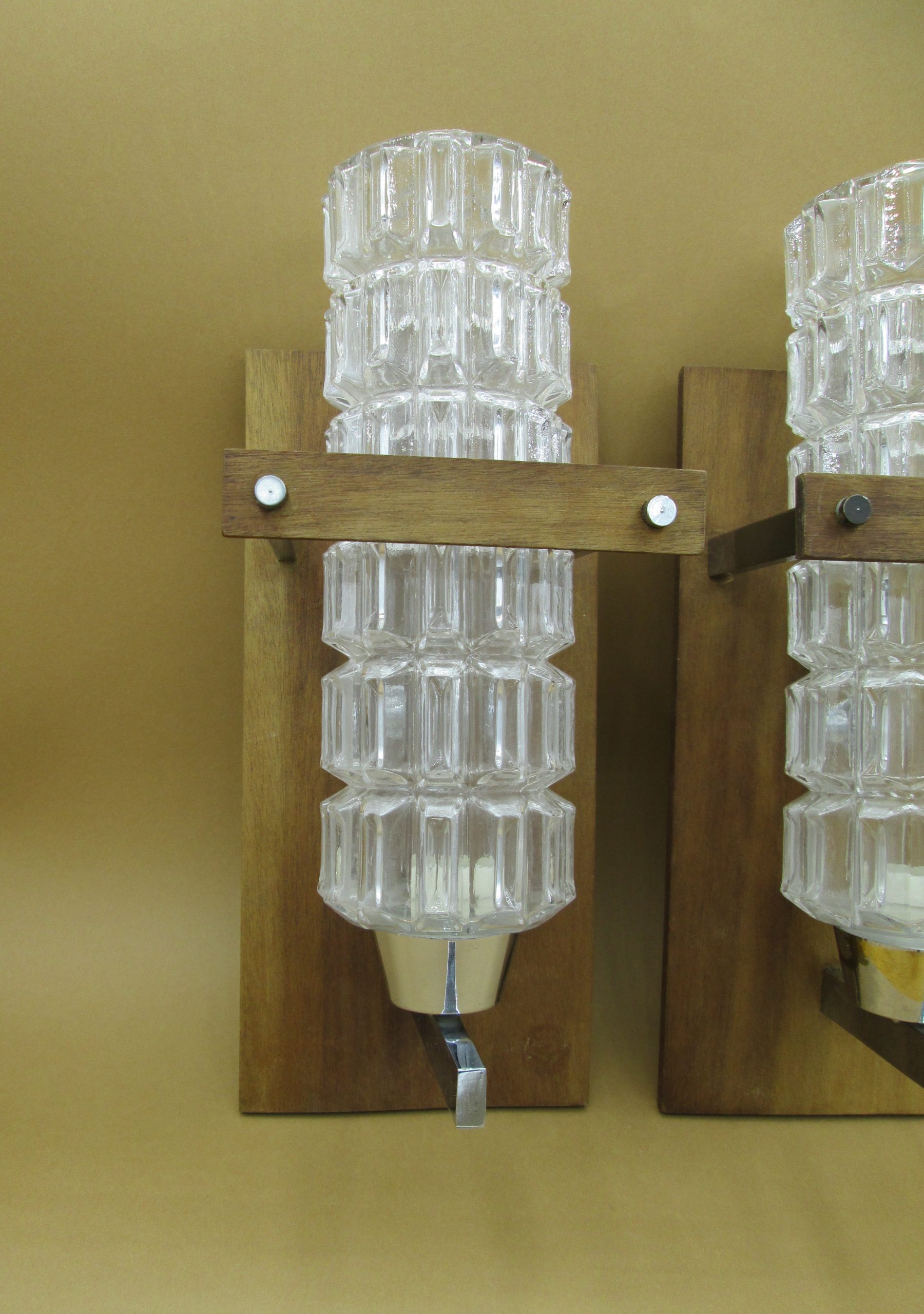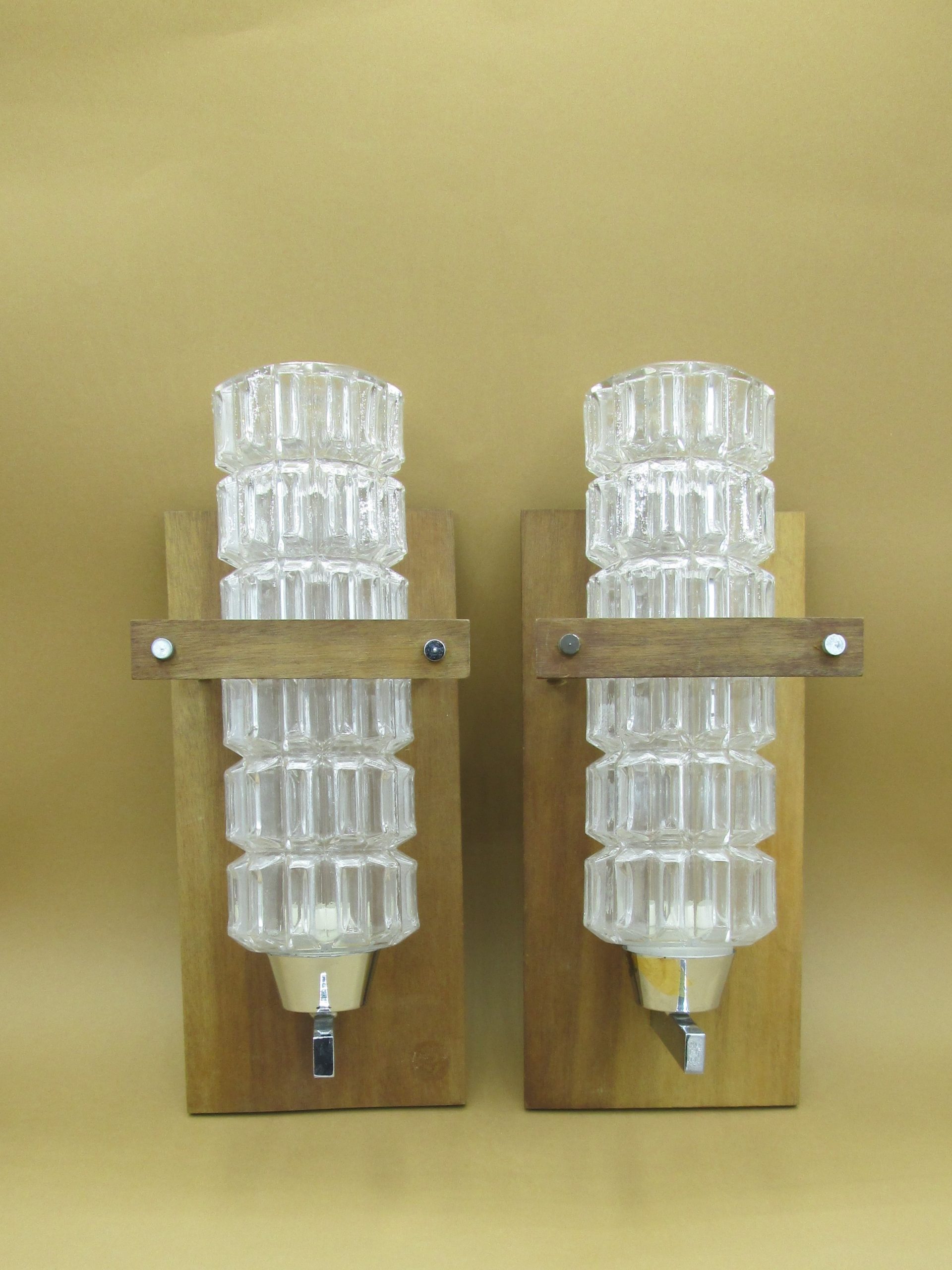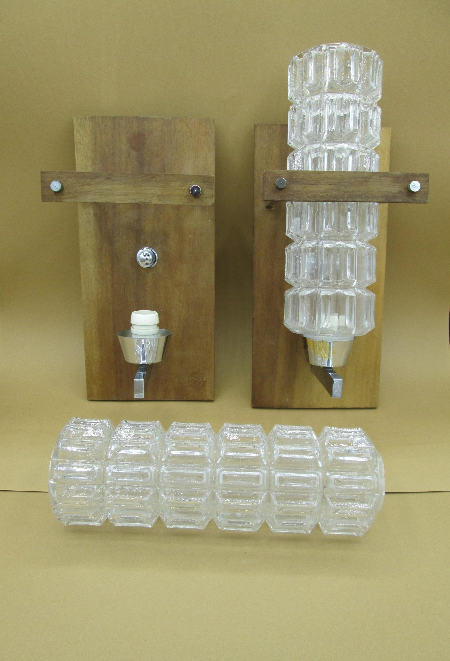 Pareja de apliques con base de madera y metal y tulipas de cristal prensado. Medidas de la base de madera: 27 cm x 12,5 cm. Altura de la tulipa de cristal 25 cm. Una tiene parcialmente levantado el cromado inferior como se puede apreciar en las fotos. Una de las tulipas tiene una pequeña grieta en su parte inferior como se aprecia en las fotos.