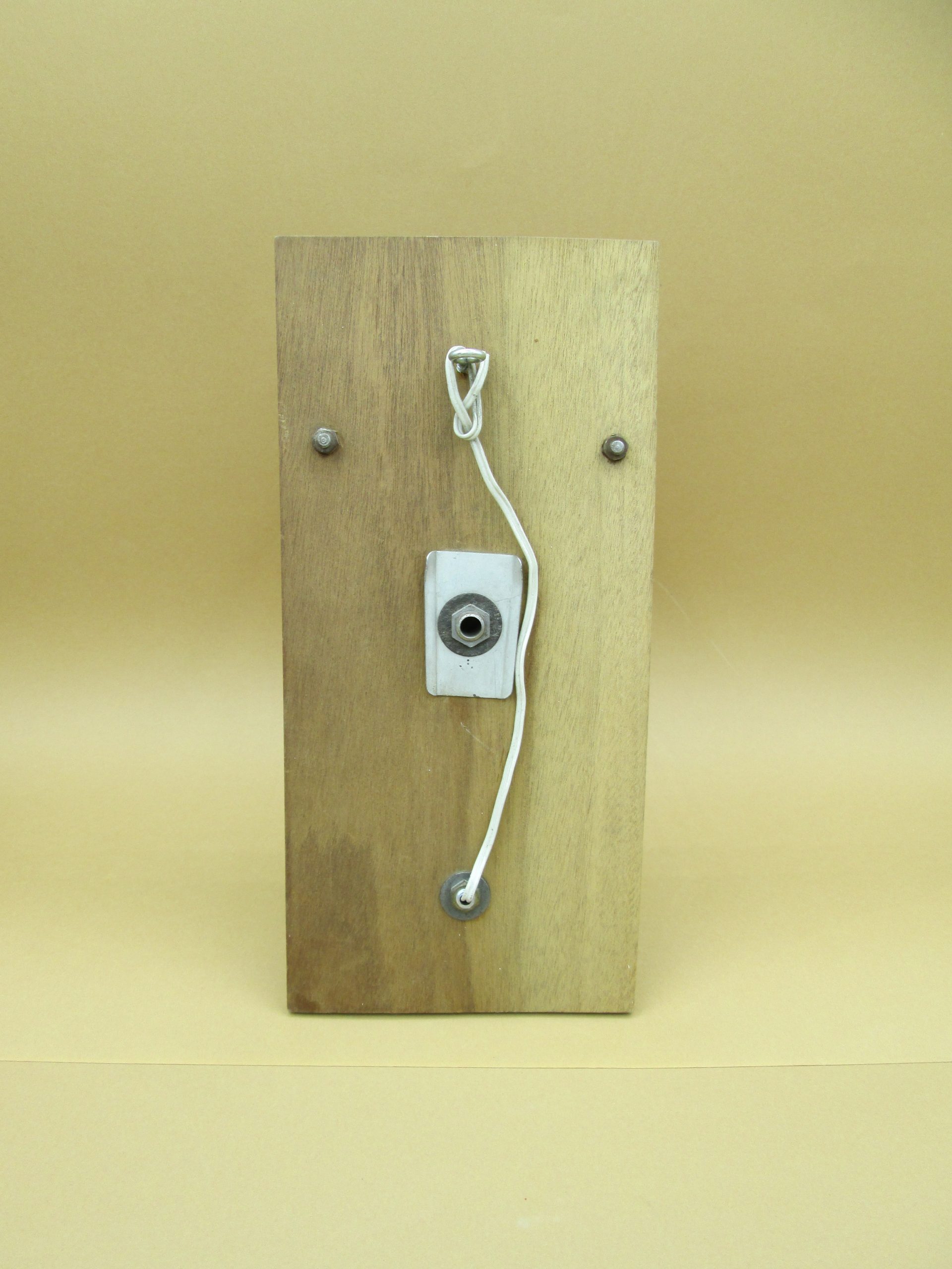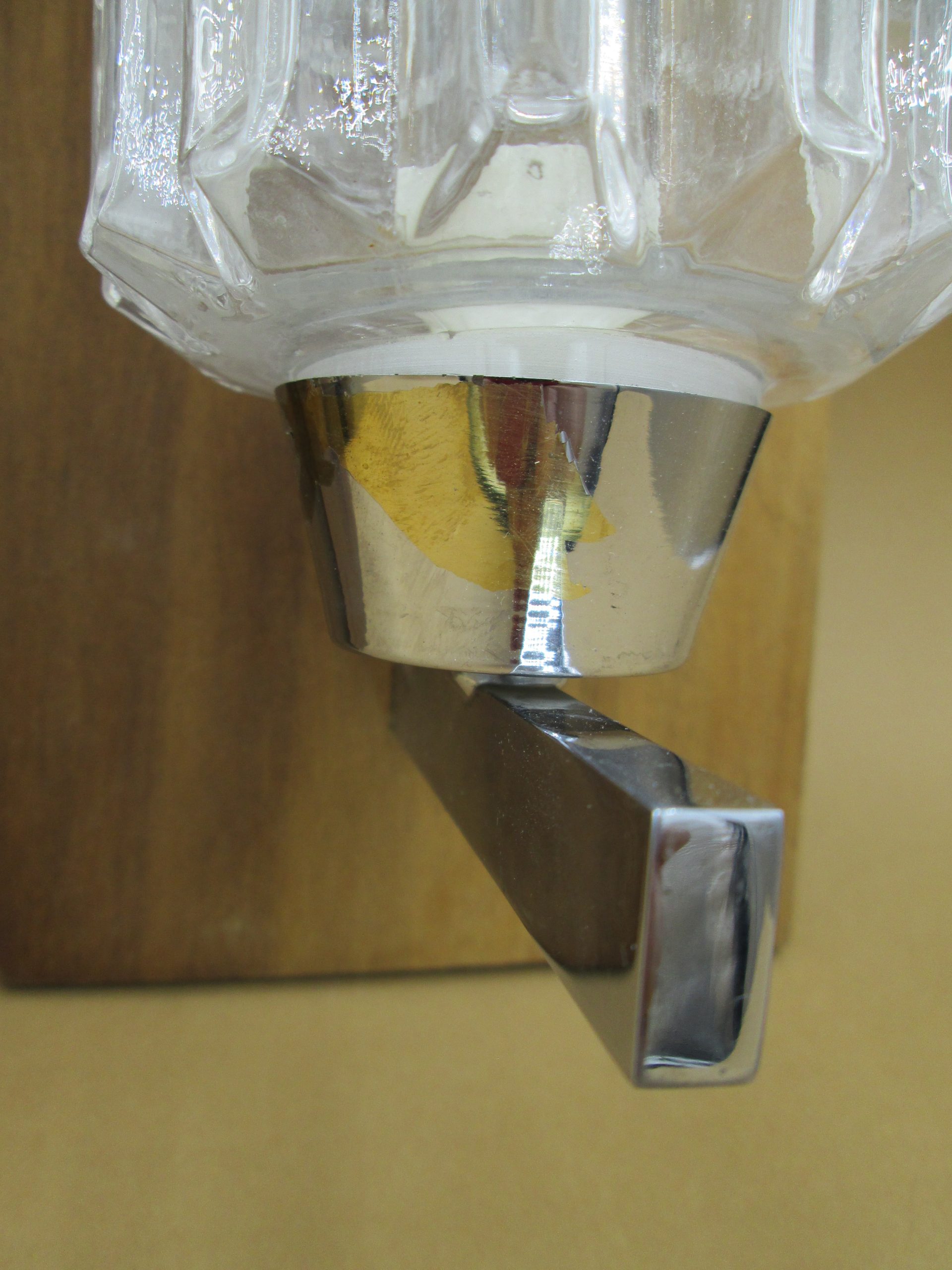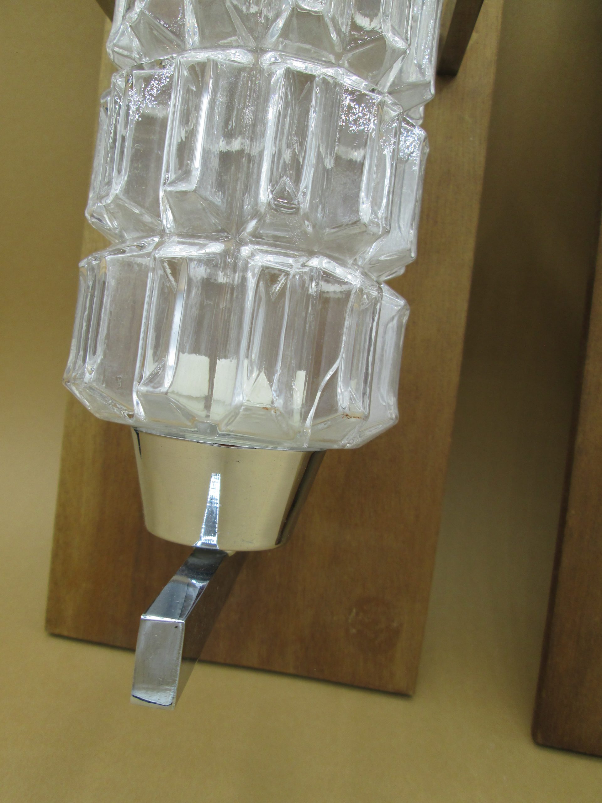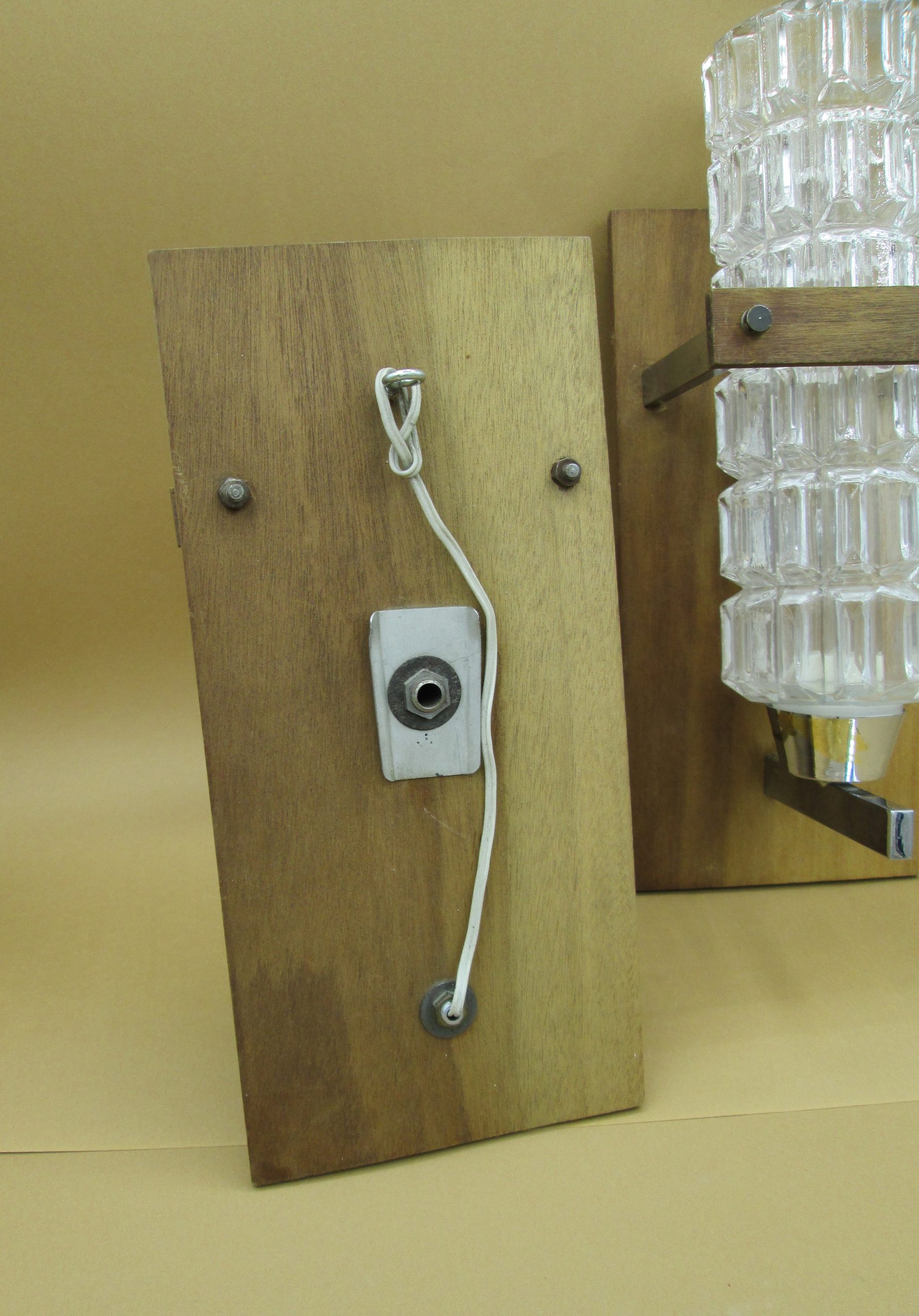 Pareja de apliques con base de madera y metal y tulipas de cristal prensado. Medidas de la base de madera: 27 cm x 12,5 cm. Altura de la tulipa de cristal 25 cm. Una tiene parcialmente levantado el cromado inferior como se puede apreciar en las fotos. Una de las tulipas tiene una pequeña grieta en su parte inferior como se aprecia en las fotos.