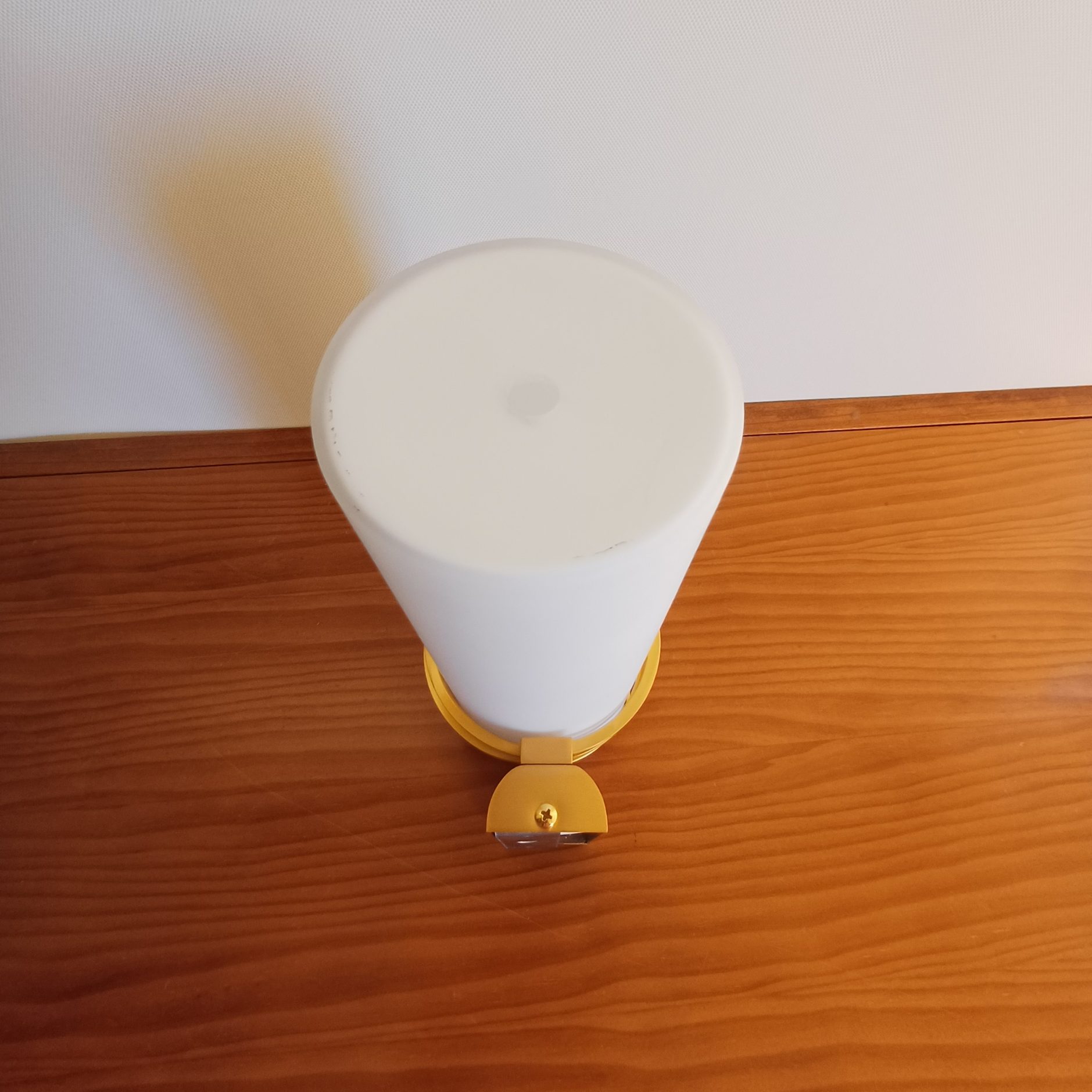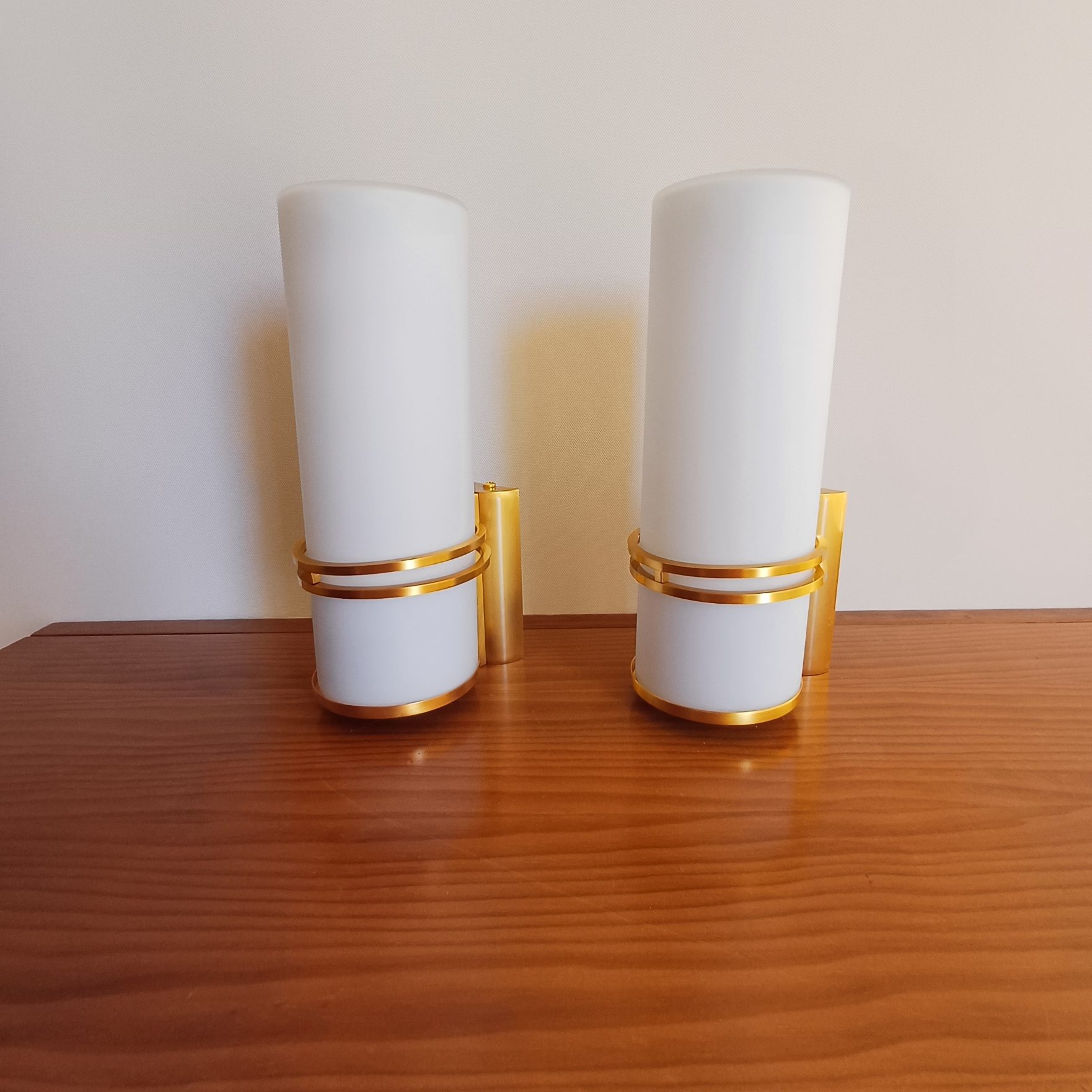 Pareja de apliques con base de metal dorado mate y tulipas de cristal blanco mate en forma de cilindro. Nuevos a estrenar. Altura: 26,5 cm. Diámetro de la tulipa: 9 cm. Profundidad desde la pared: 12 cm.