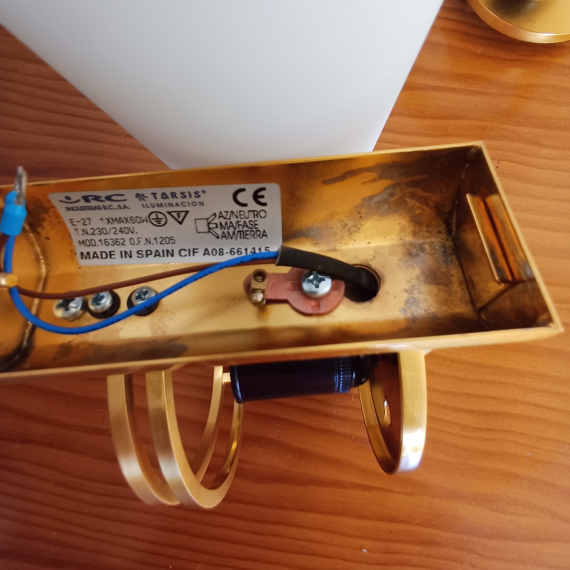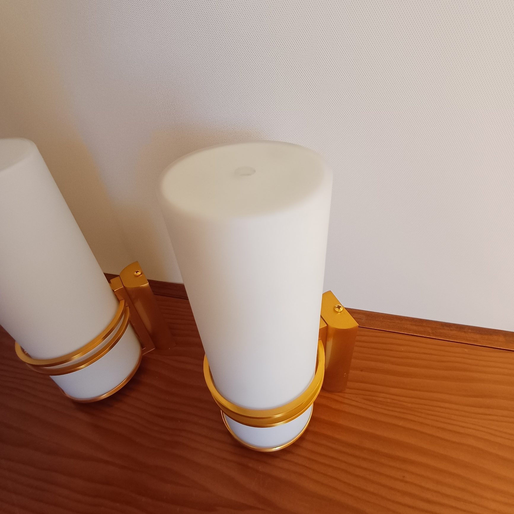 Pareja de apliques con base de metal dorado mate y tulipas de cristal blanco mate en forma de cilindro.