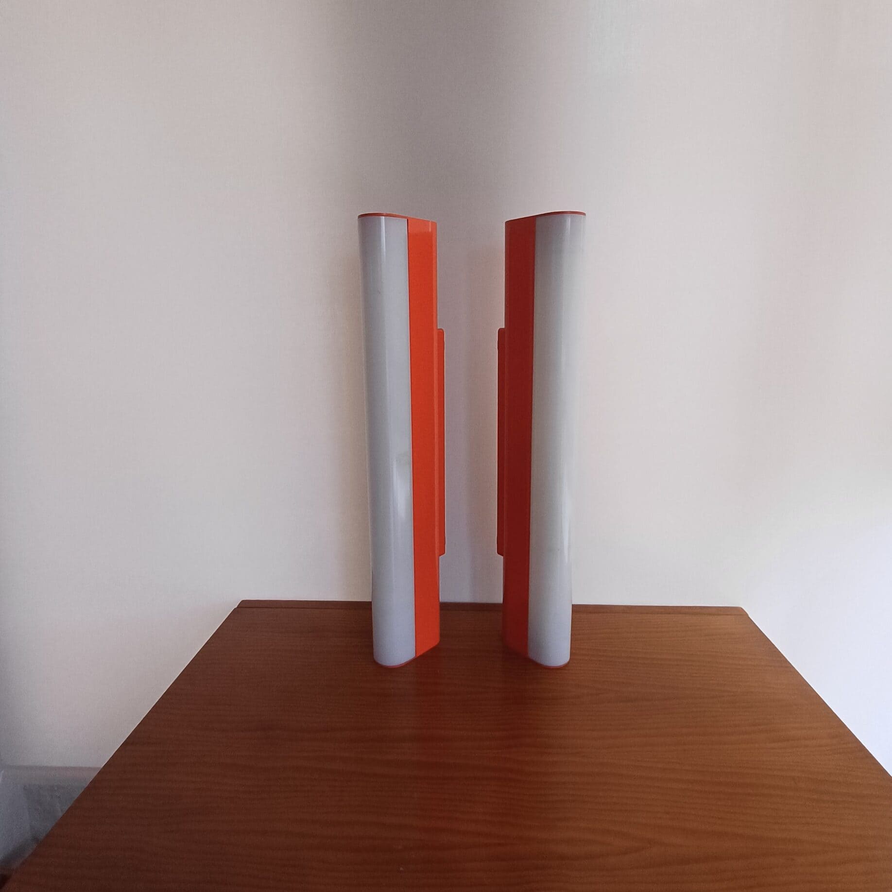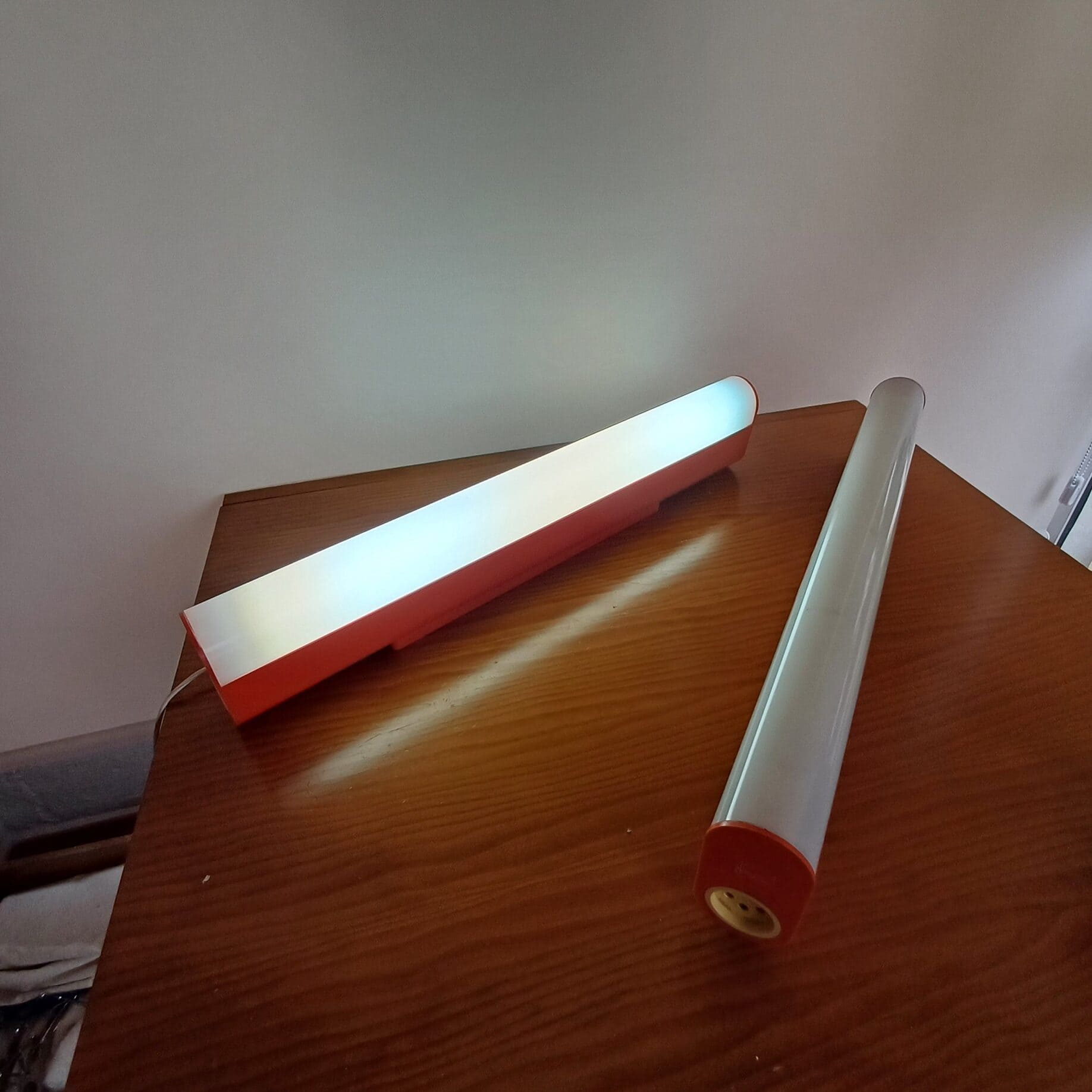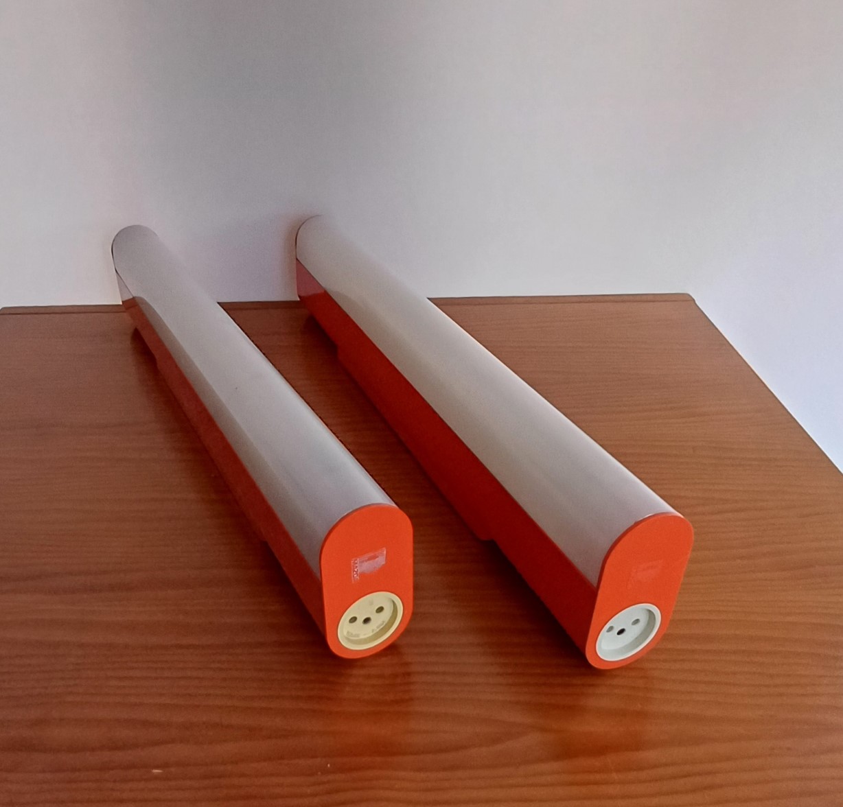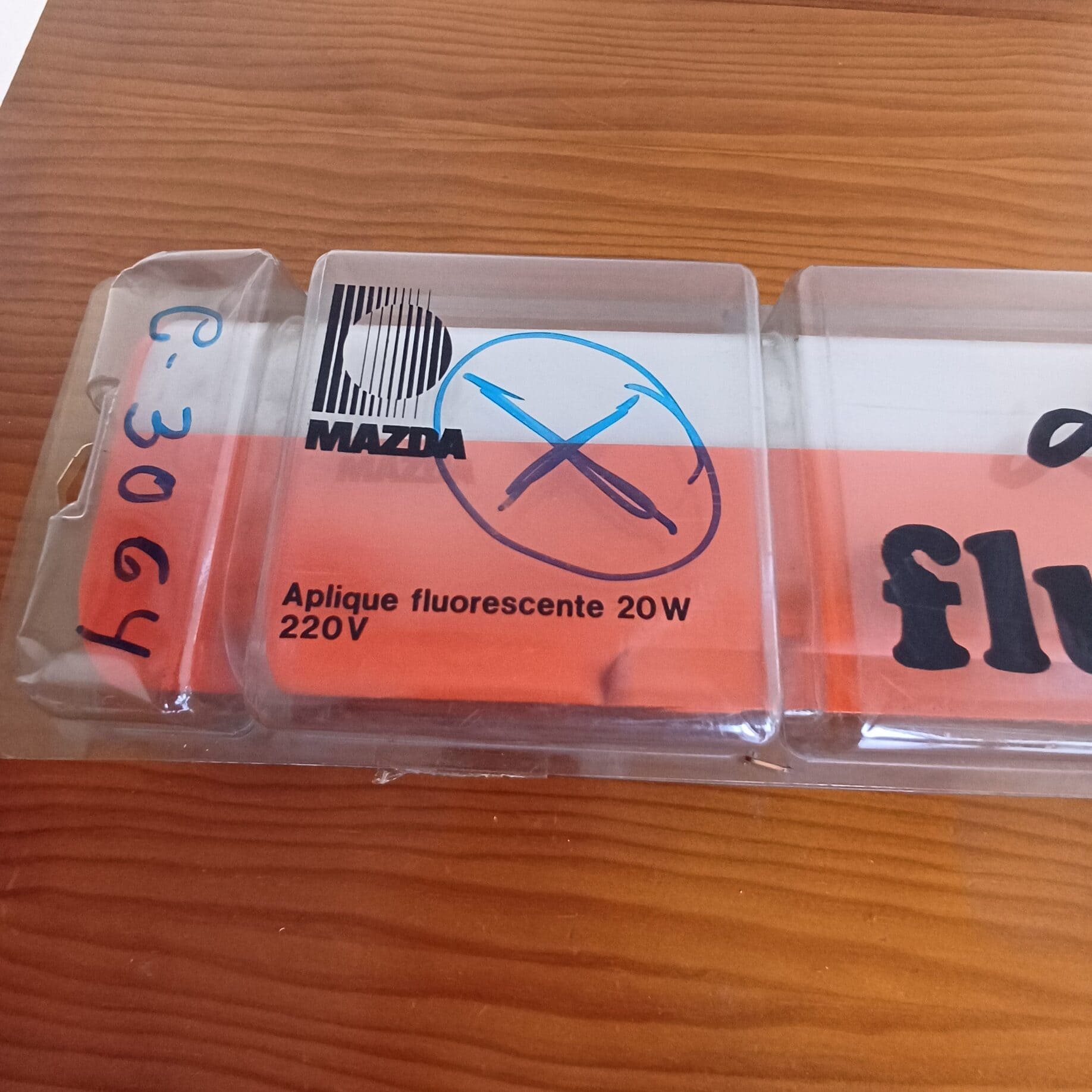 Pareja de apliques de tubos fluorescentes ‘Lady Fluorette’ de Mazda, con interruptor y enchufes integrados. 20w. Para instalar en el techo o en la pared. Nuevos a estrenar. Uno de ellos aún conserva su envoltorio original. Medidas: 63 cm de largo x 12 cm de alto x 6 cm de ancho.