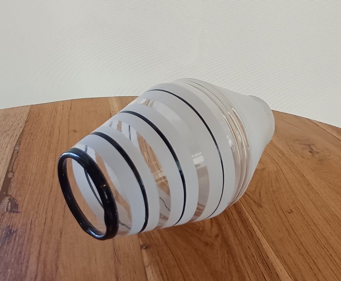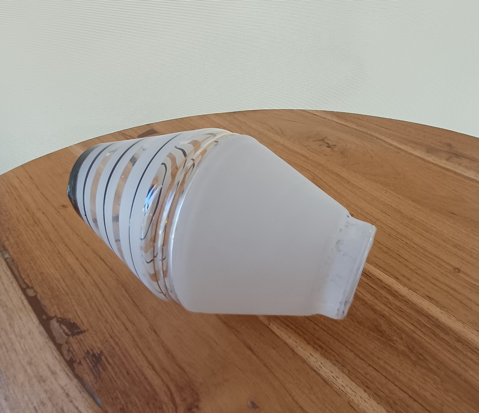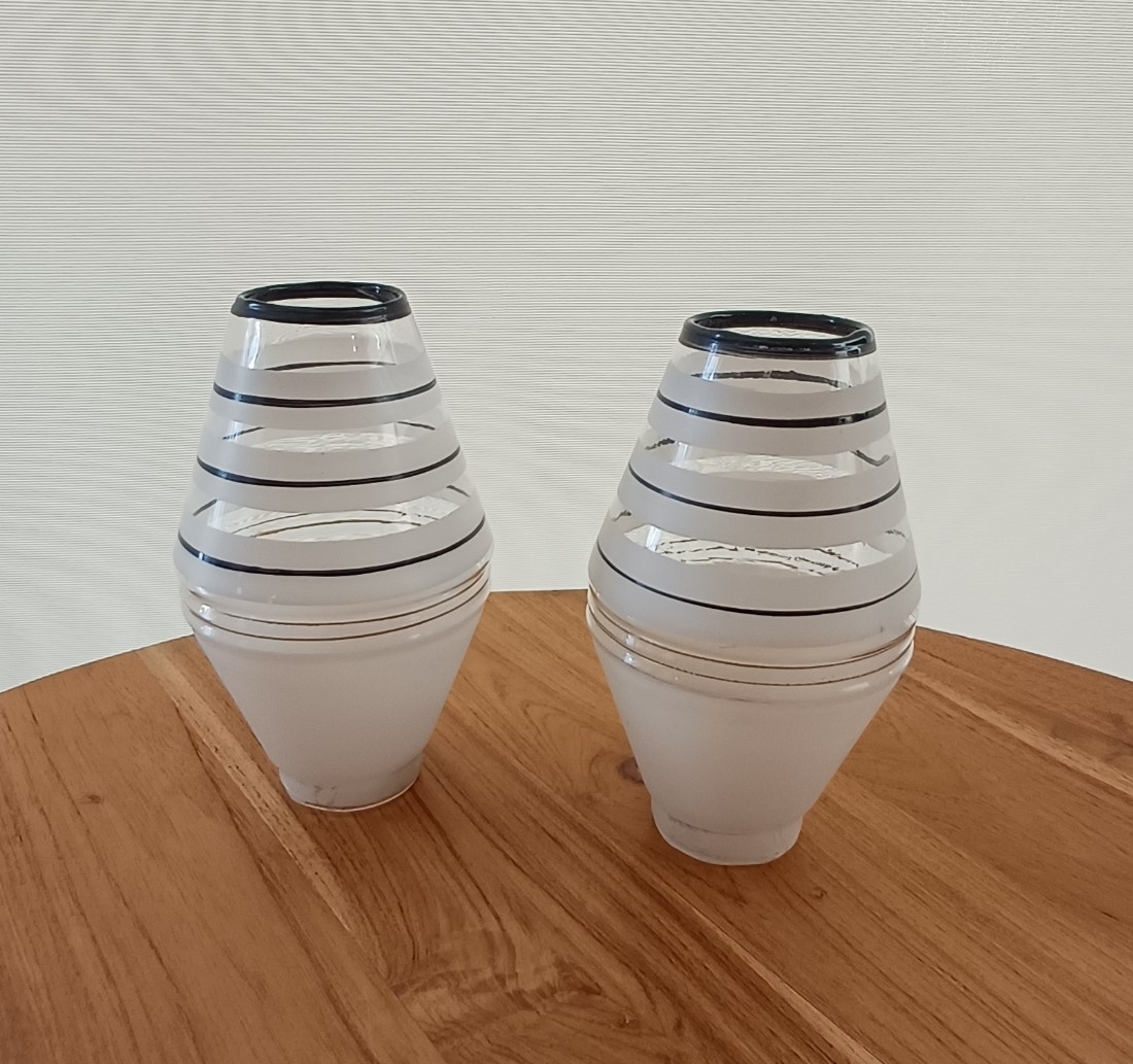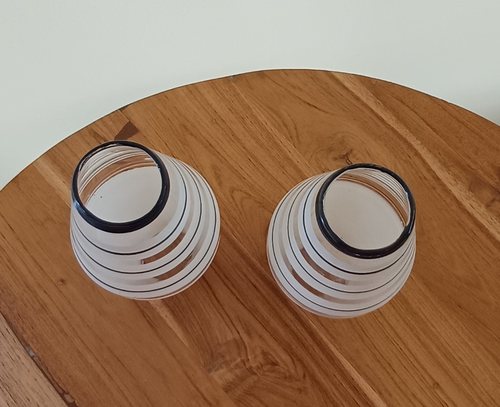 Elegante pareja de tulipas de vidrio. Ideales para dar un toque vintage a tu hogar. - Diseño geométrico con líneas blancas, negras y doradas. - Forma de rombo, estilizada y elegante. - Ideales para apliques o lámpara de techo. - Perfecto estado. Medidas: 15 cm de altura, 8,5 cm de diámetro por la parte más ancha, 3,7 de boca (interior), 4,2 cm de boca (exterior).