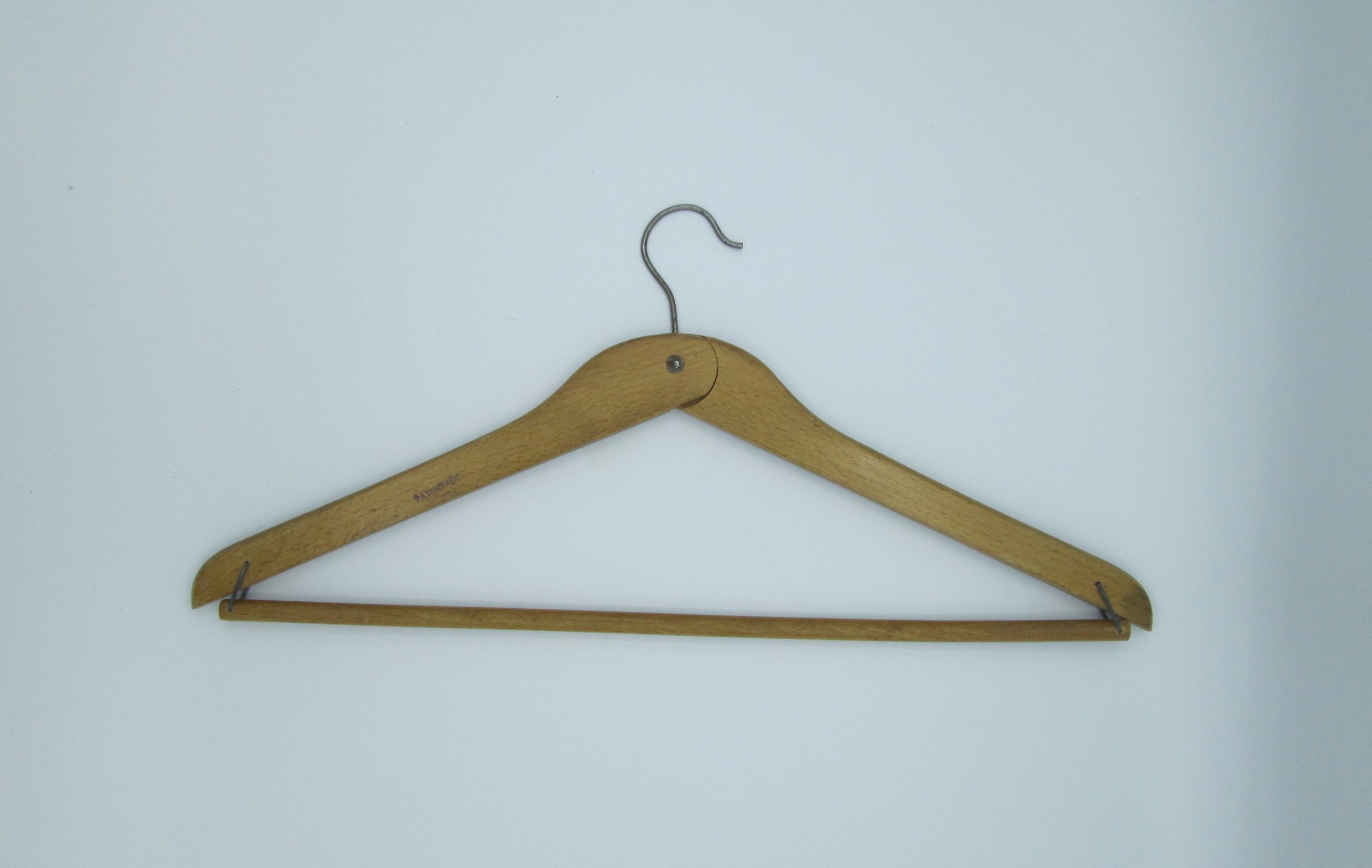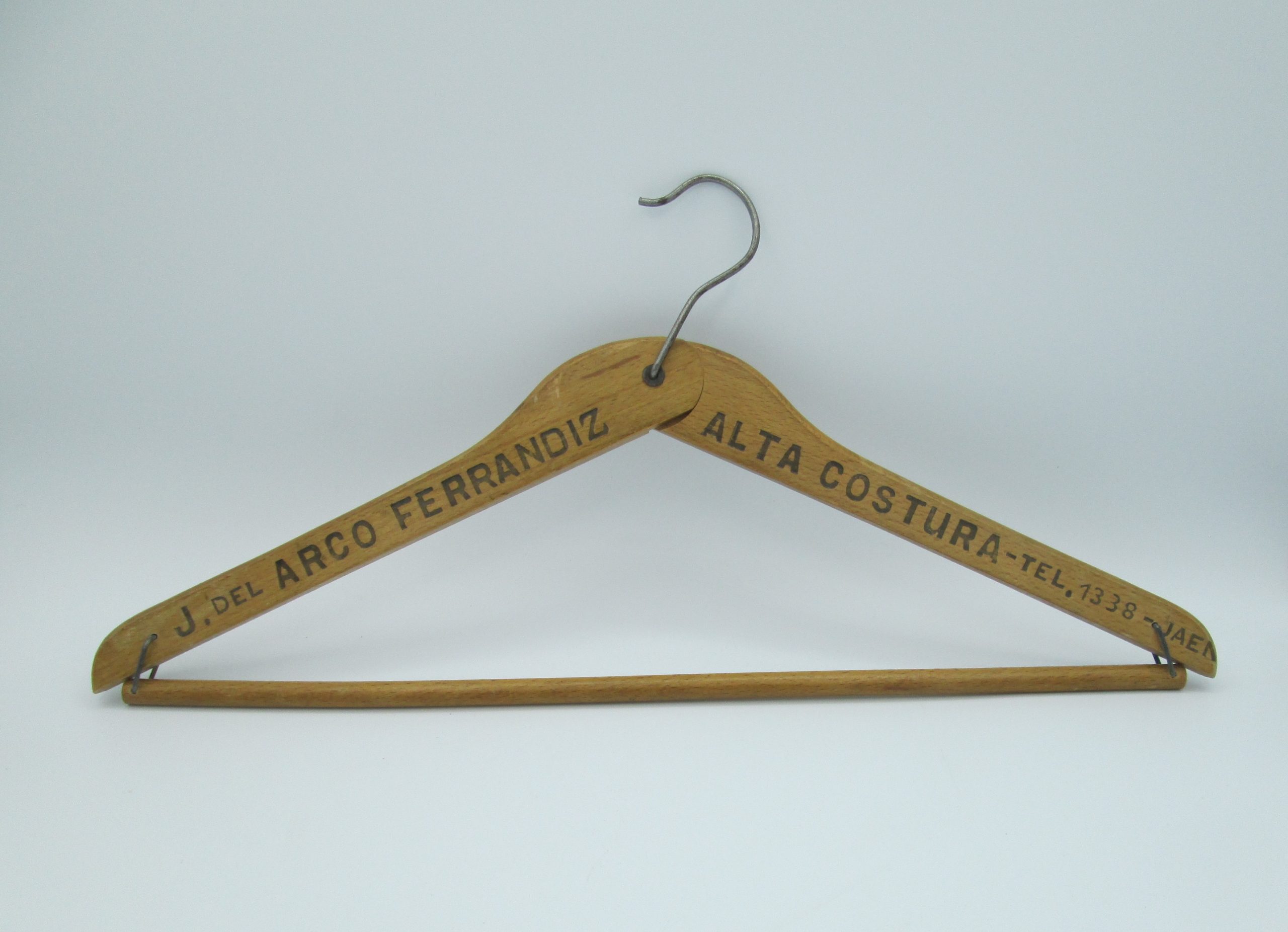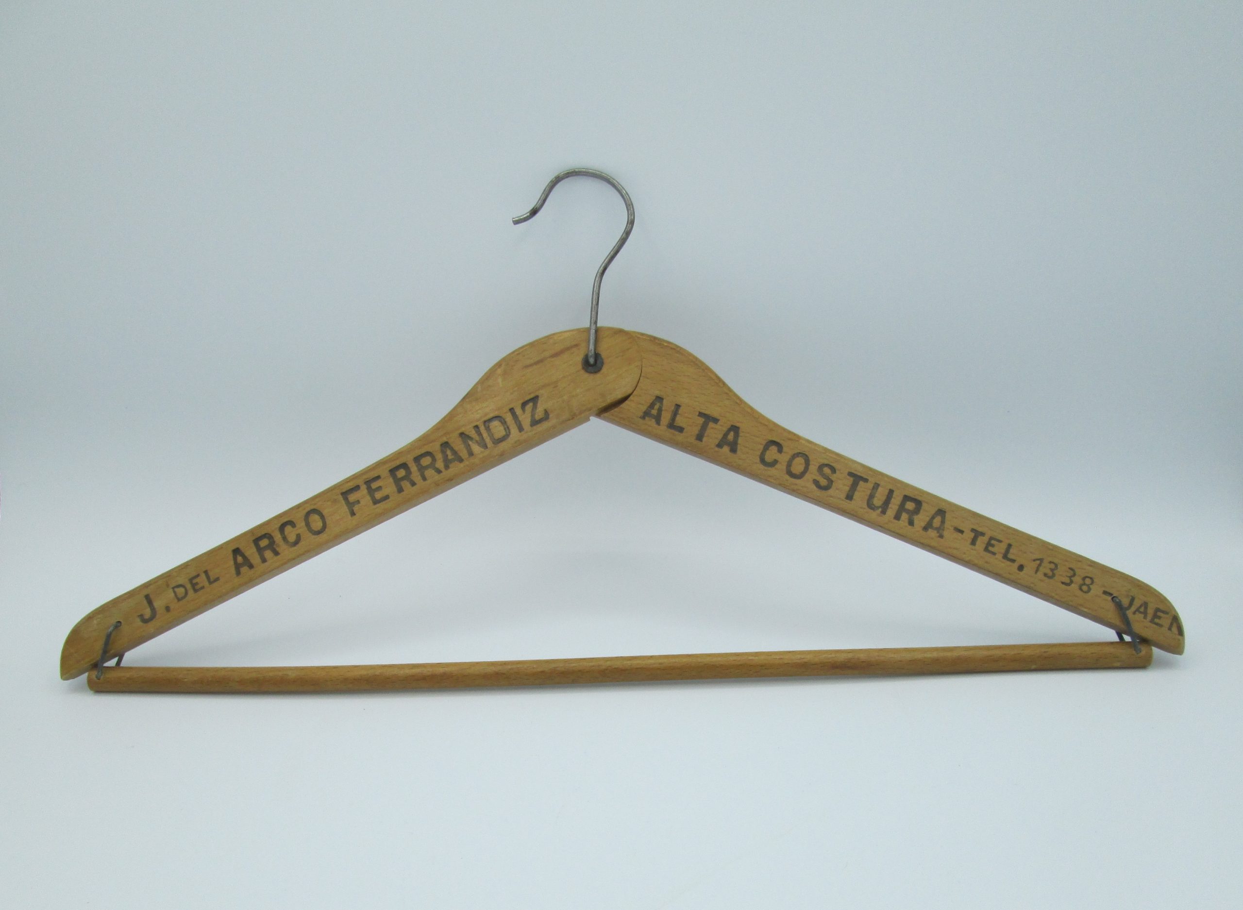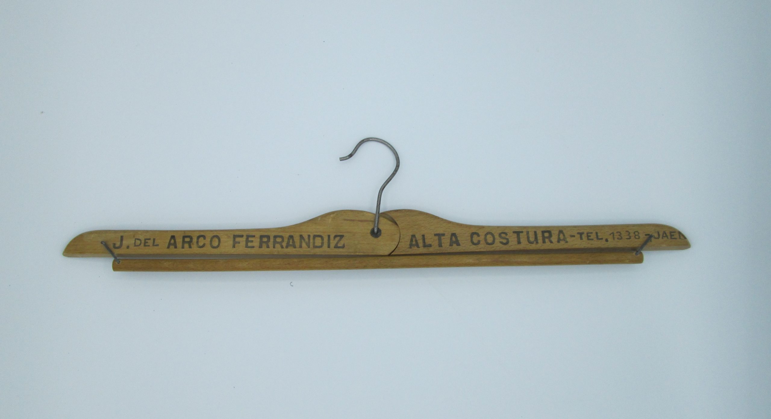 Percha de madera plegable procedente de la sastrería de J. del Arco Ferrandiz de Jaén. Años 40. Medidas desplegada: 20,5 cm de alta, 43,5 cm de larga, 1 cm de grosor.
