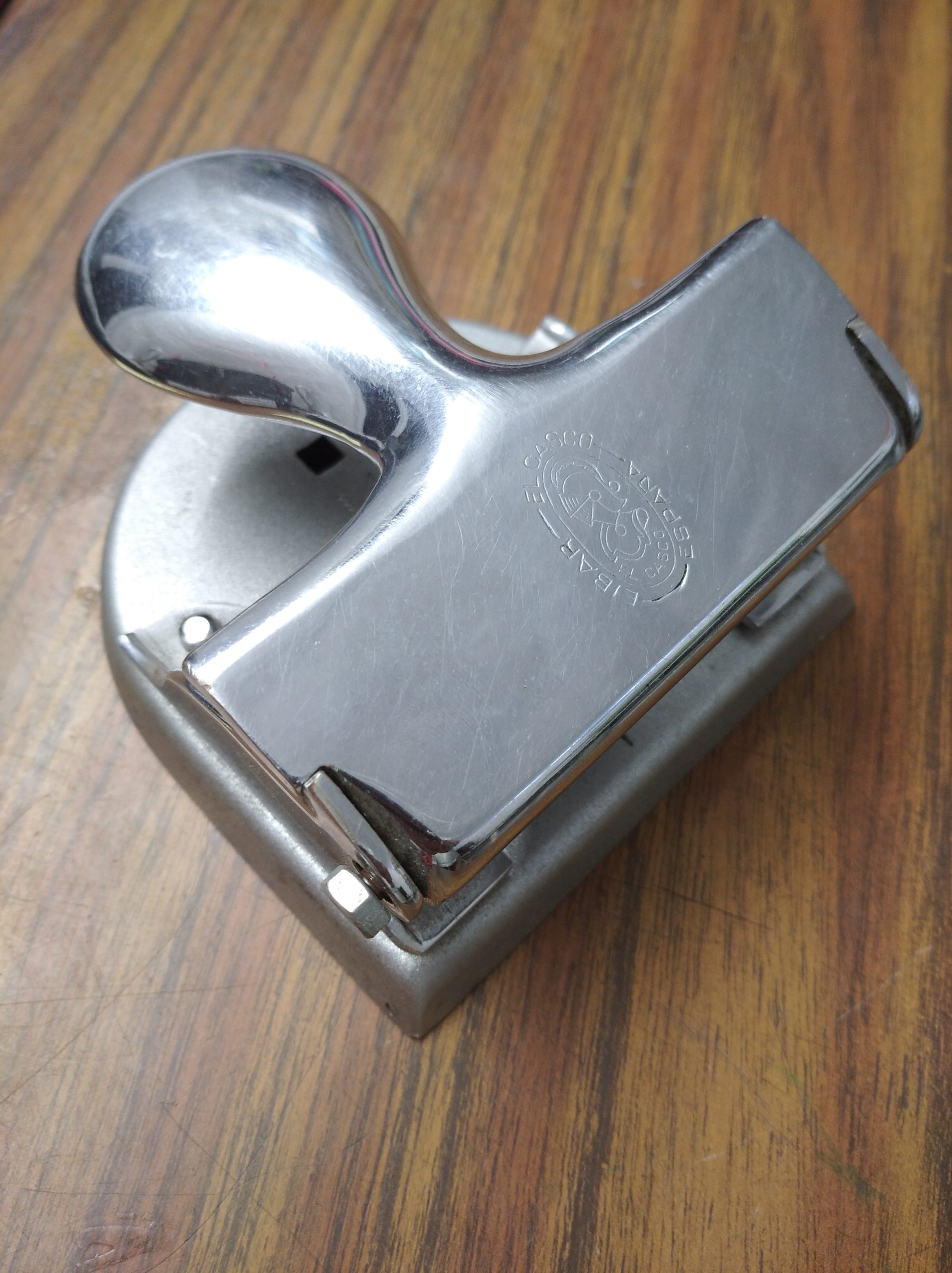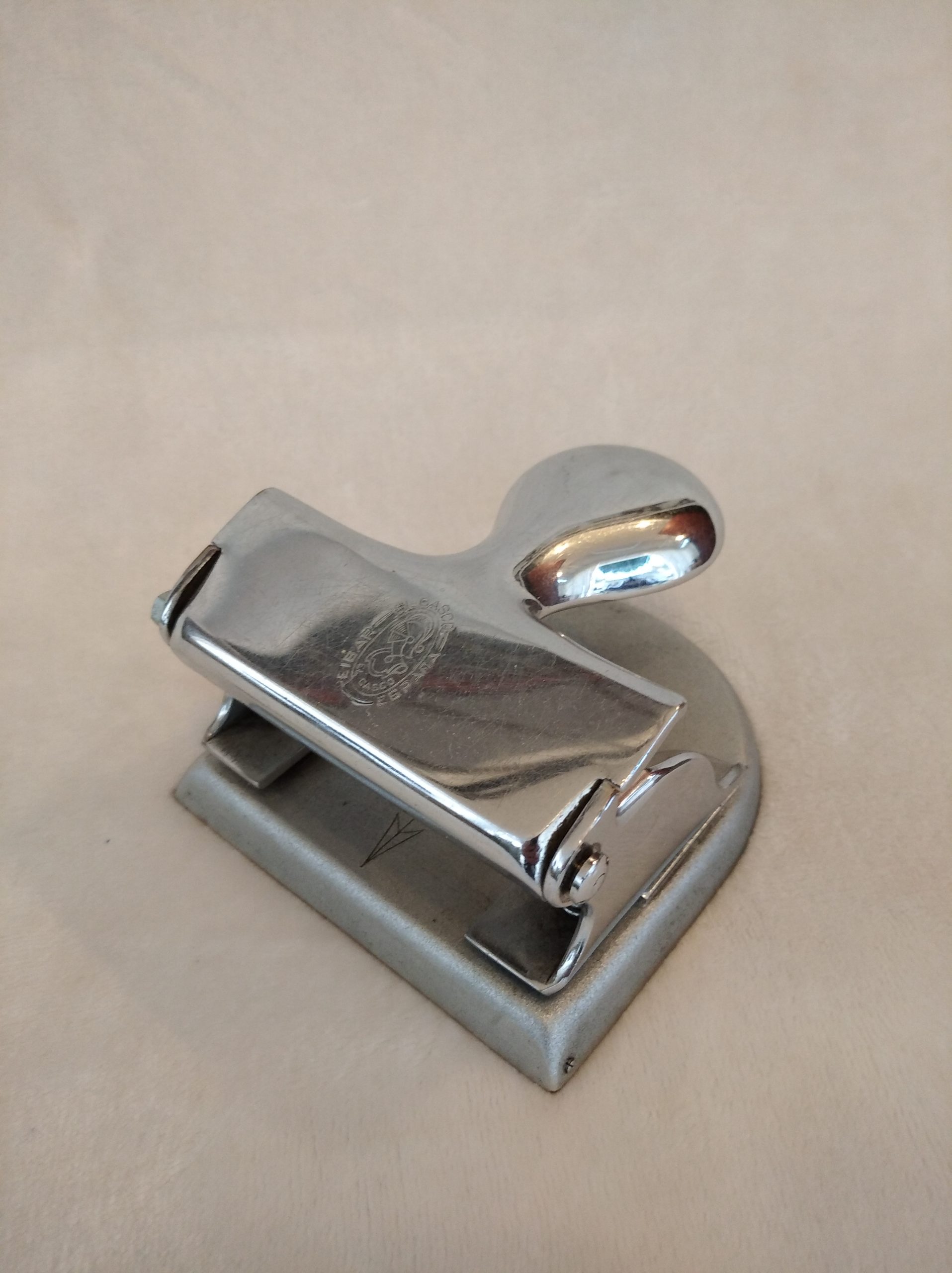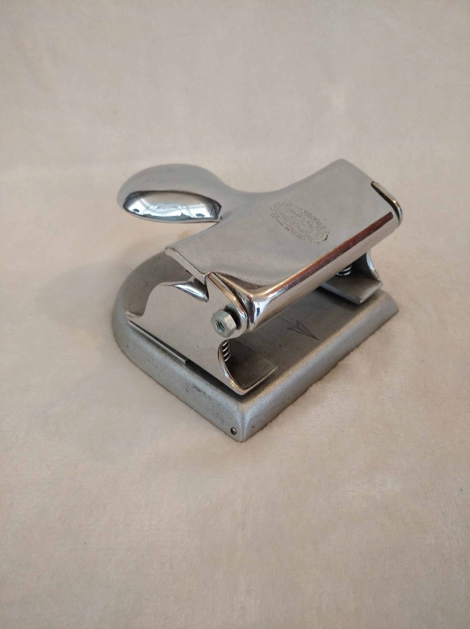 Perforadora de papel marca 'El Casco'. Años '70. Funciona correctamente, pero falta la pestaña que cierra la tapa inferior donde se recoge el papel cortado. Medidas: 12 x 10,5 x 6,5 cms.