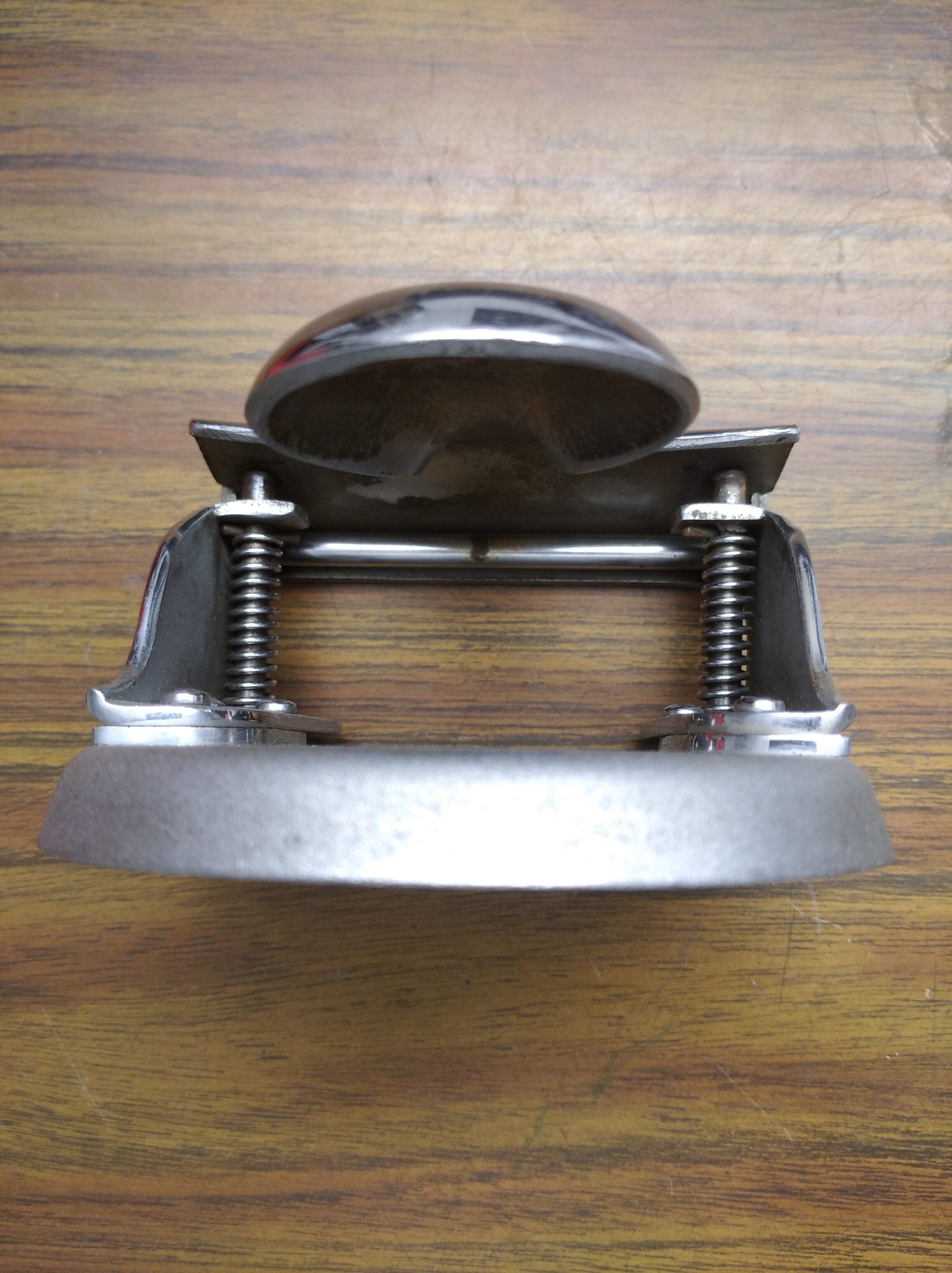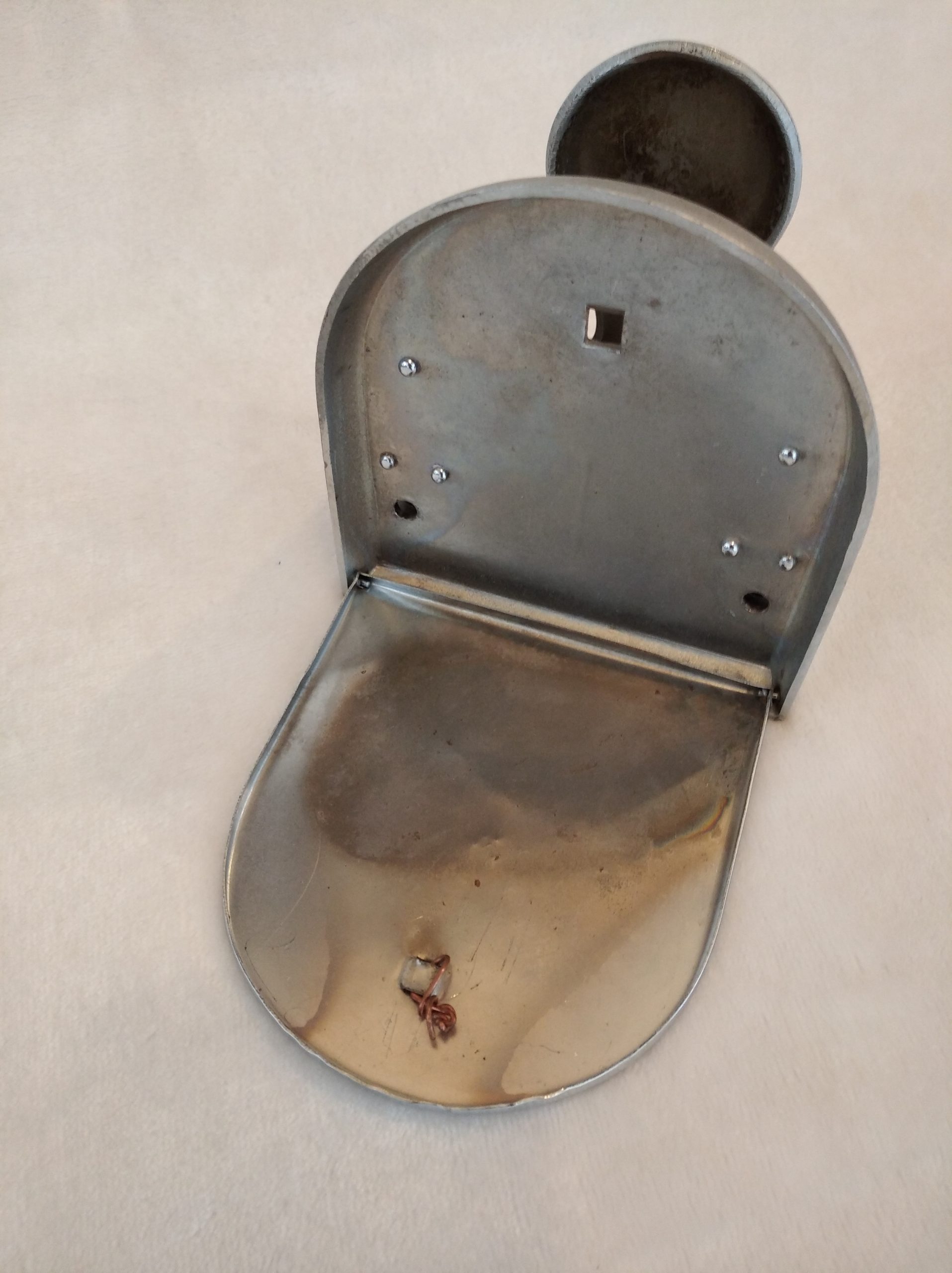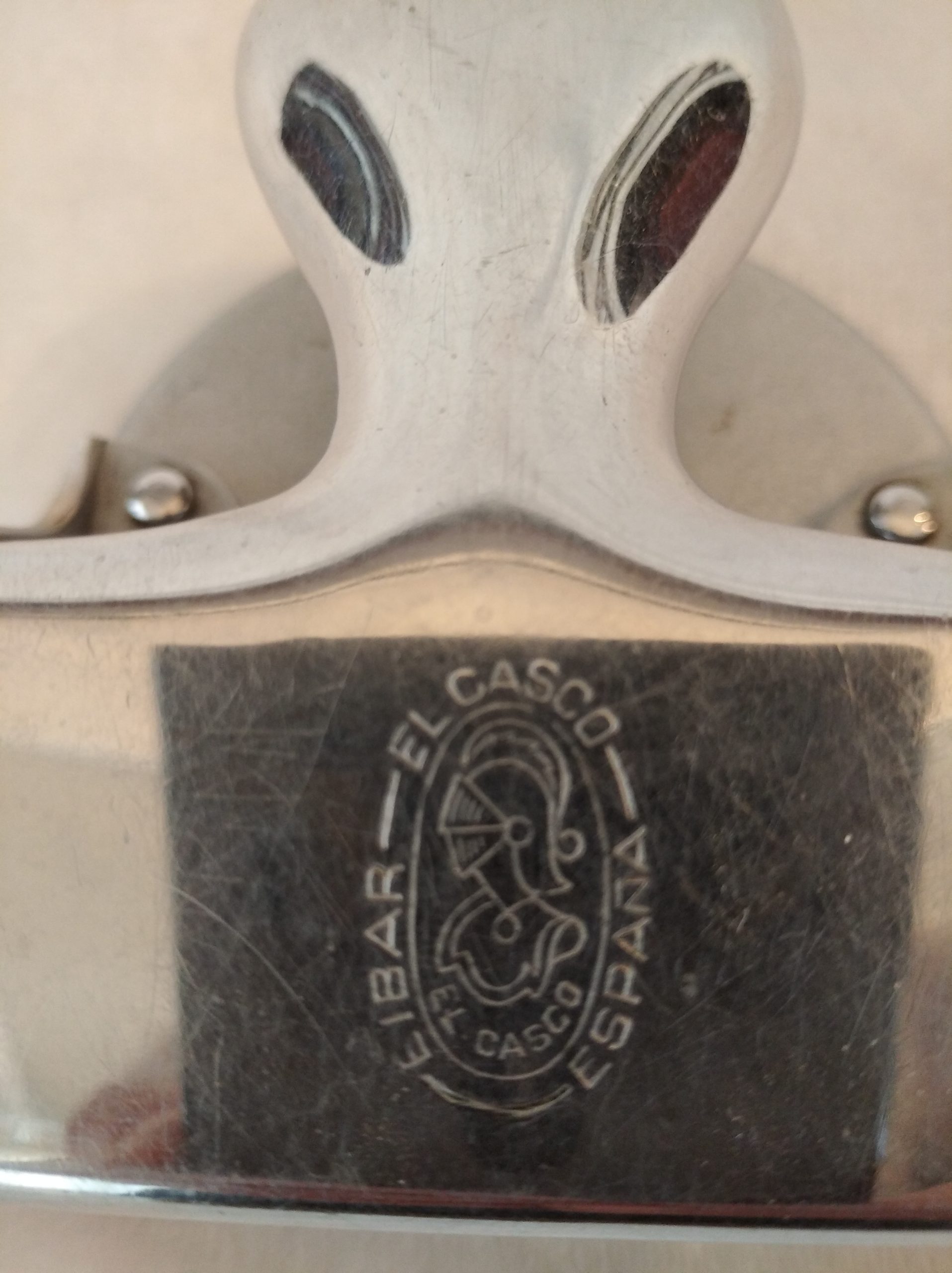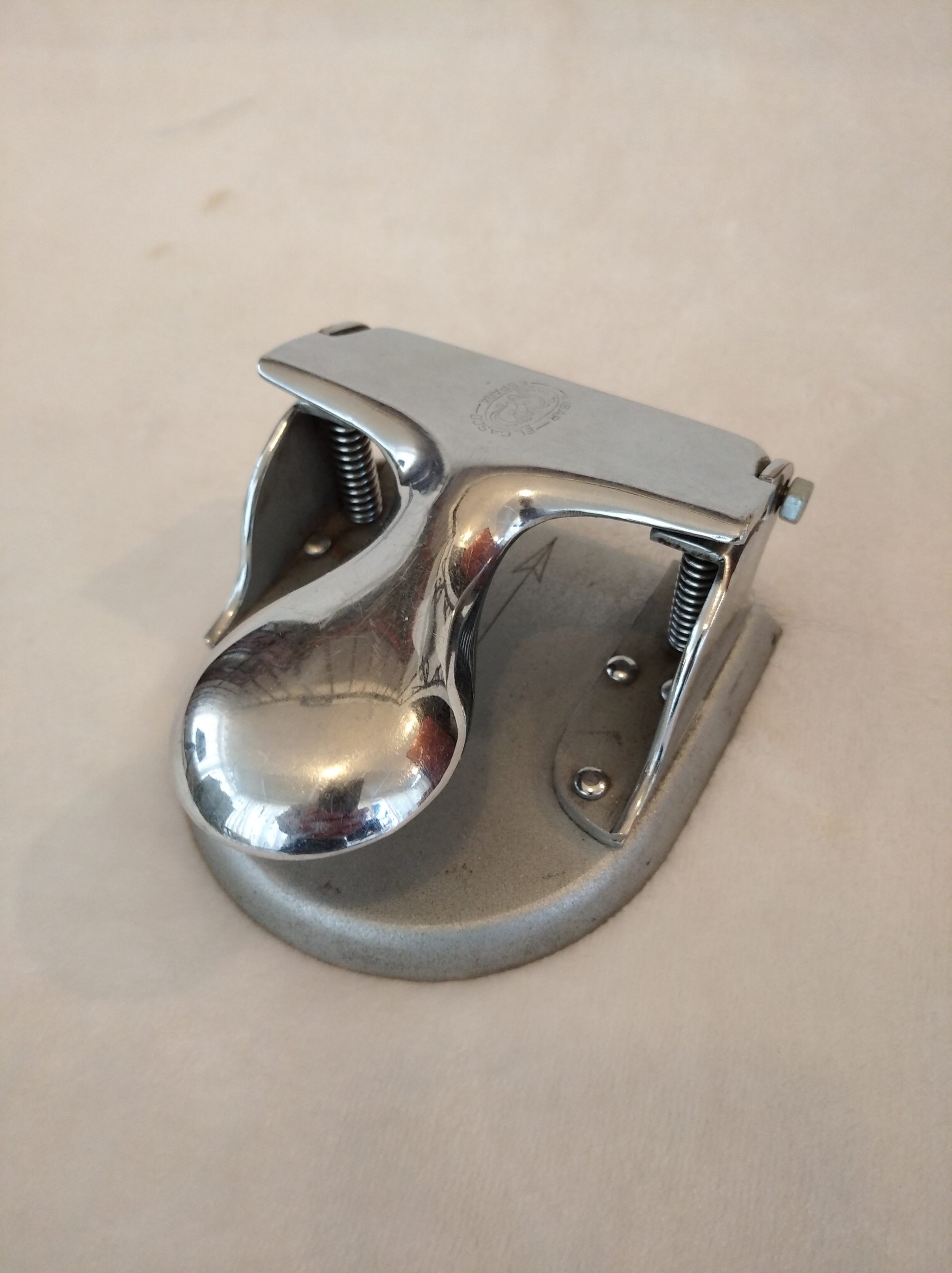 Perforadora de papel marca 'El Casco'. Años '70. Funciona correctamente, pero falta la pestaña que cierra la tapa inferior donde se recoge el papel cortado. Medidas: 12 x 10,5 x 6,5 cms.